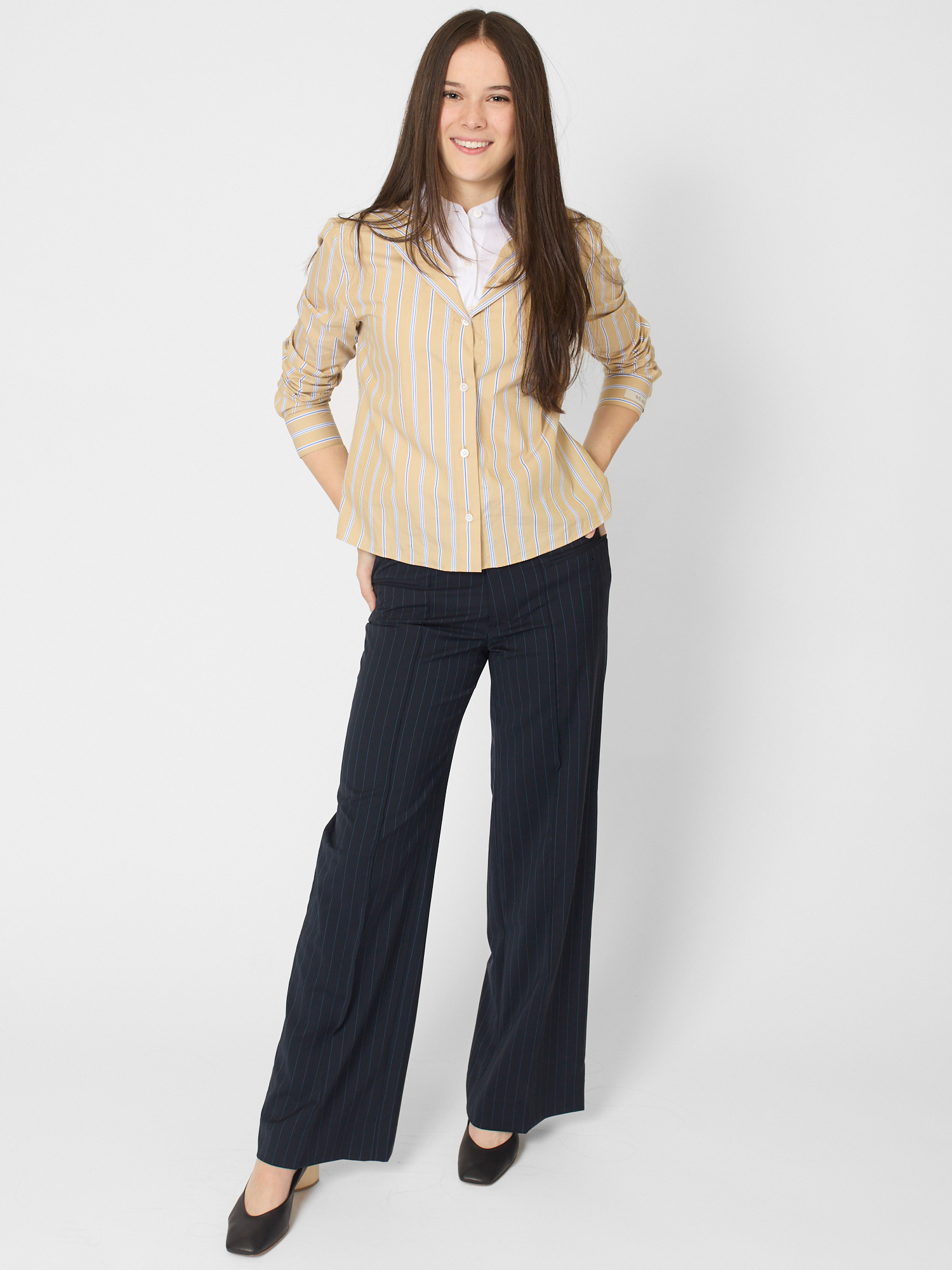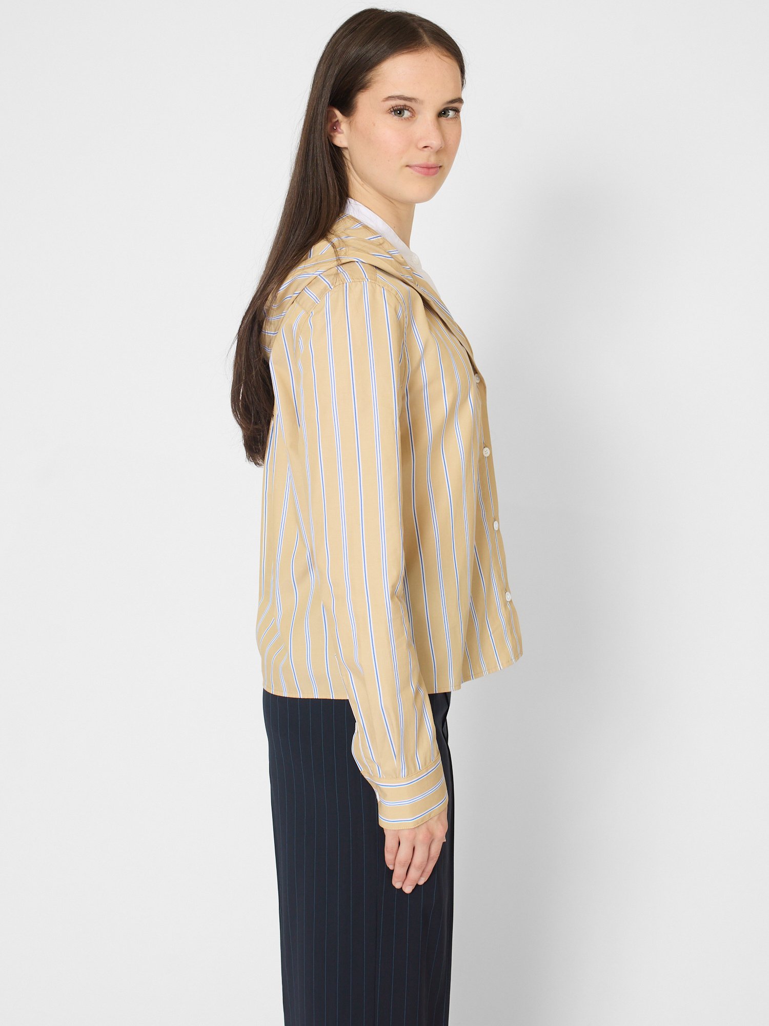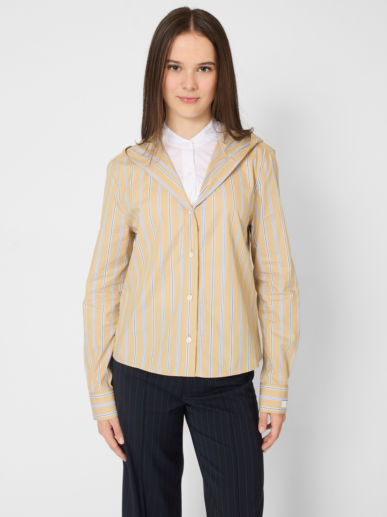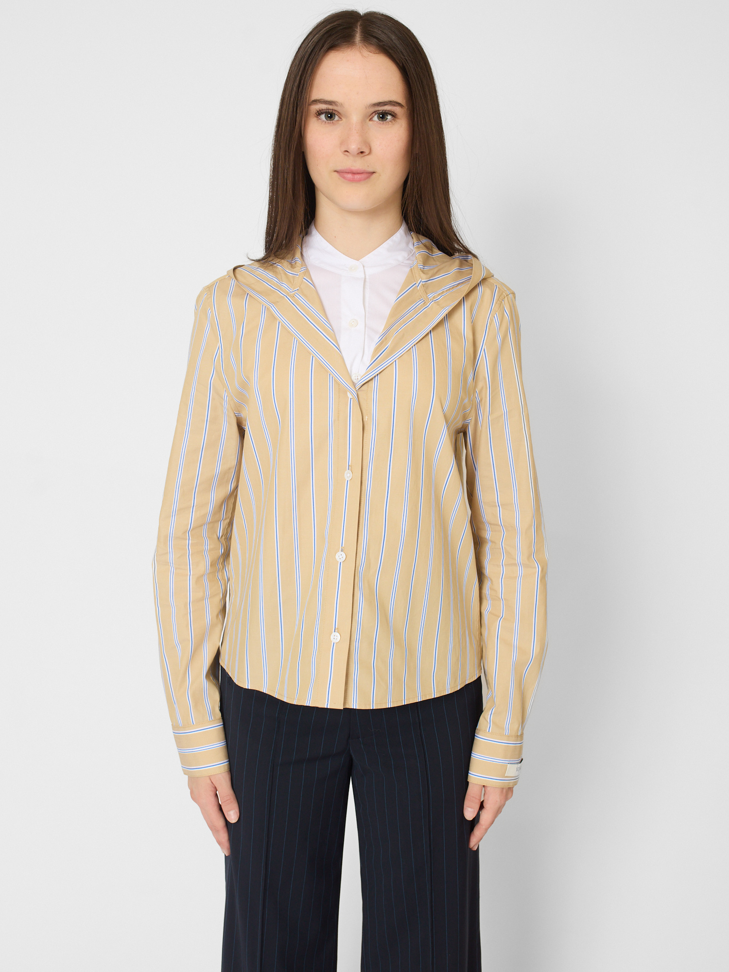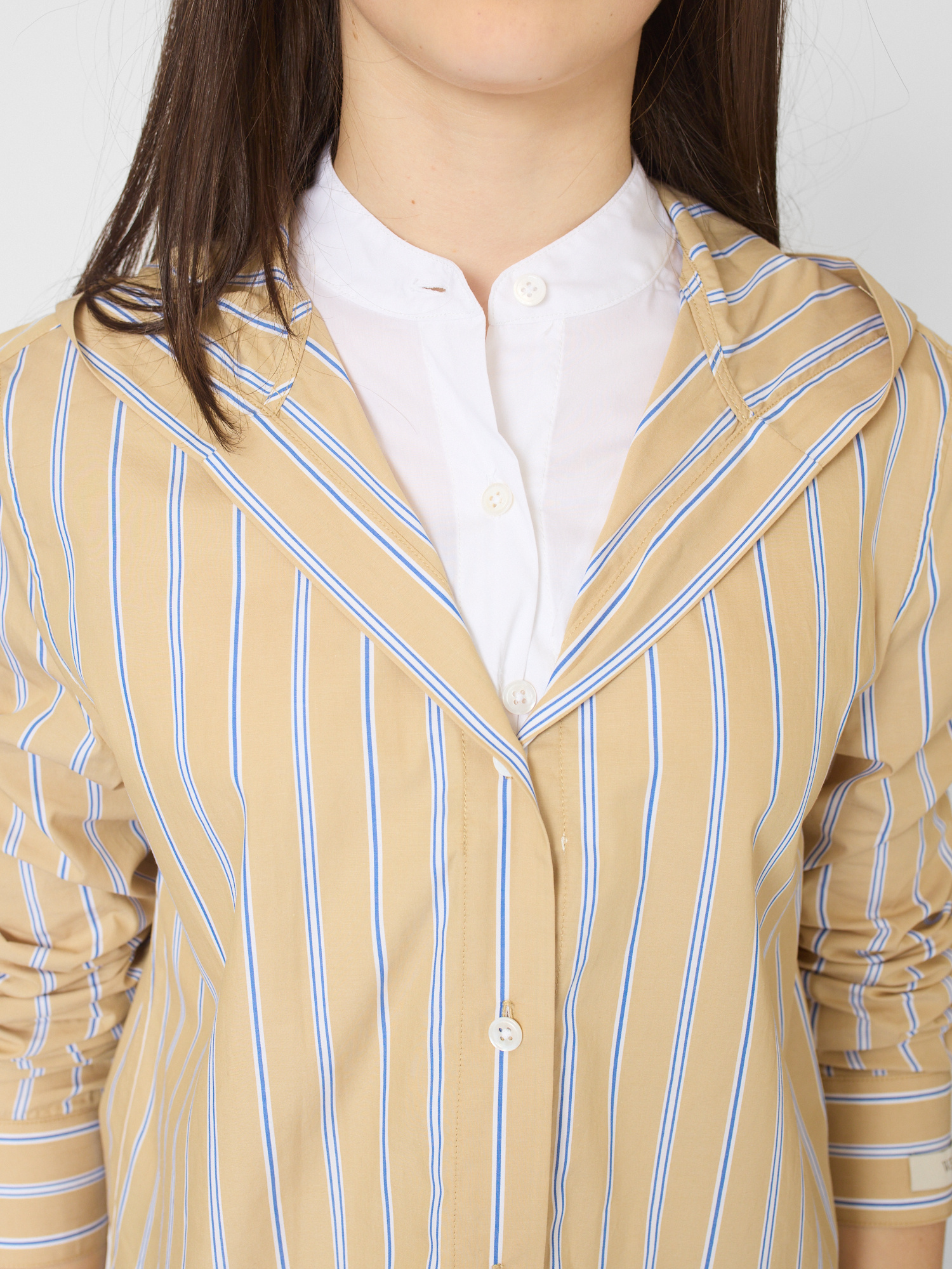 Double-layer crisp shirt features a white stand collar in a layer with a structural V-neck stripe hooded outer shell.