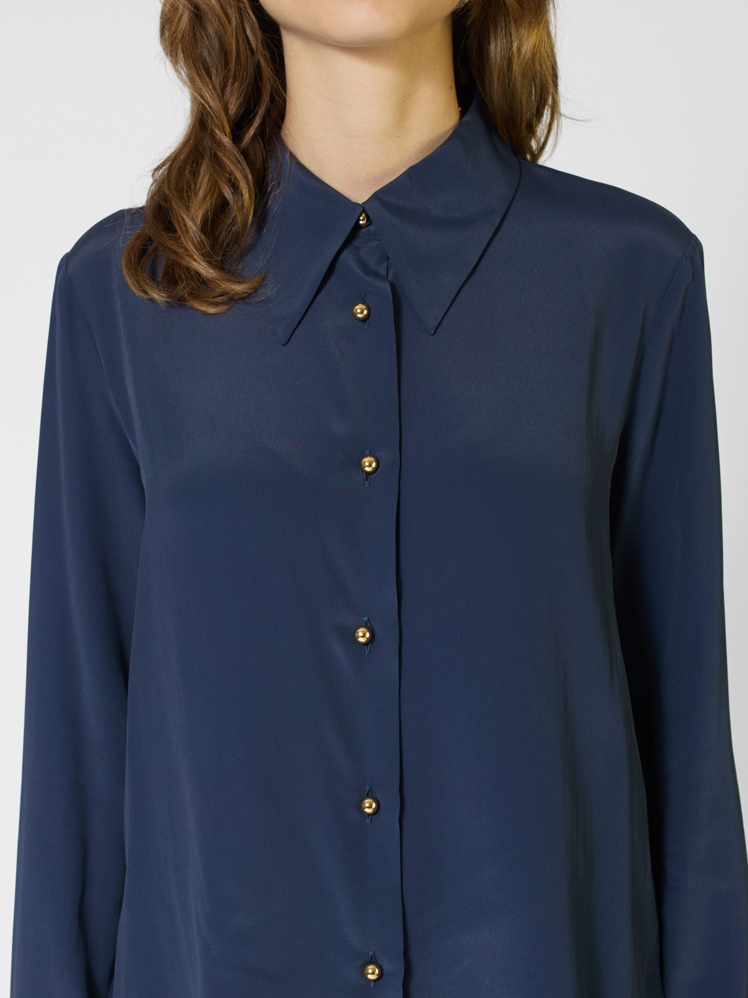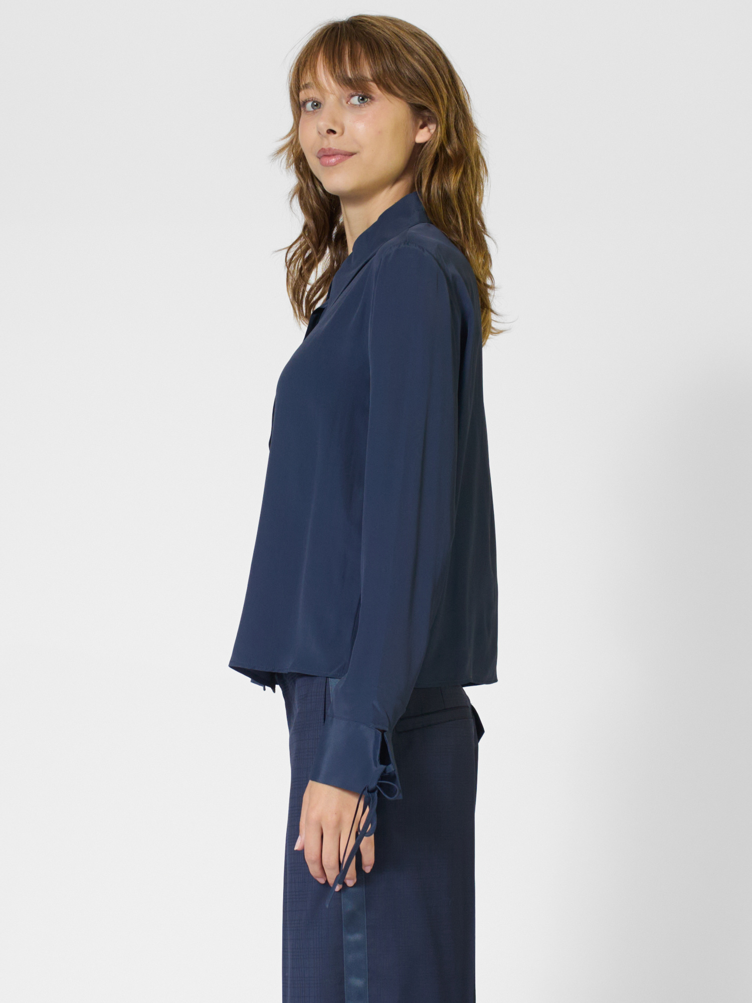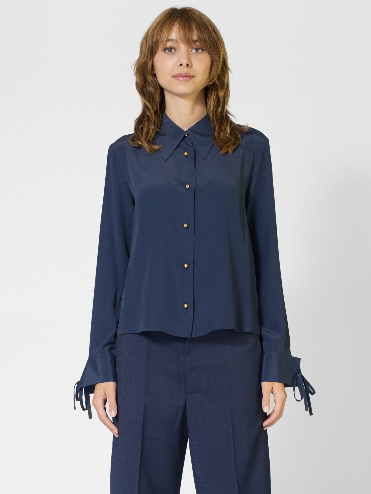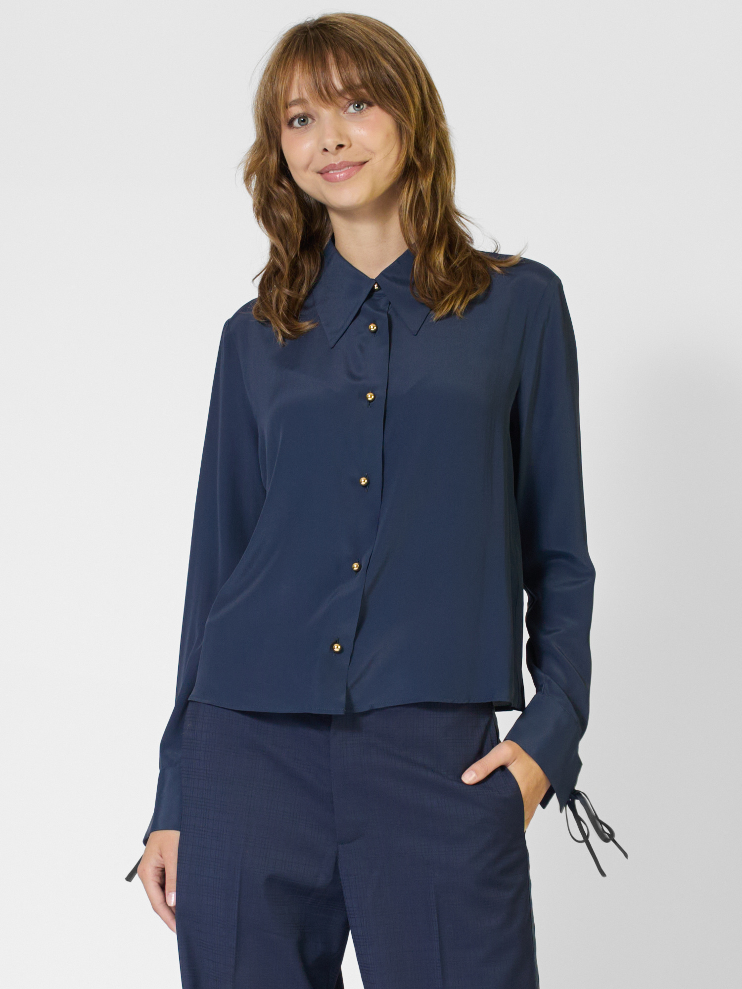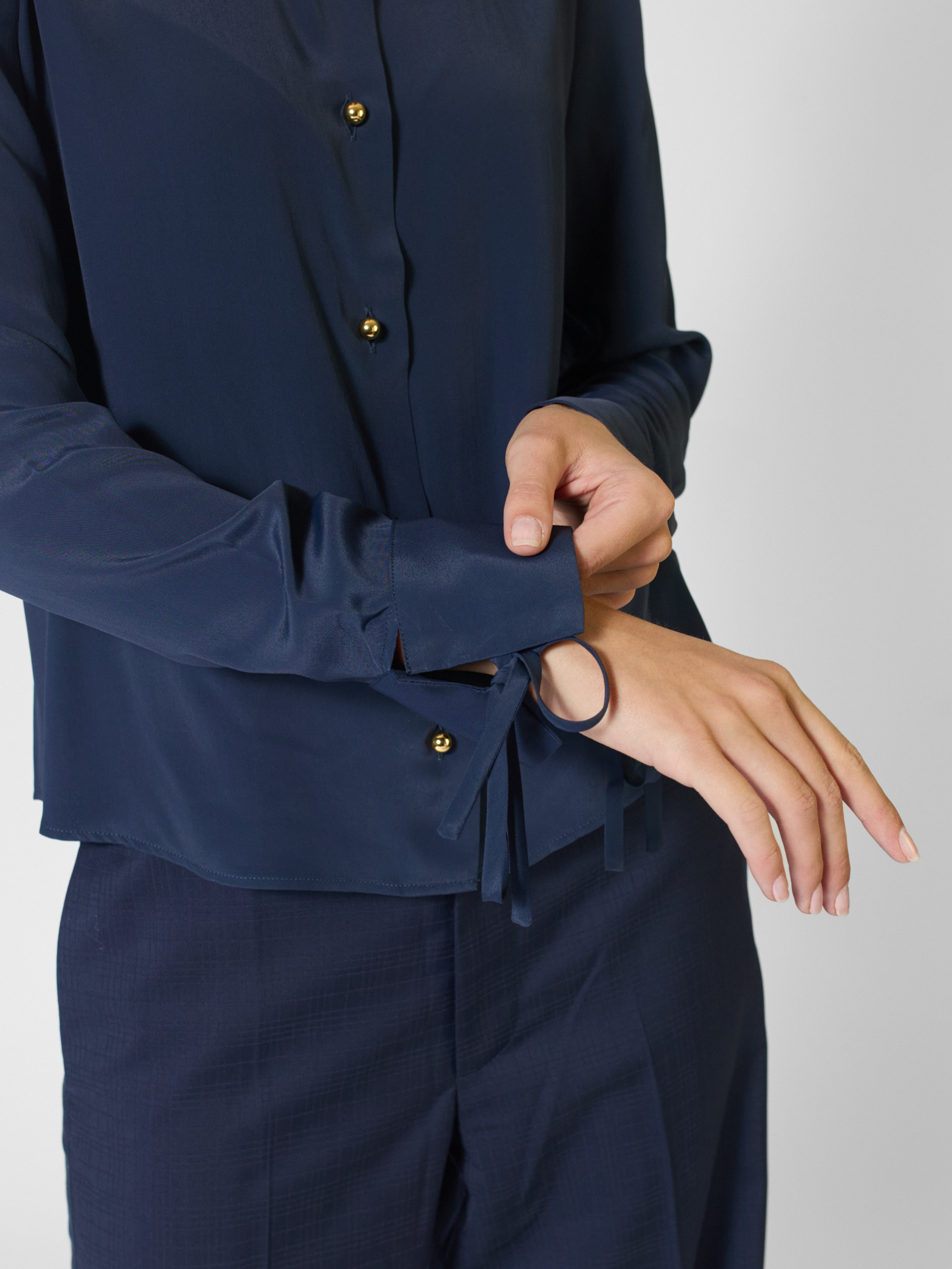 The silk crepe blouse has tie details at the cuffs and bold gold buttons.