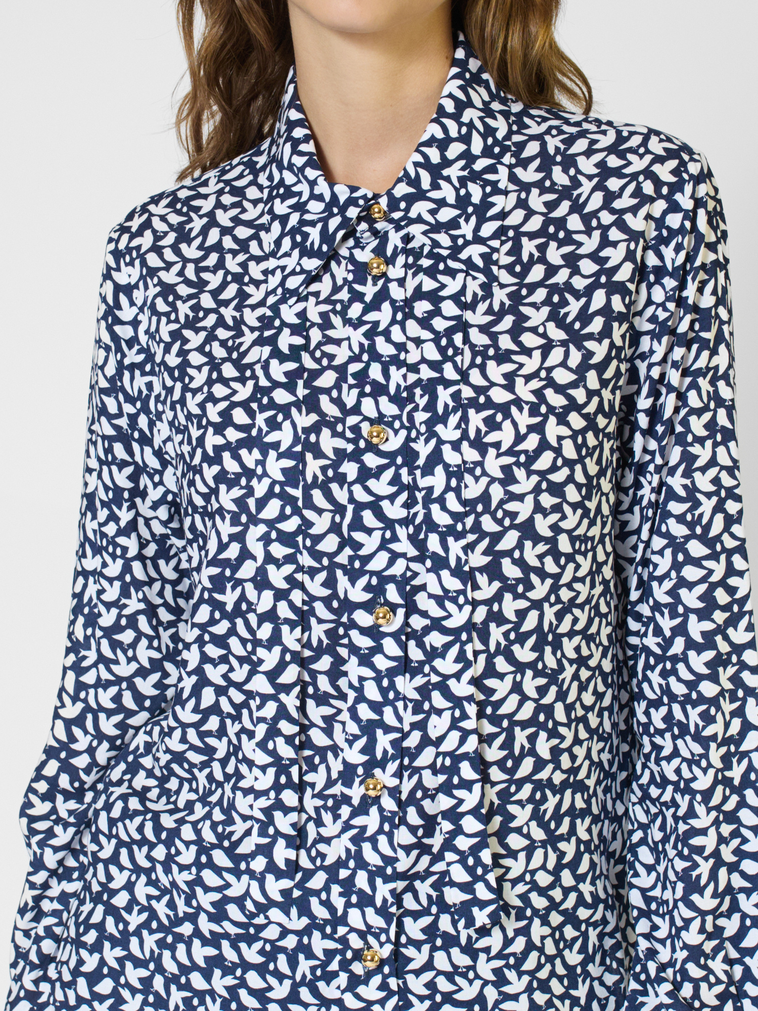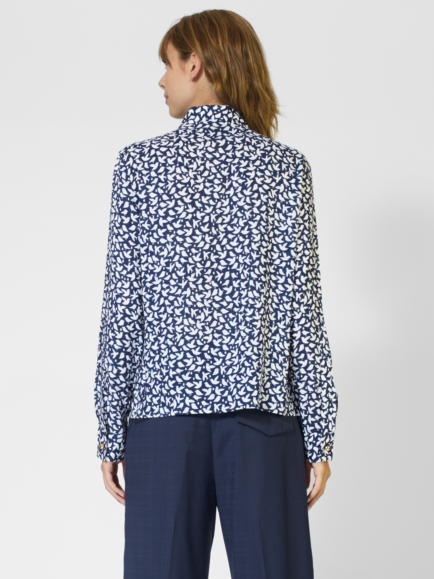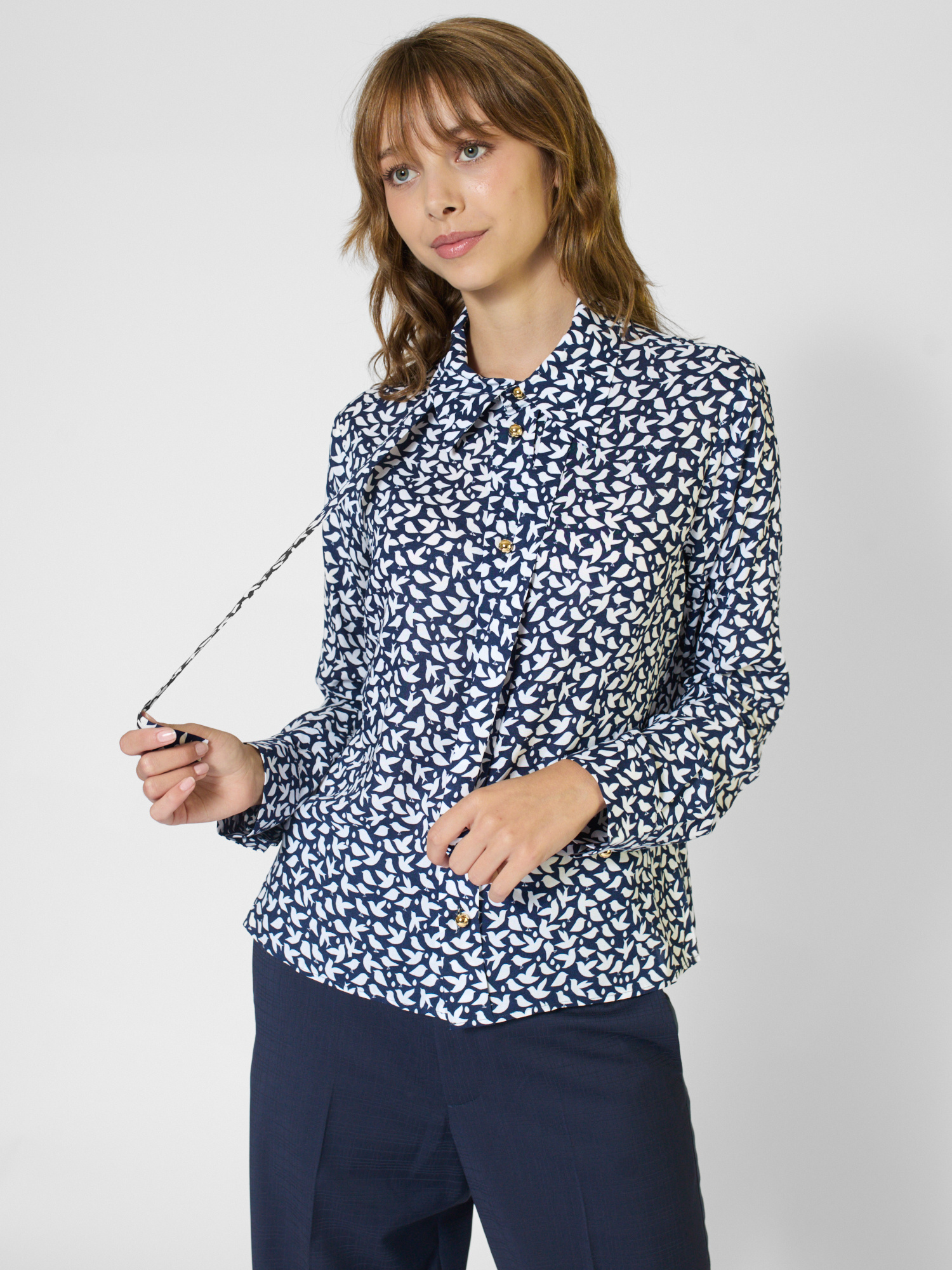 Soft crepe de chine printed blouse with gently draped, detachable ties, and gold buttons
