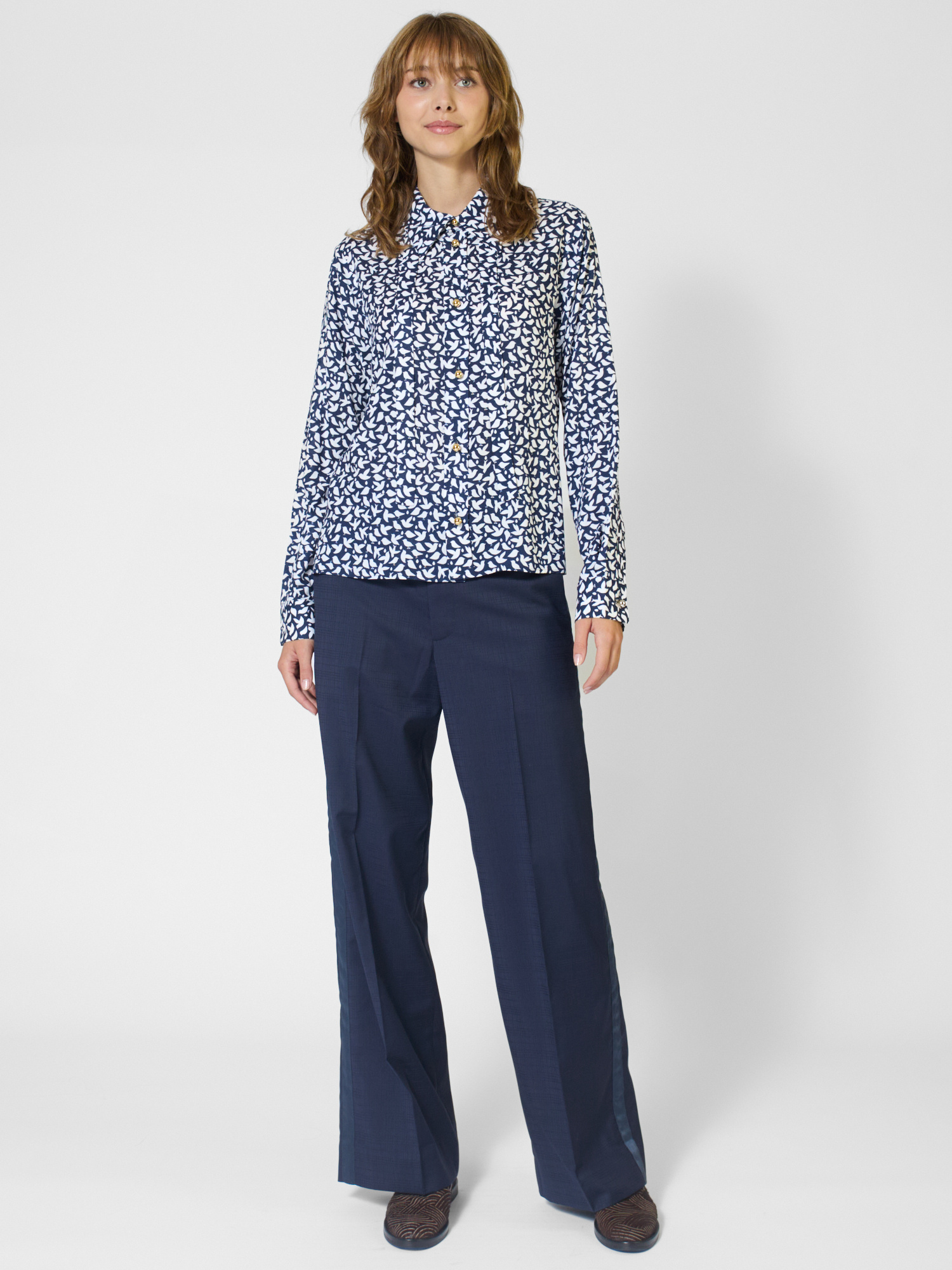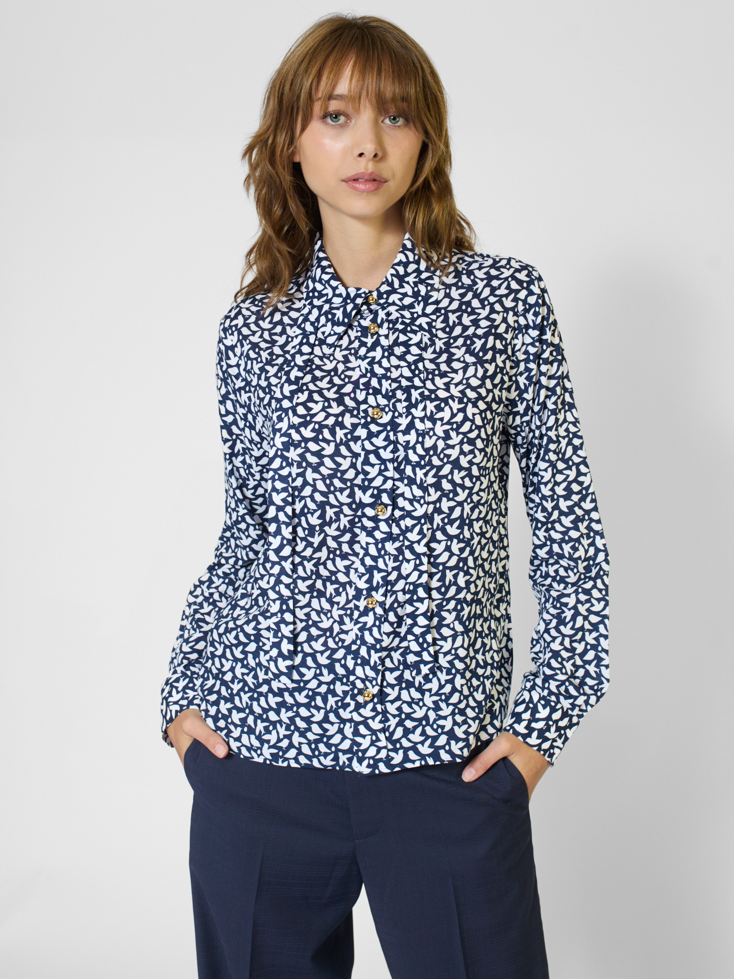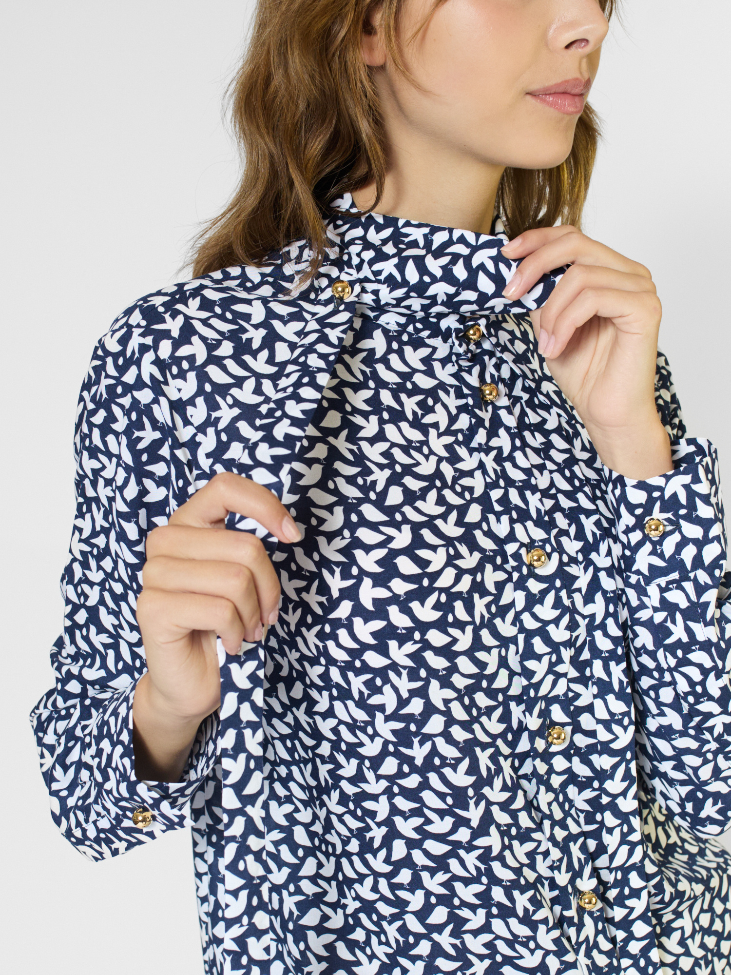 Soft crepe de chine printed blouse with gently draped, detachable ties, and gold buttons