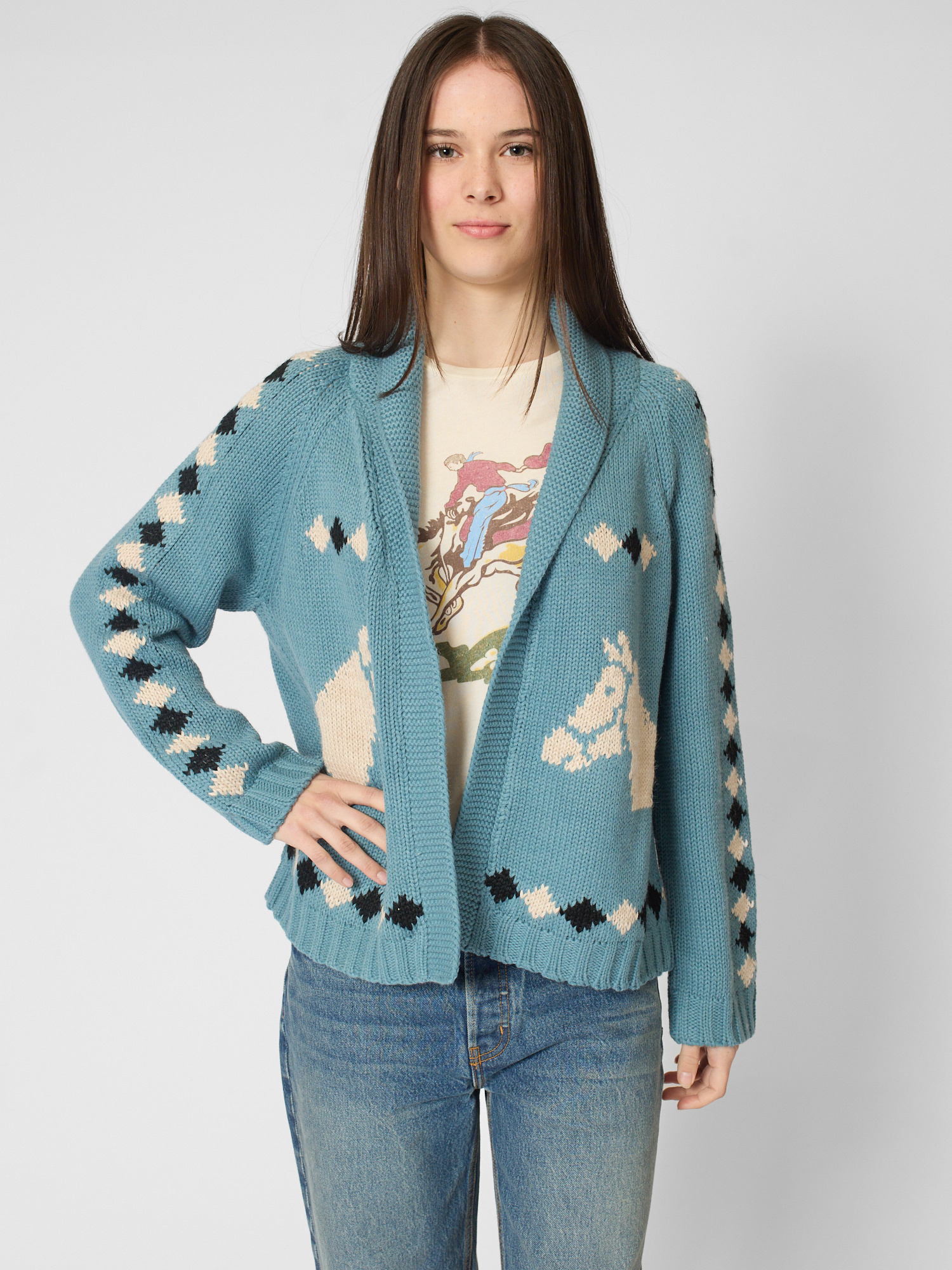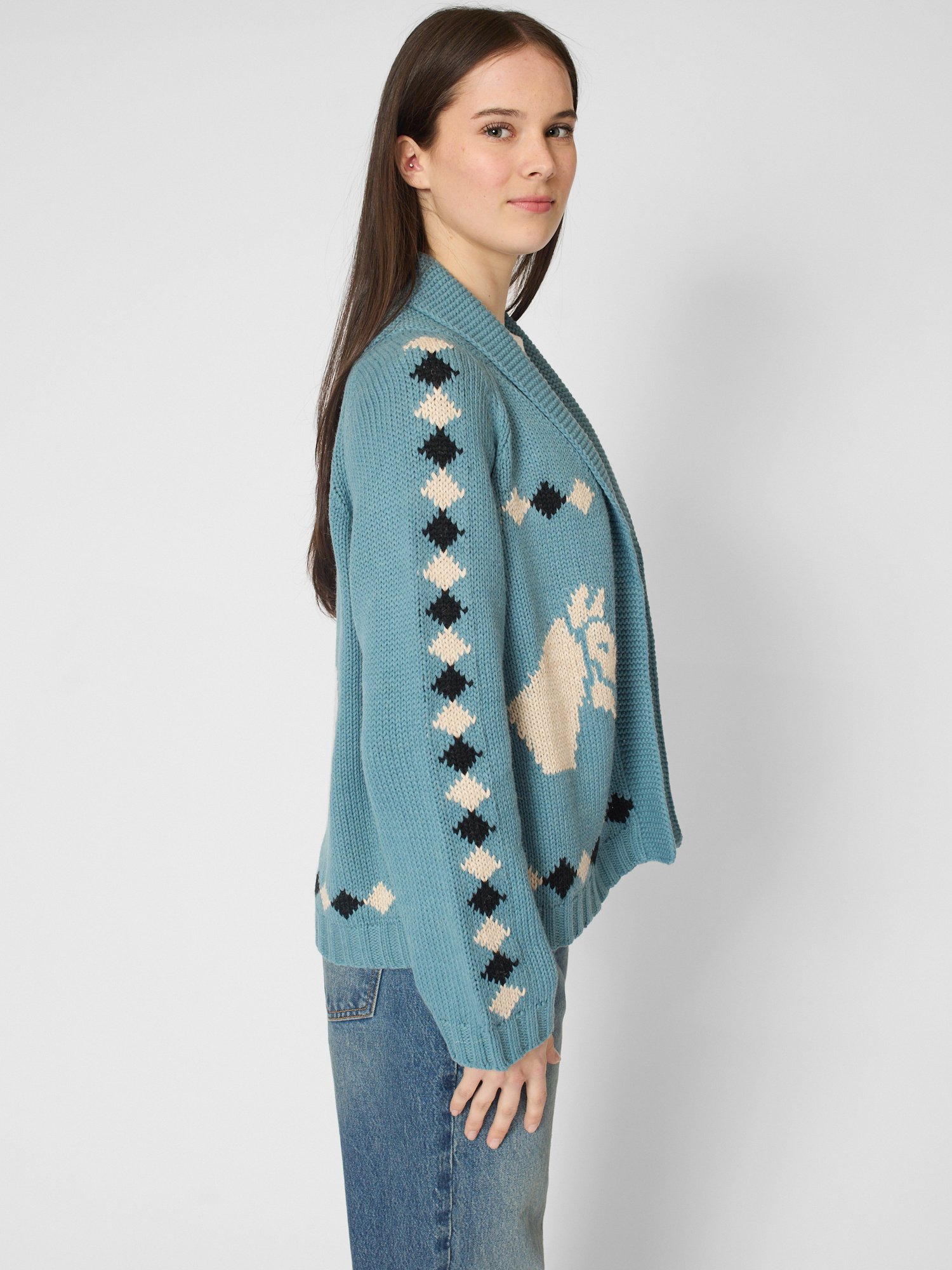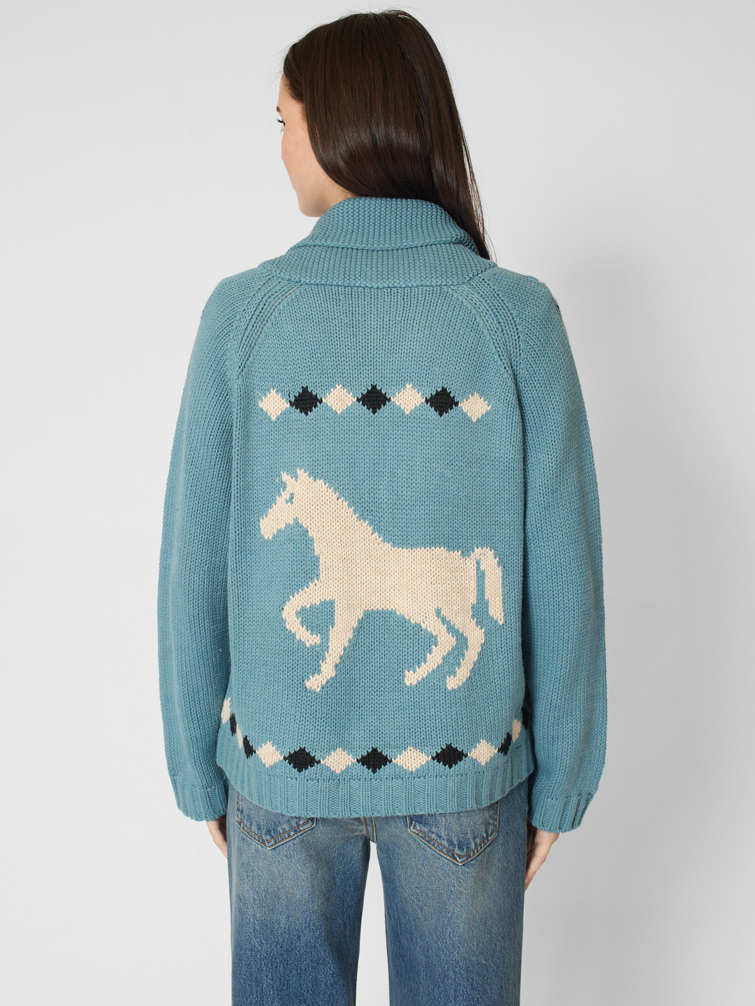 Easy fit cotton cardigan features a slightly cropped swingy sweep and classic shawl collar with hand-embroidered horse motif