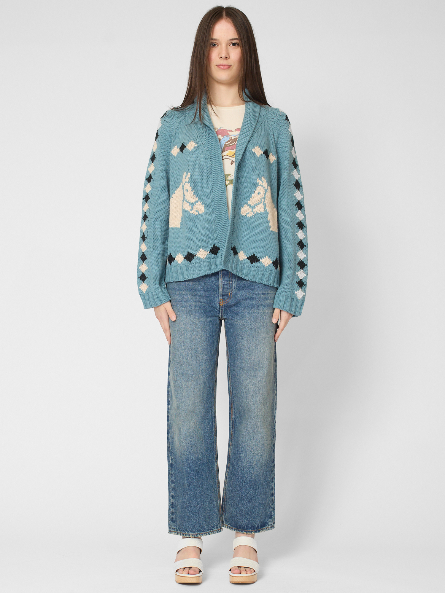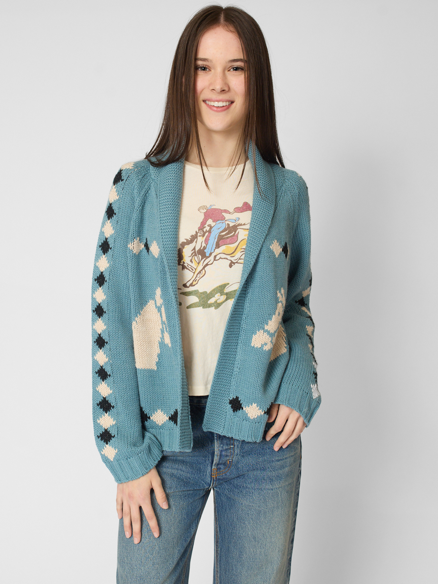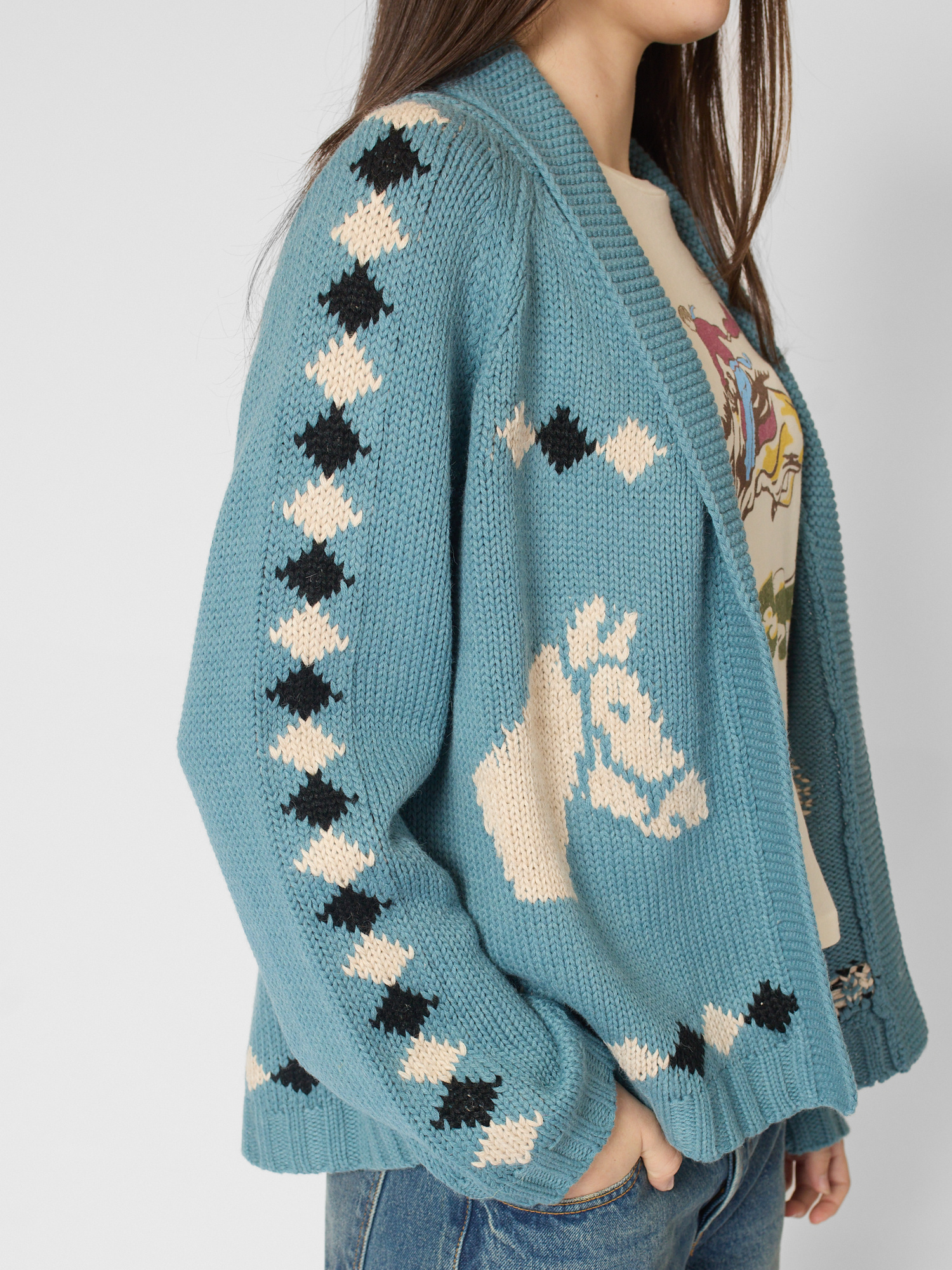 Easy fit cotton cardigan features a slightly cropped swingy sweep and classic shawl collar with hand-embroidered horse motif