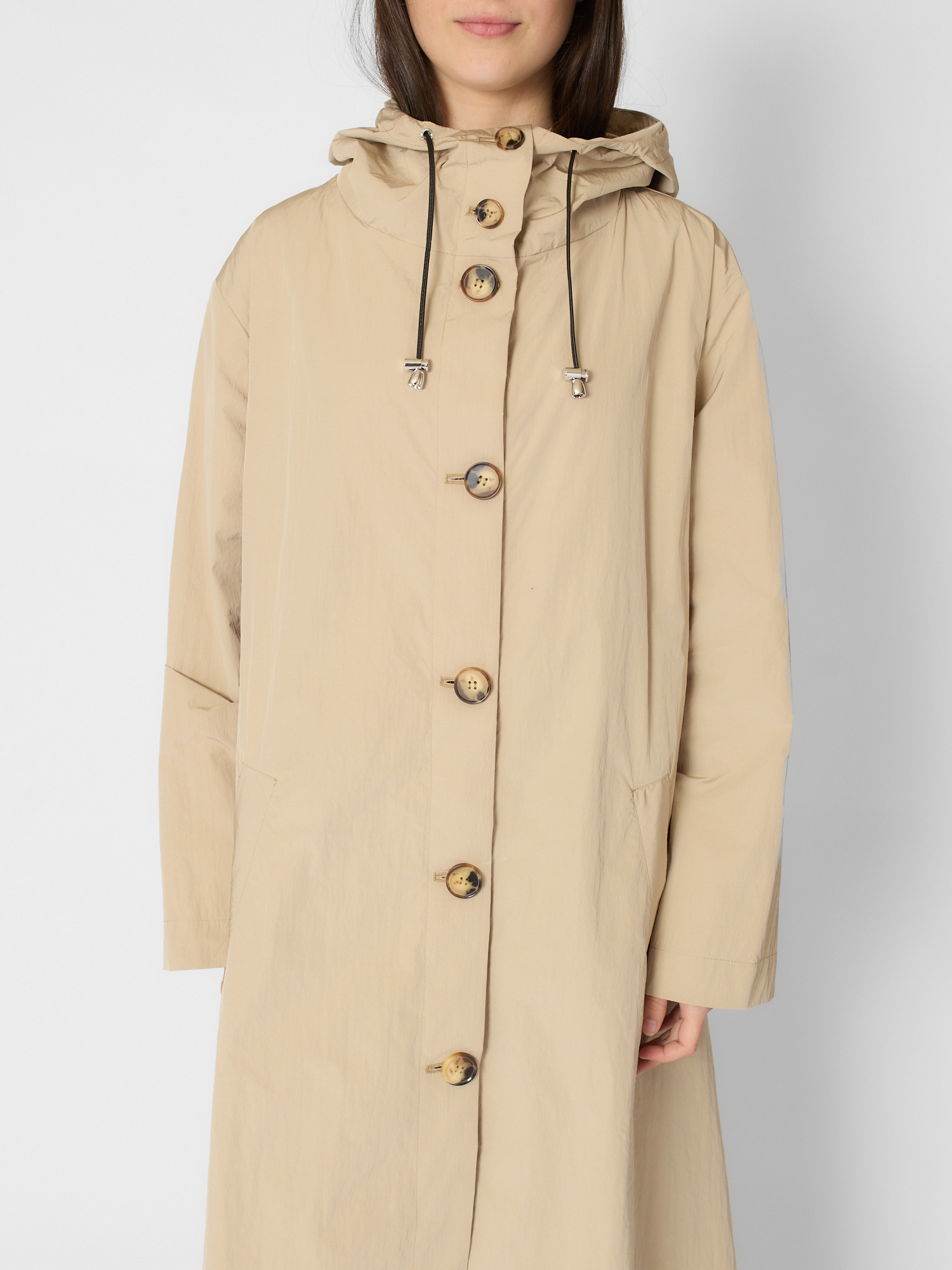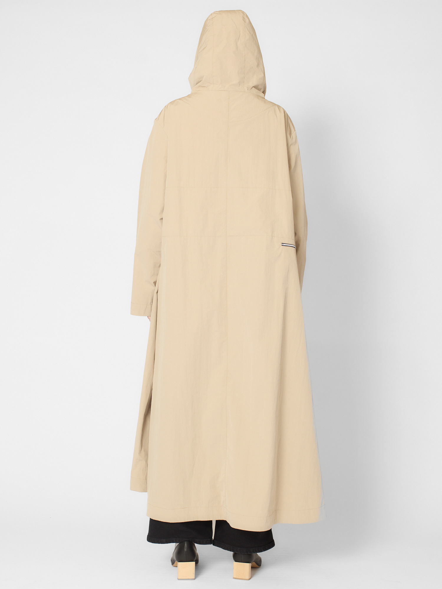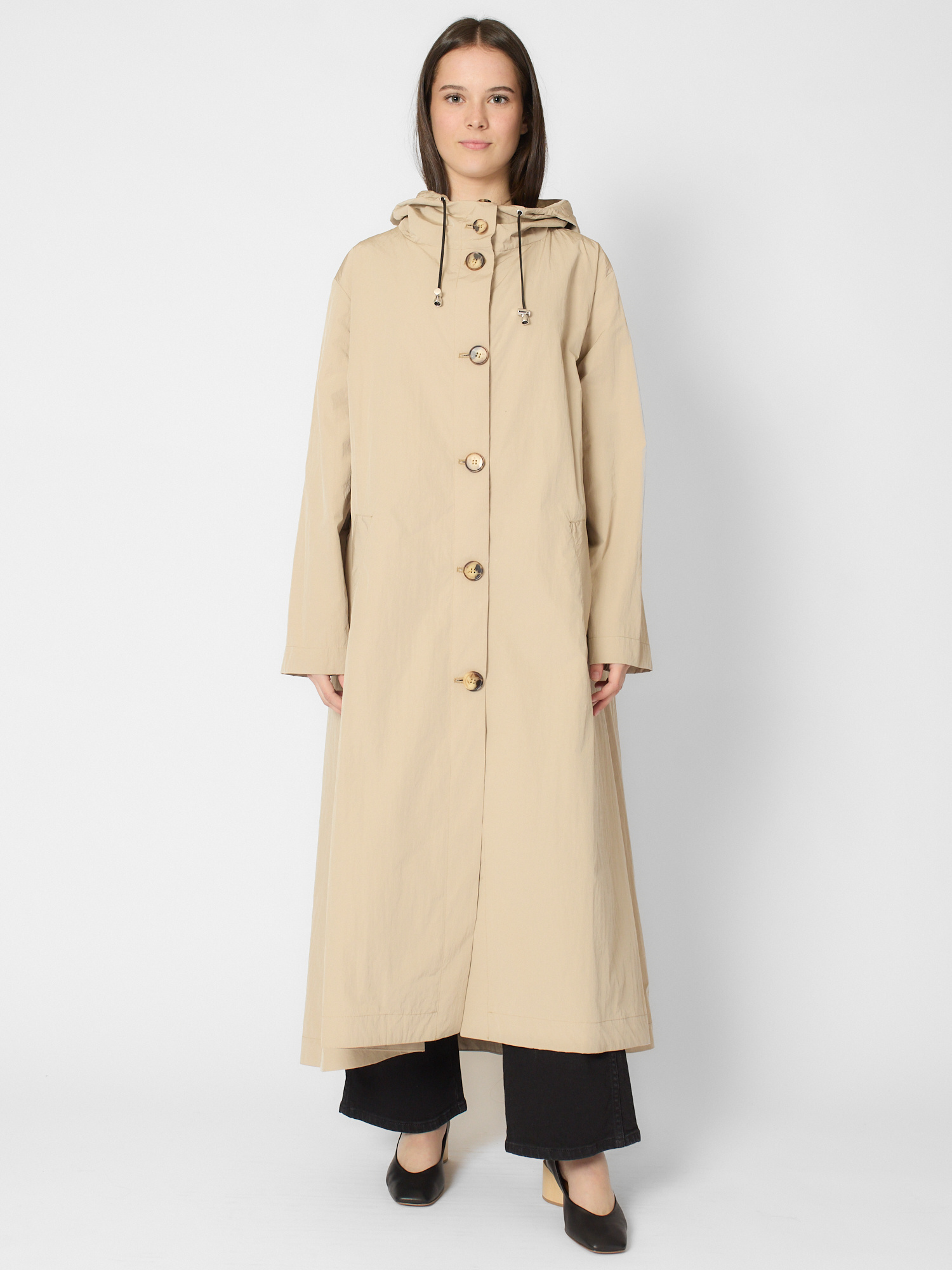 Water-repellent cotton-blend long parka features a hood, deep side pockets, and signature back pockets.