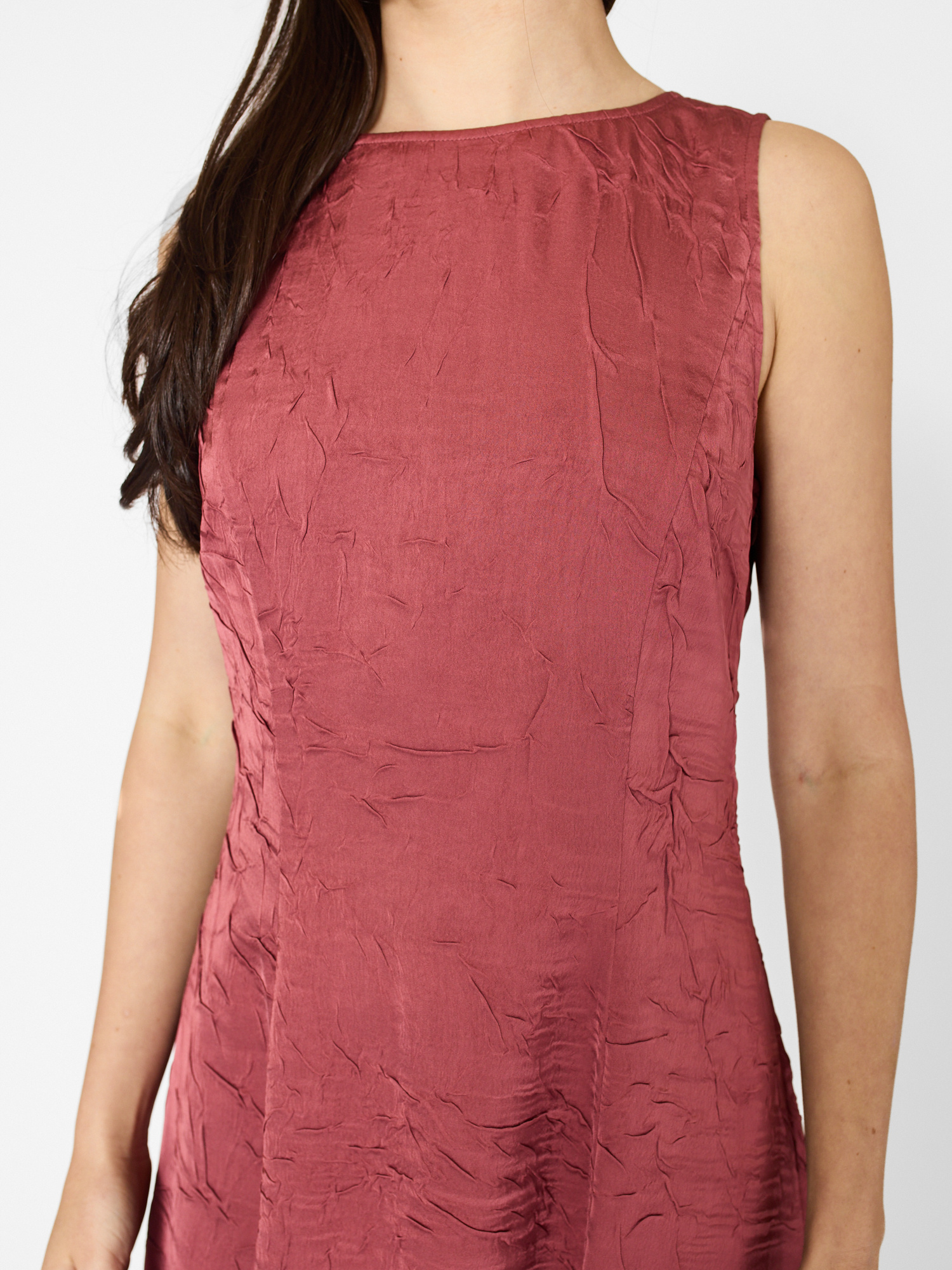 Italian crinkled satin midi-length dress designed with a scoop back and side pockets