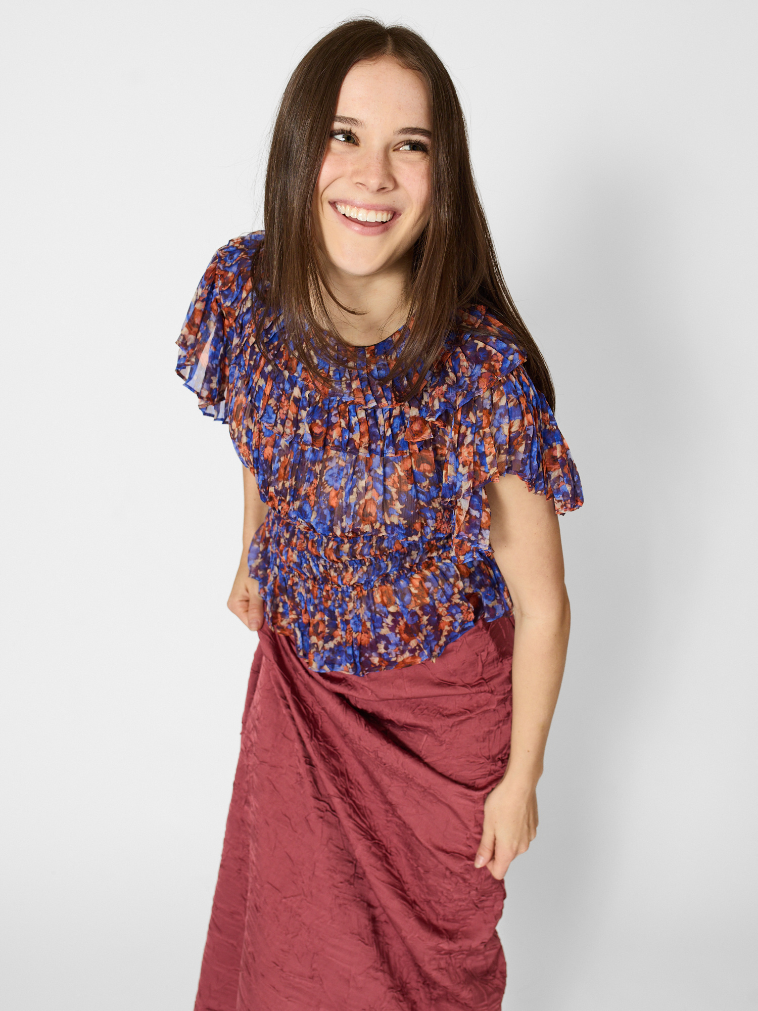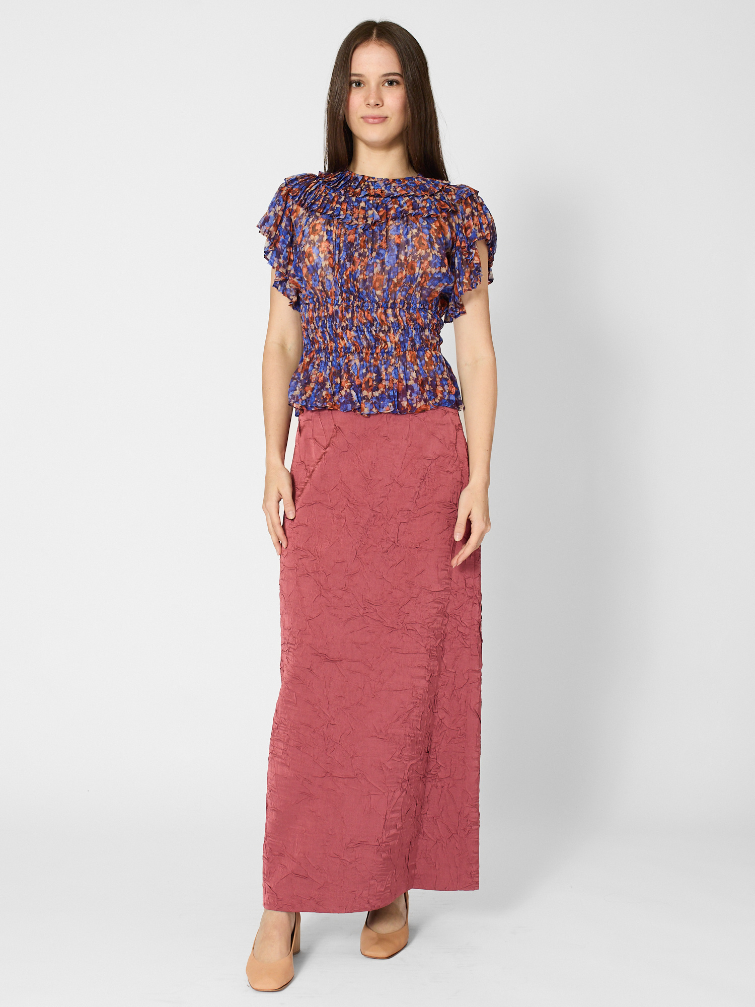Crinkled silk chiffon designed with gathering at the bust that expands, fixed at the waist, with flutter short sleeves