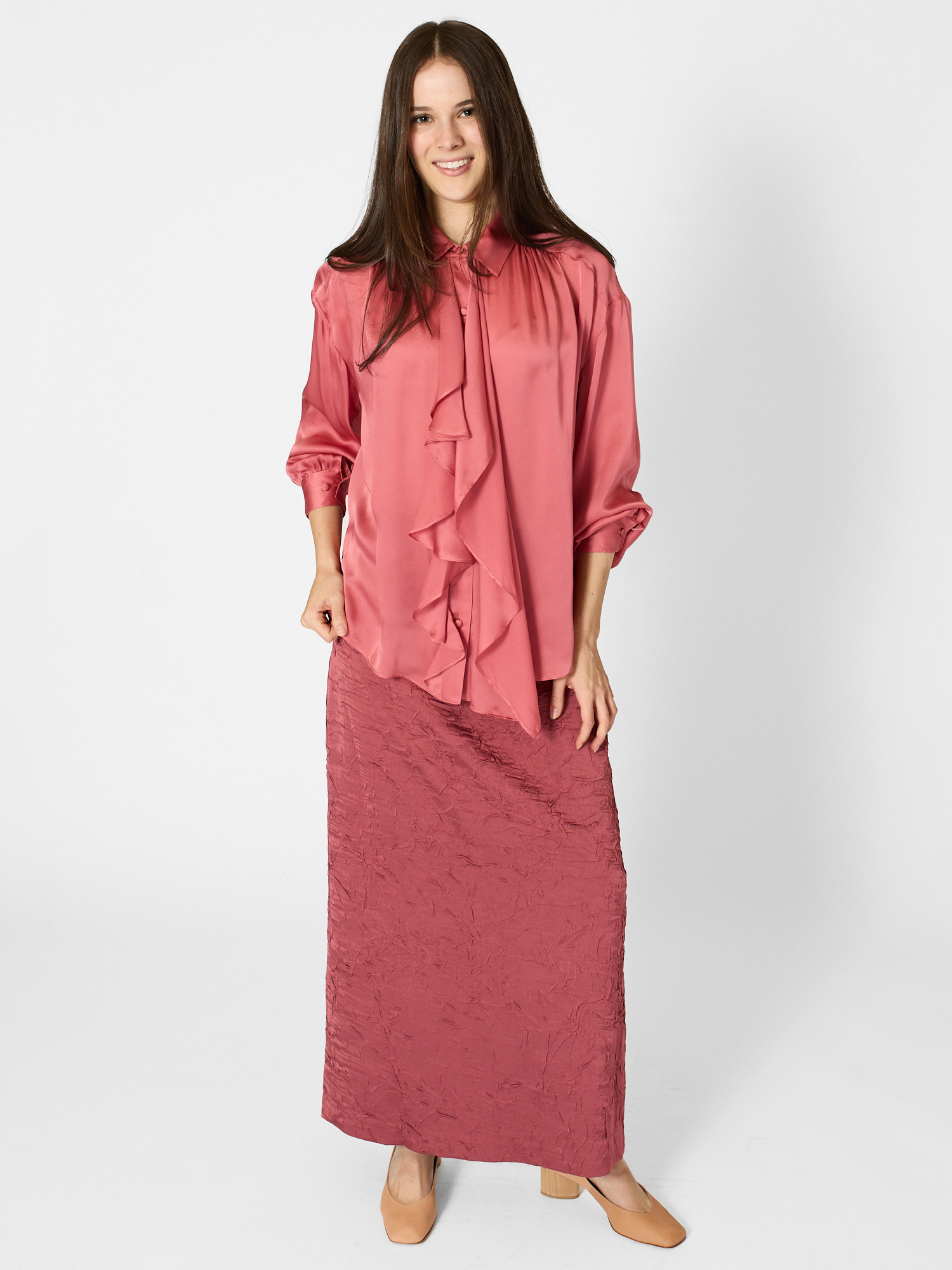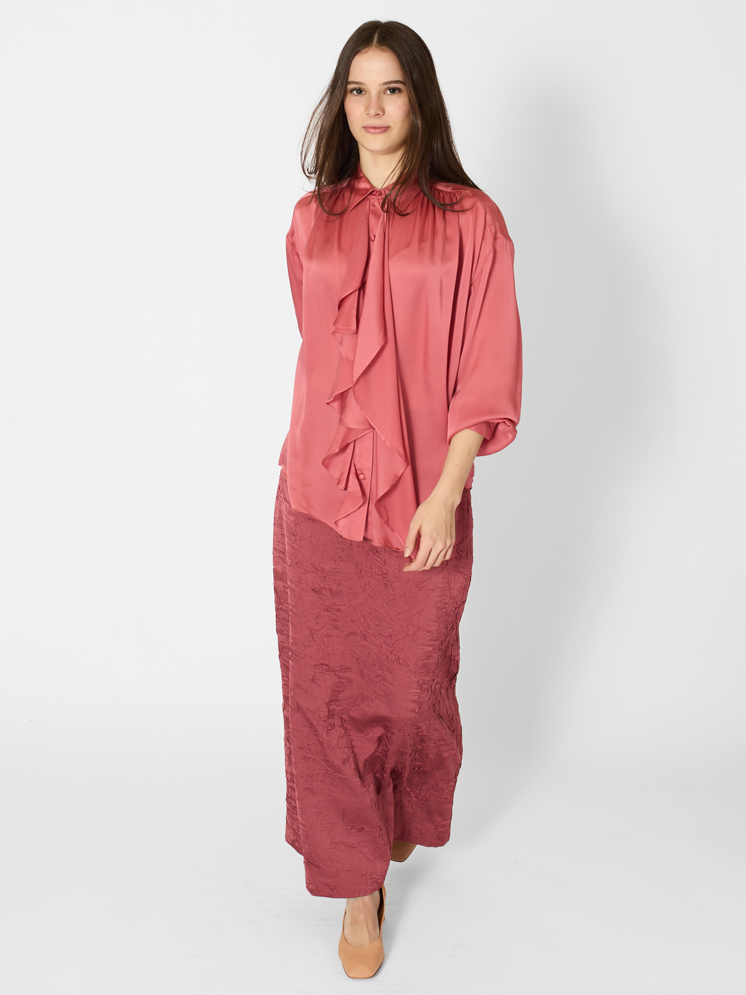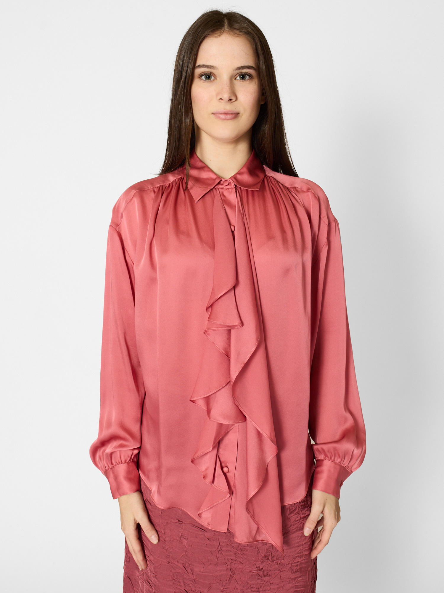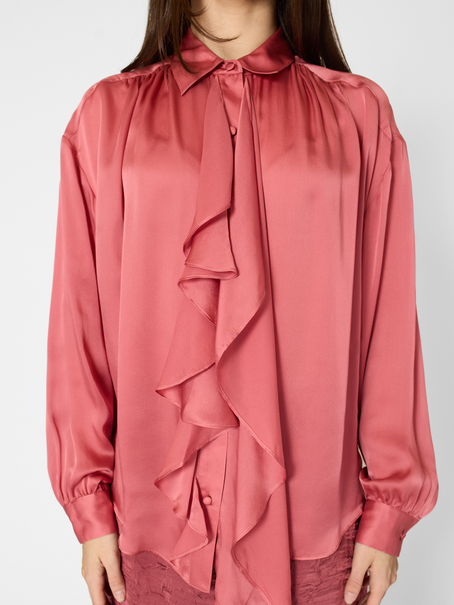 Satin-faced silk chiffon blouse, designed for an oversized fit. long sleeves with button cuffs, buttons through front