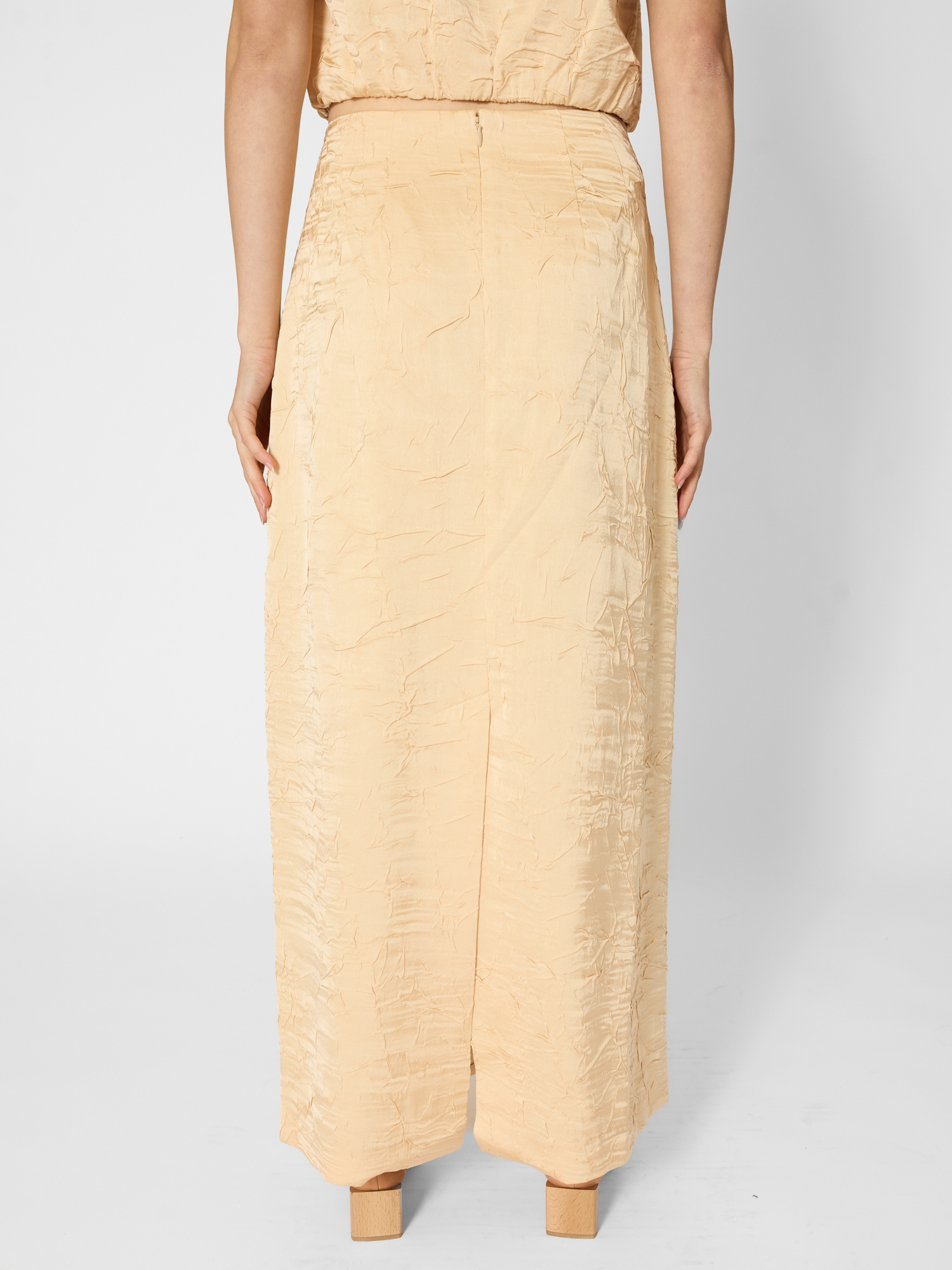 Italian crinkled satin midi skirt with a fixed high-rise waist and side split