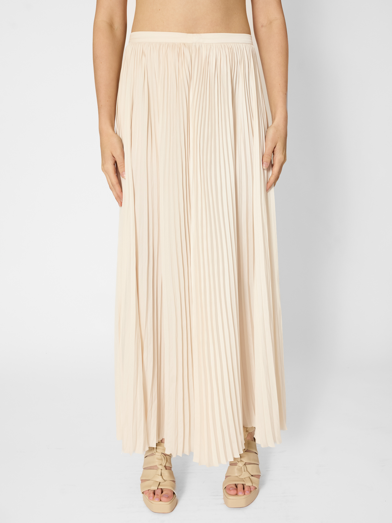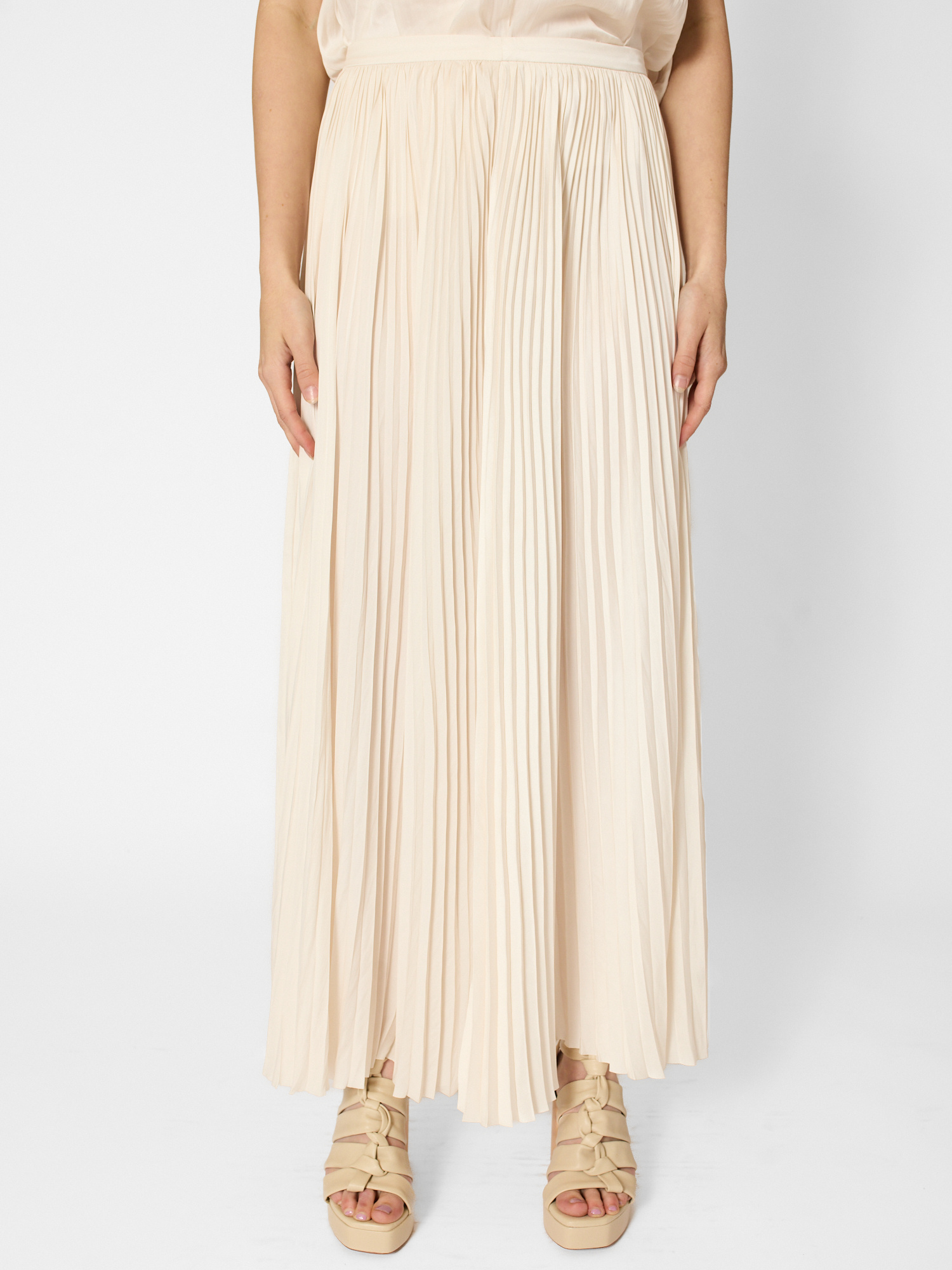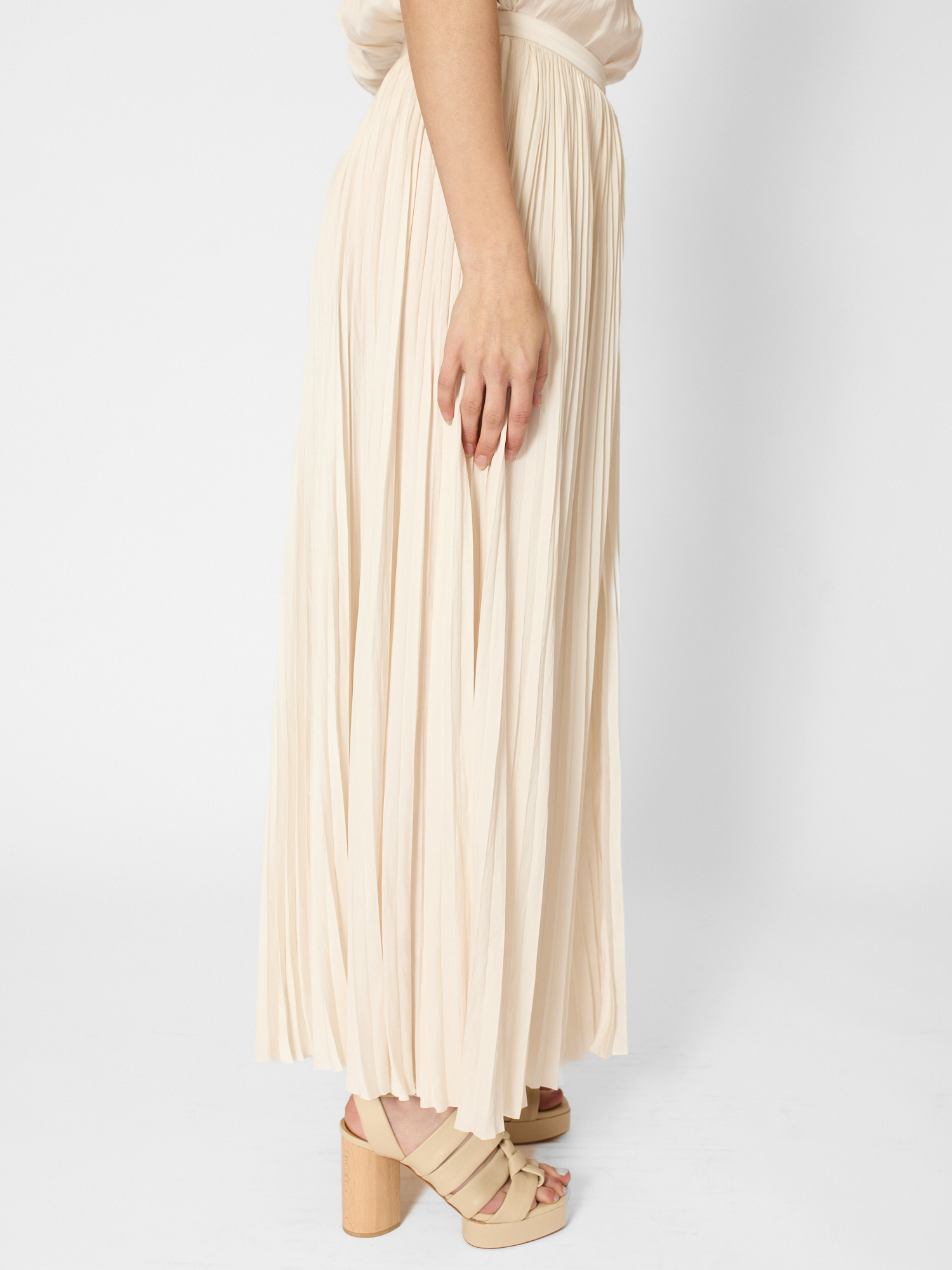 A pleated satin fabric long skirt features an elastic waistband with a drawstring bow at each side.