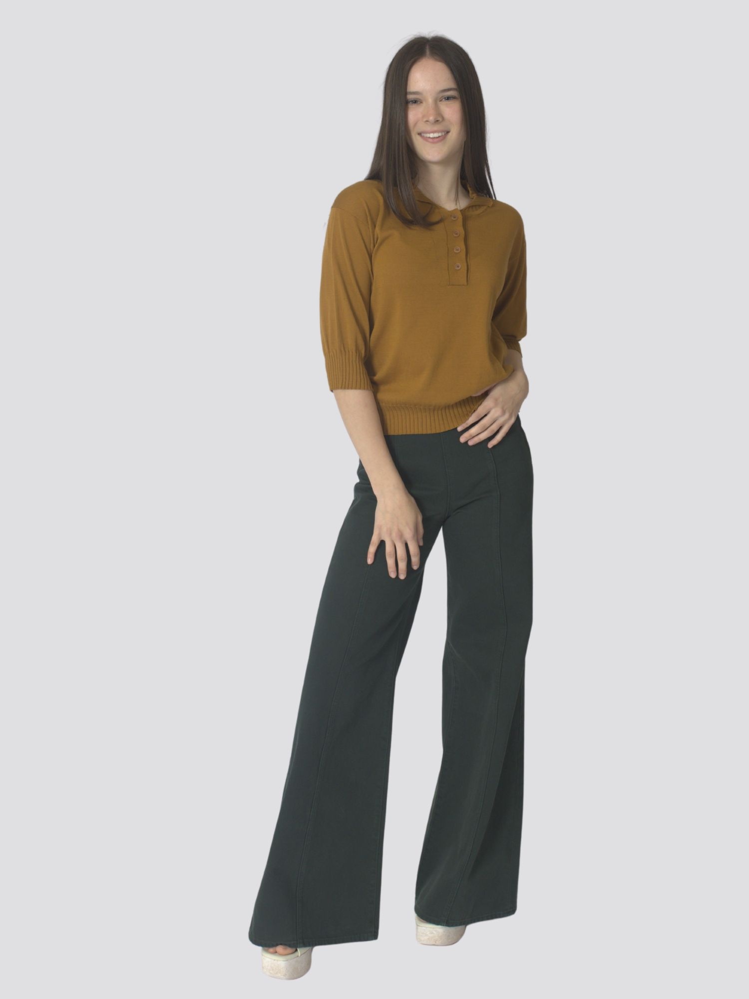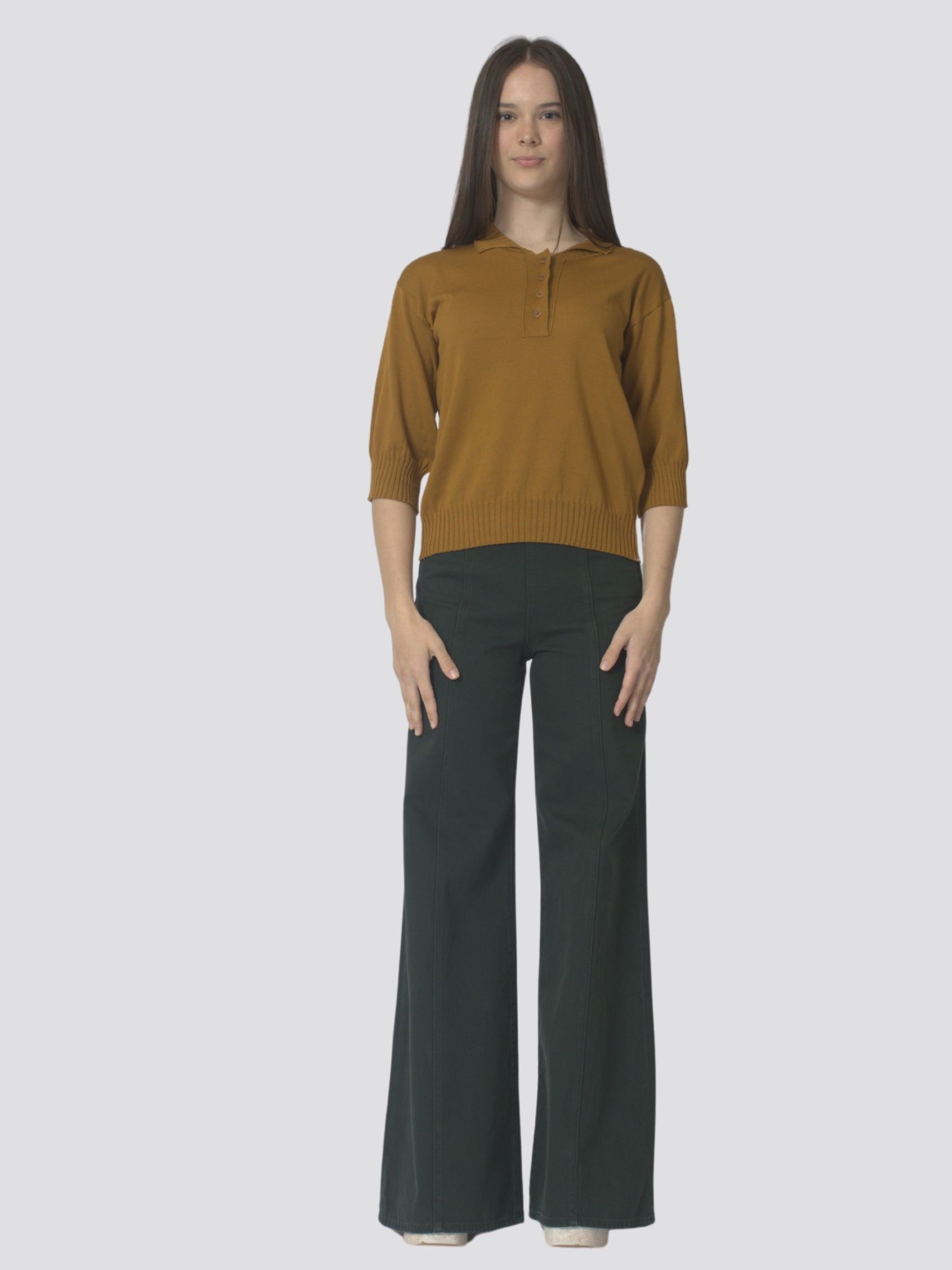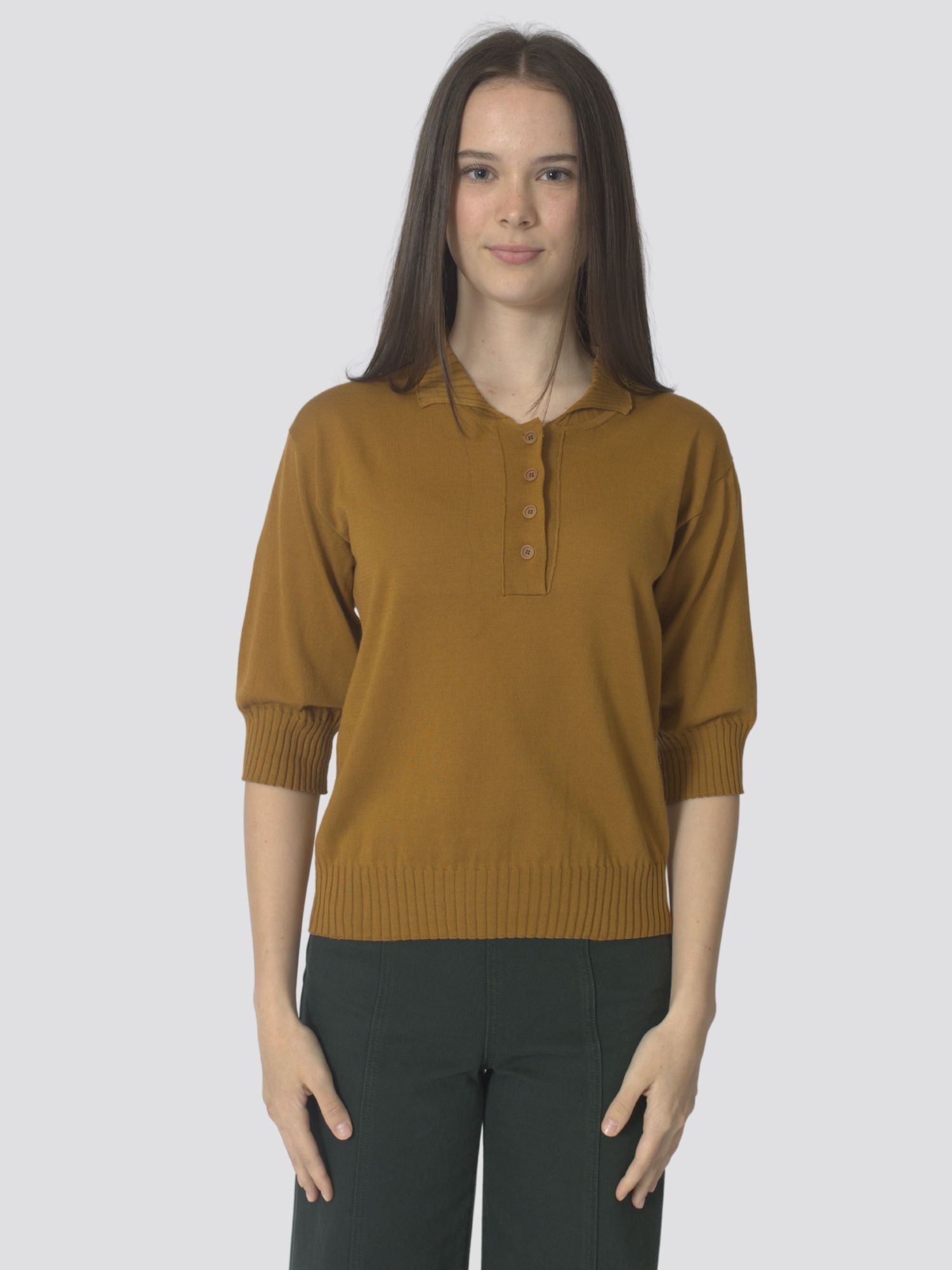 Polo-collar cotton pullover features three-quarter-length sleeves.