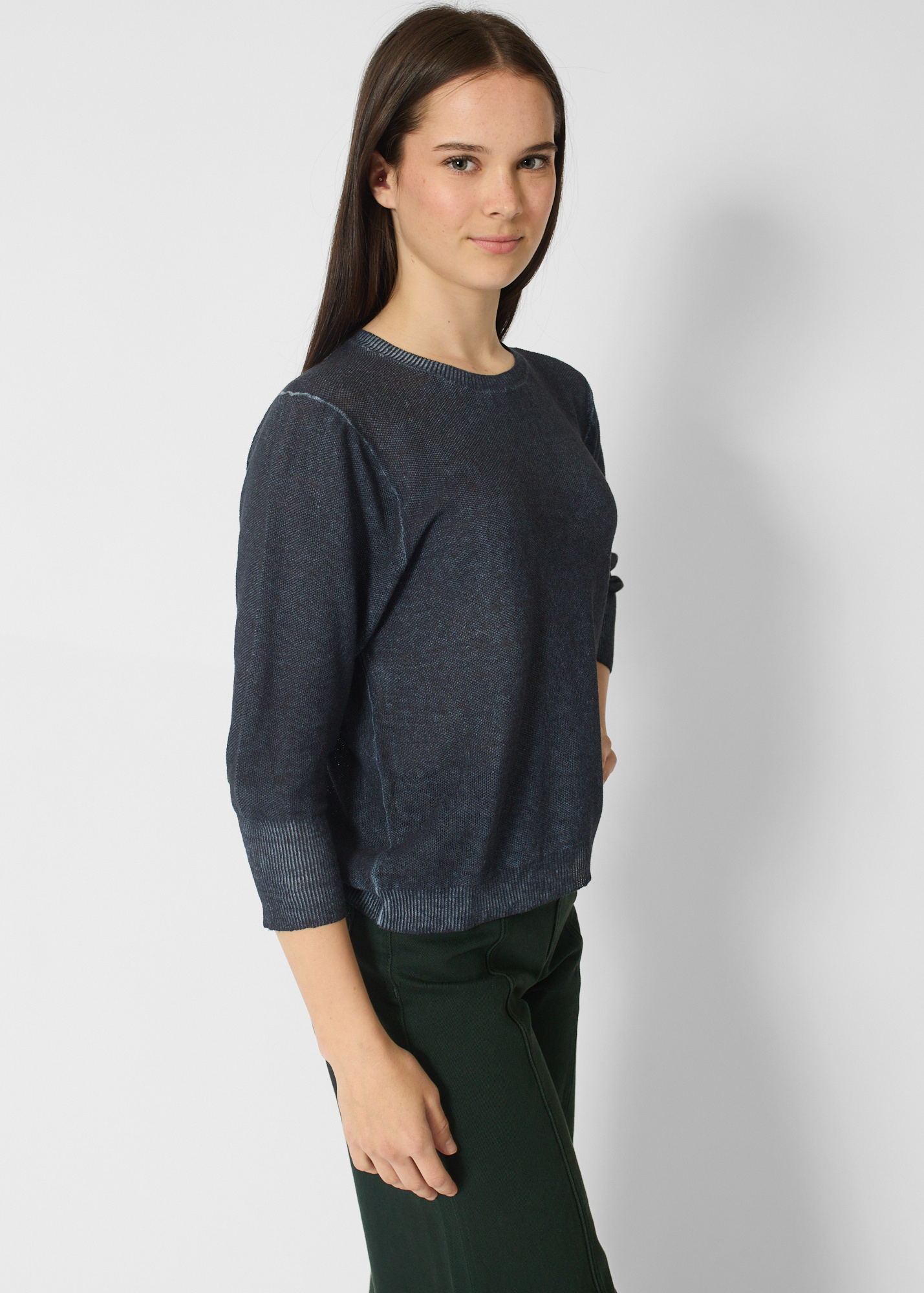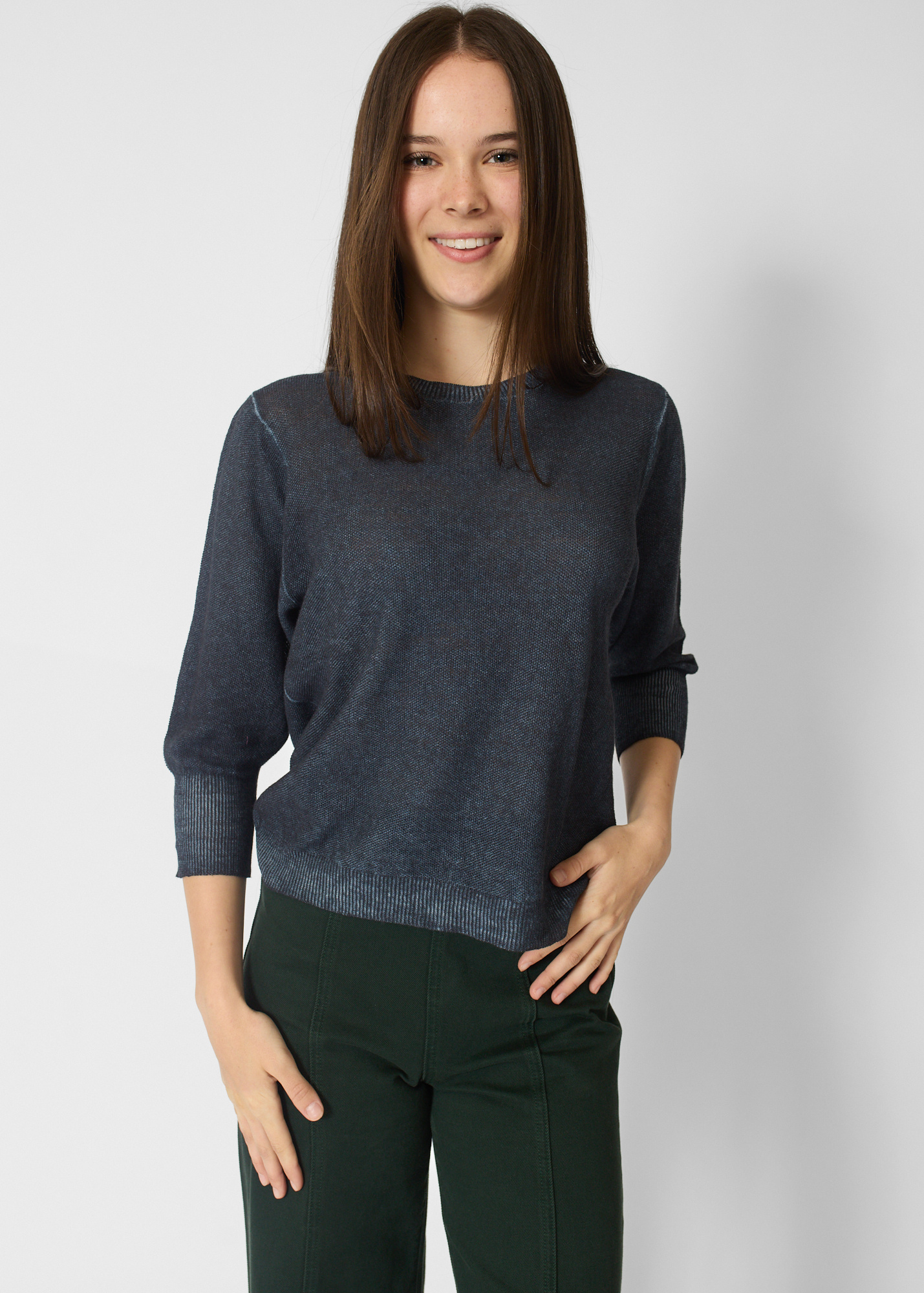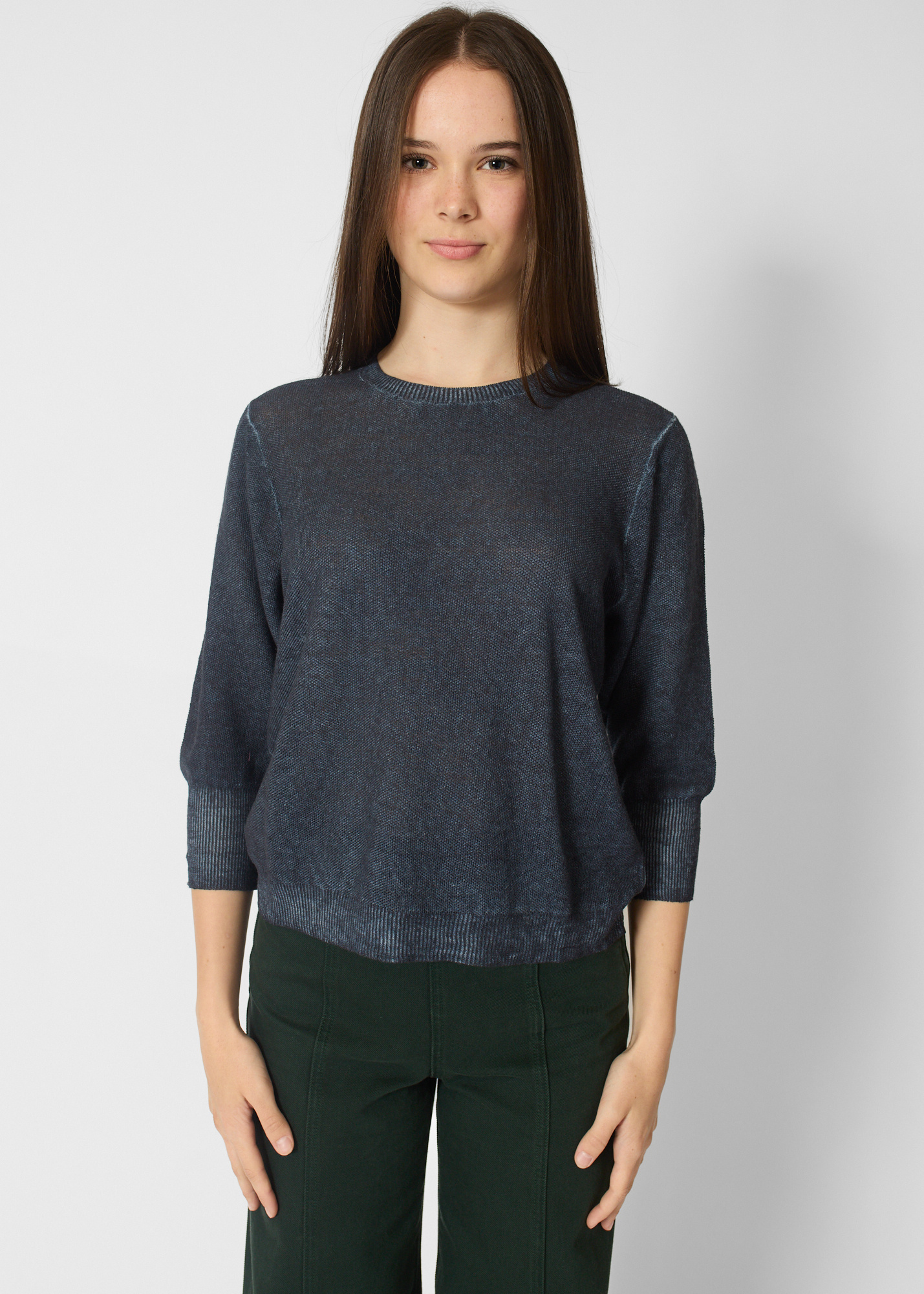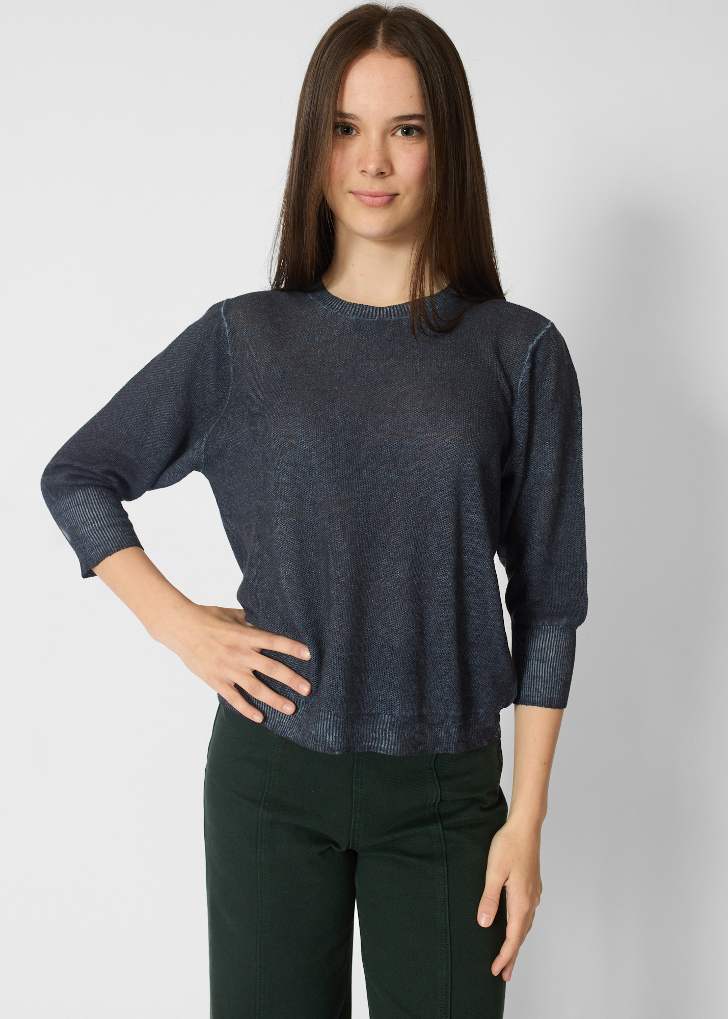 Washed navy pullover with three-quarter length sleeves