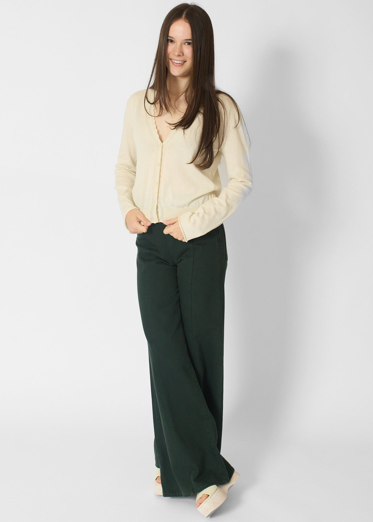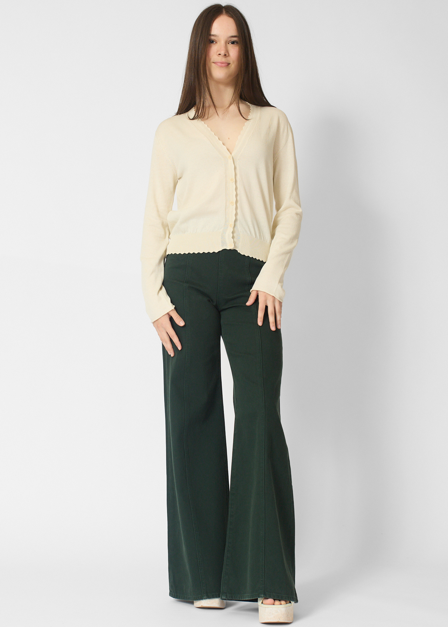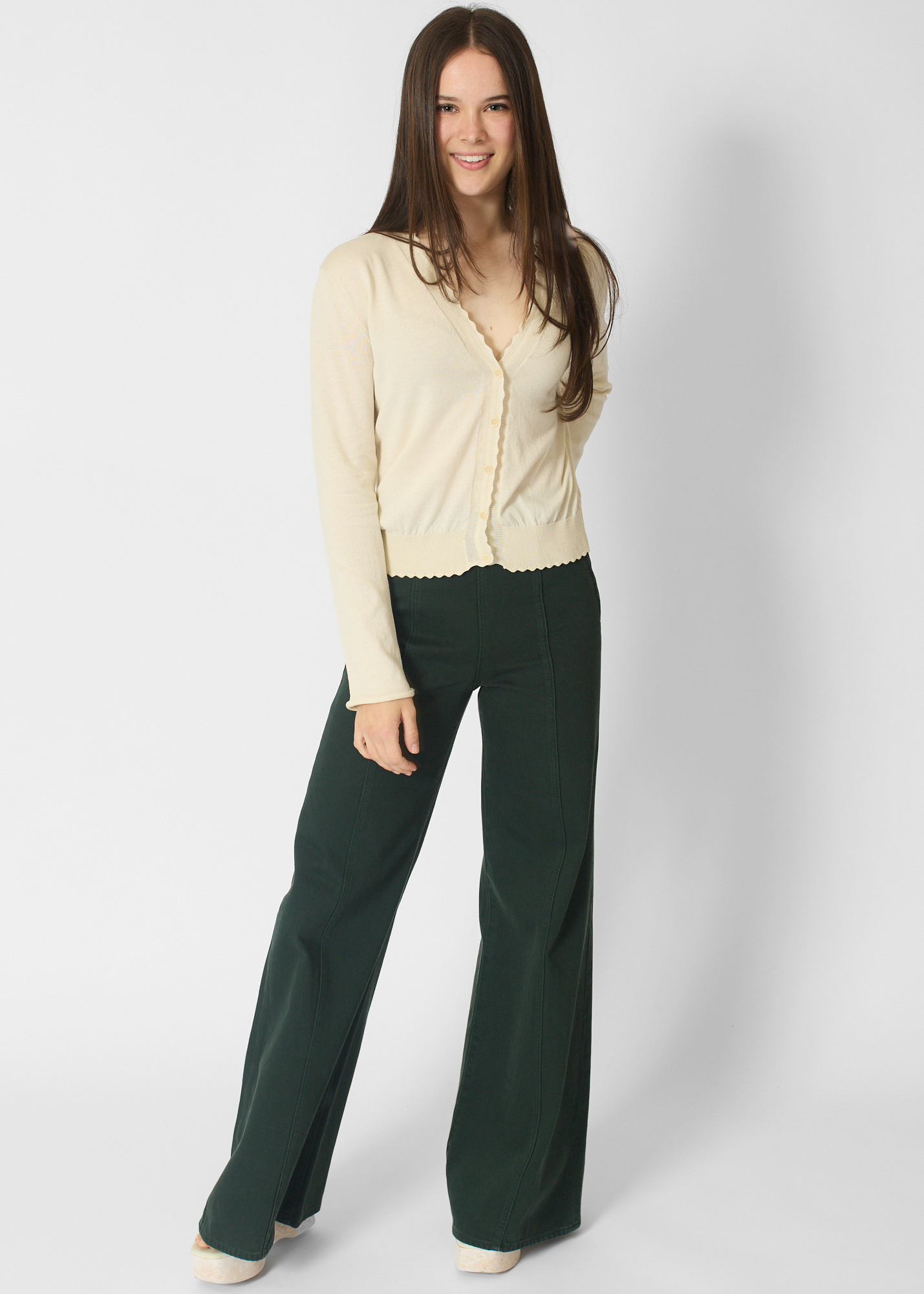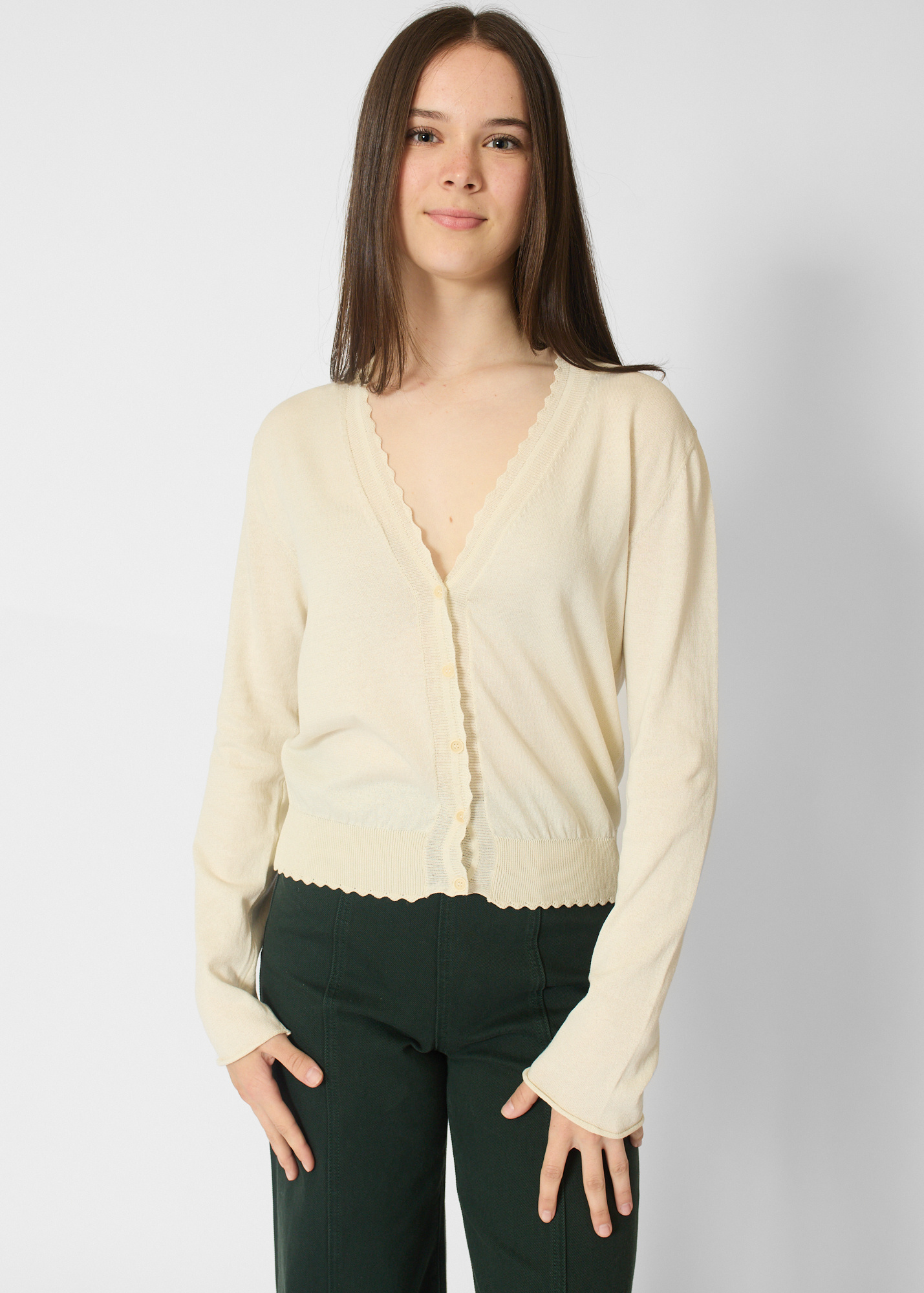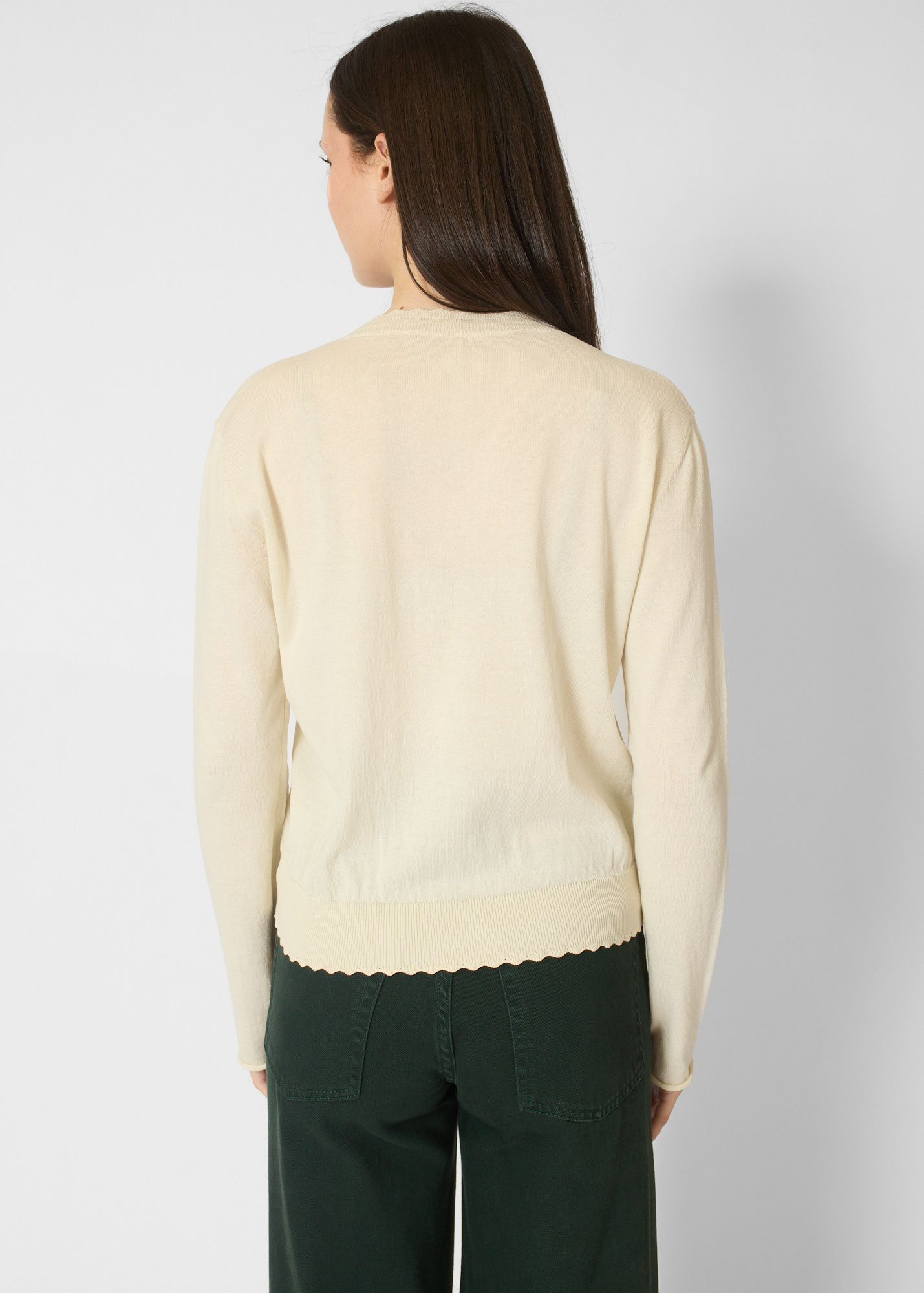 Long-sleeve cotton cardigan with scallop trim details.