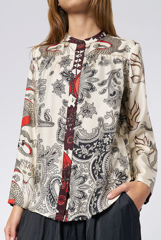 Long-sleeved fully buttoned shirt with mao collar and yoke in contrast prints