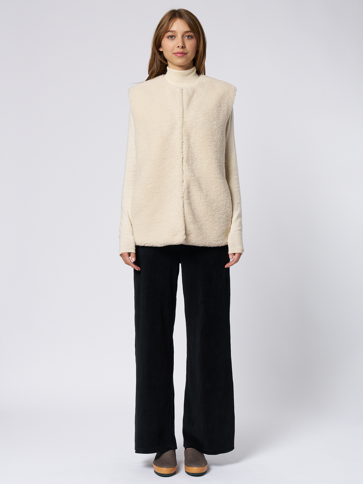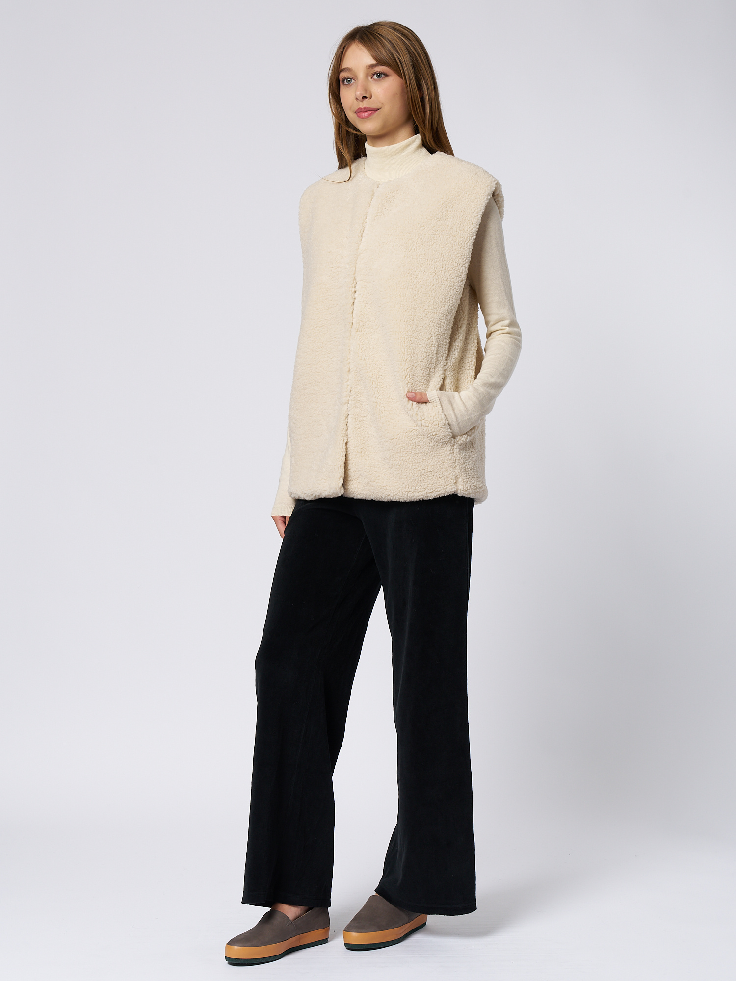 Teddy sherpa vest lined in quilted quiana cotton with hook-fastening front, and side slit pockets.