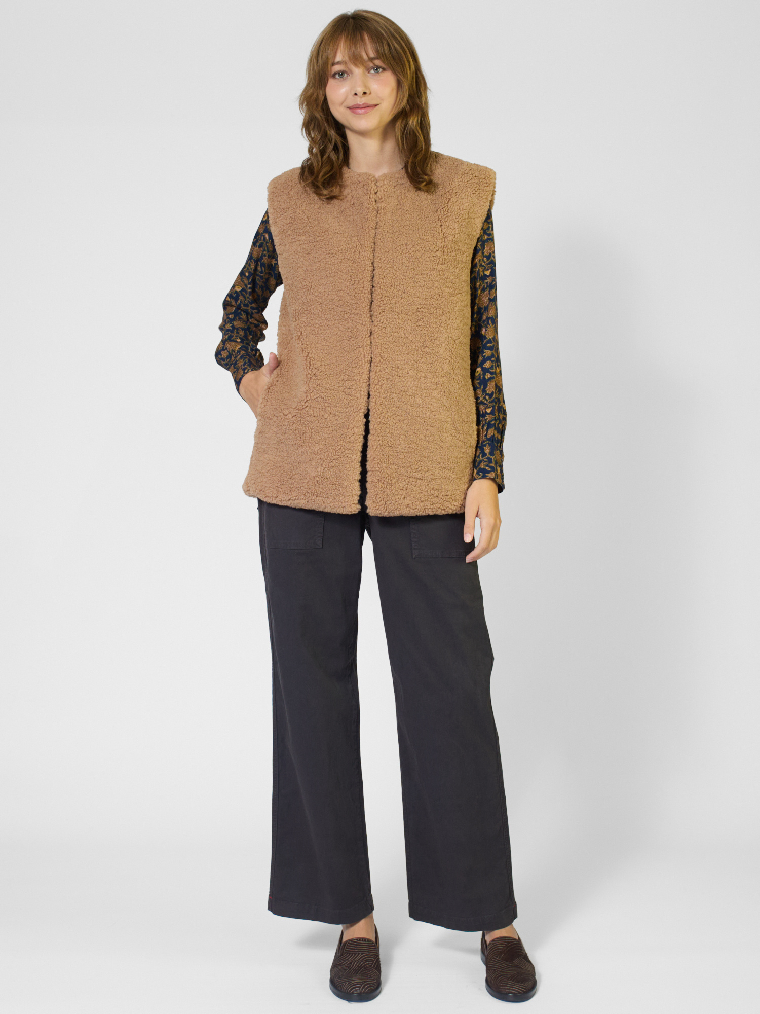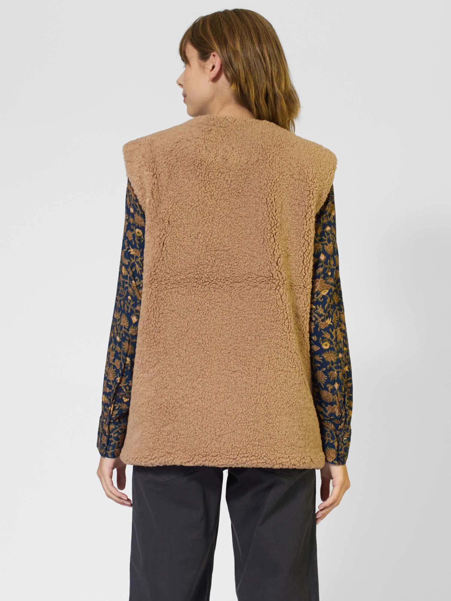 Teddy sherpa vest lined in quilted quiana cotton with hook-fastening front, and side slit pockets.