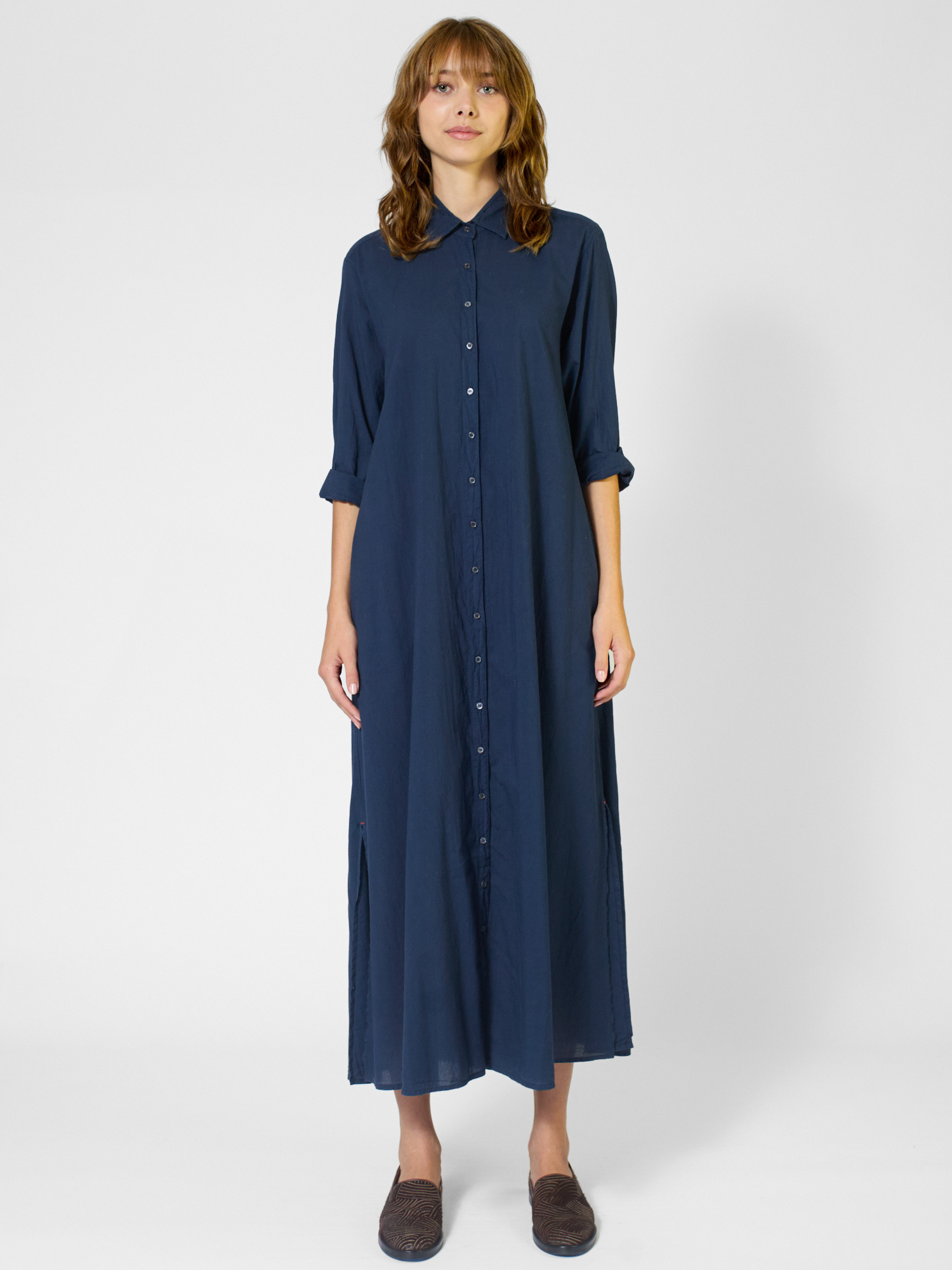 An easy-fit cotton shirtdress with a button-front, side seam pockets, and hem side slits.