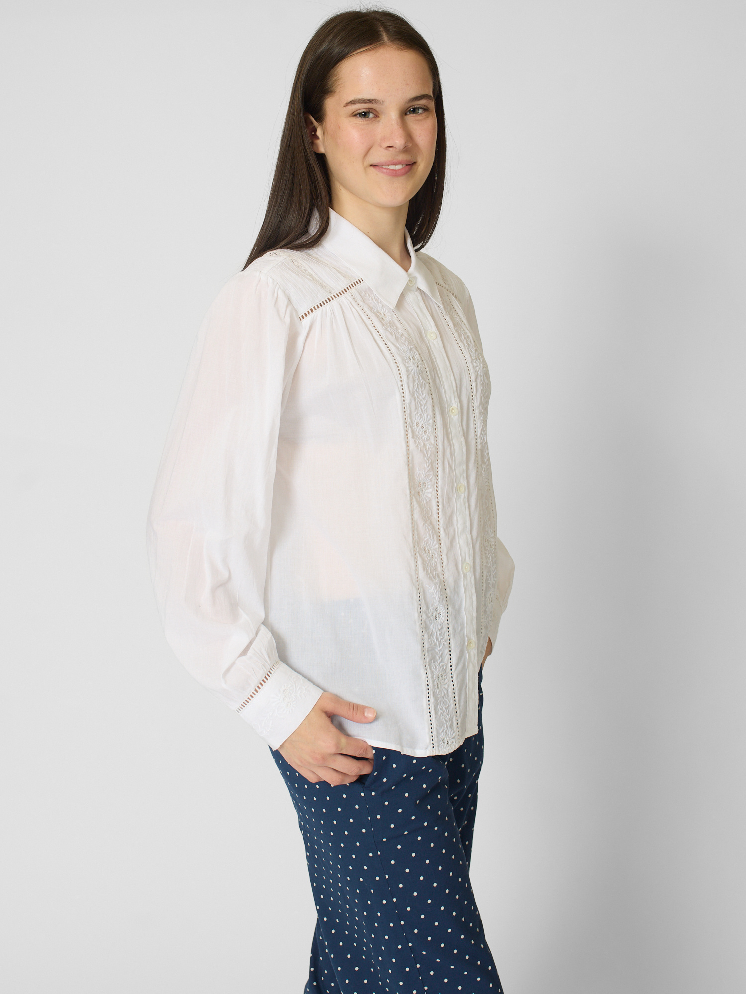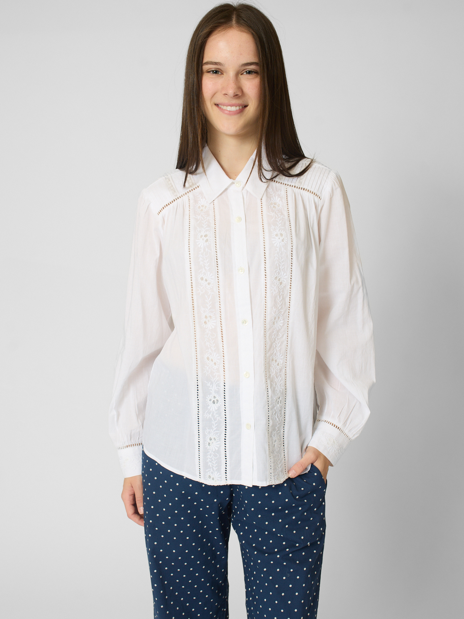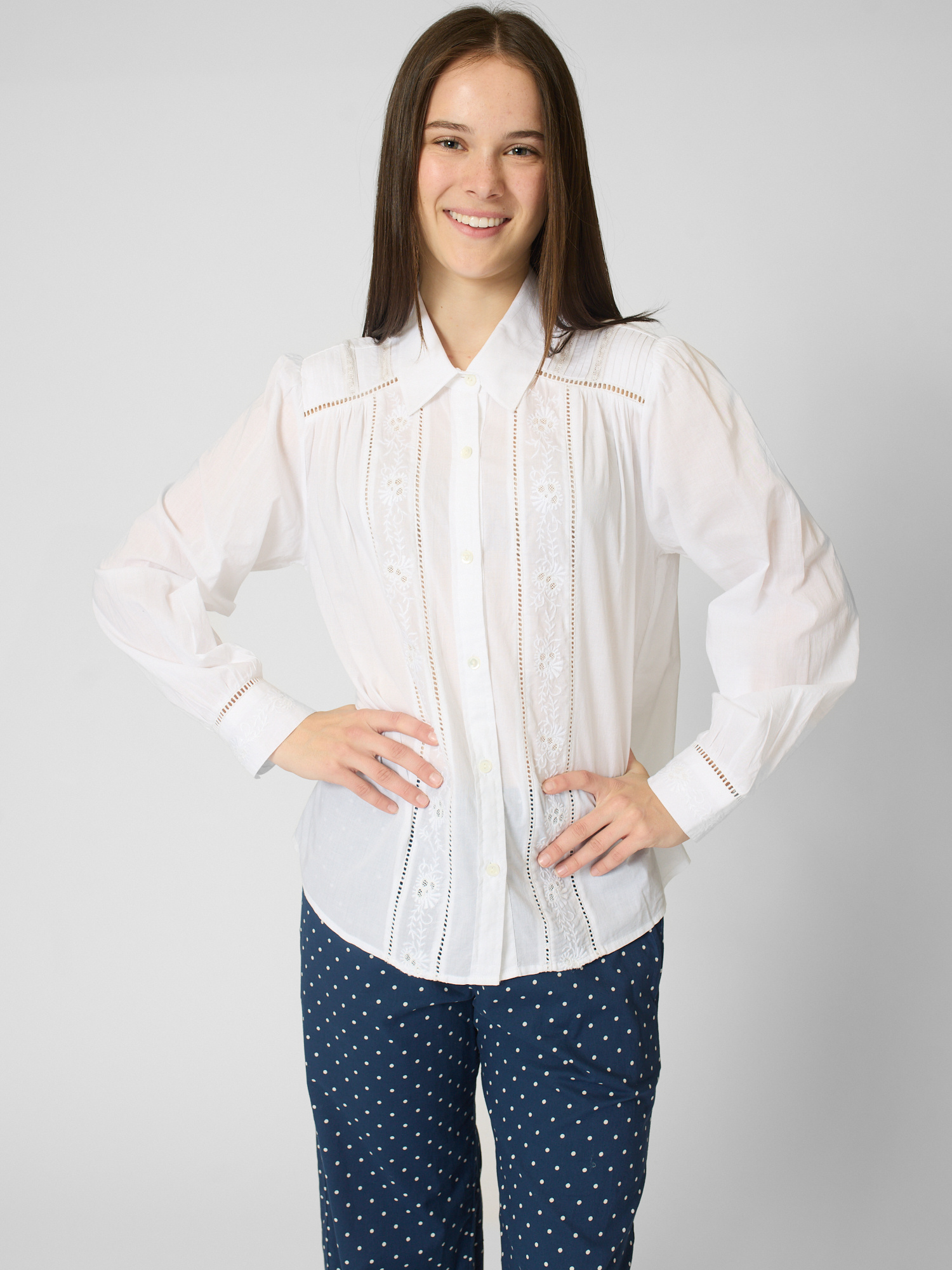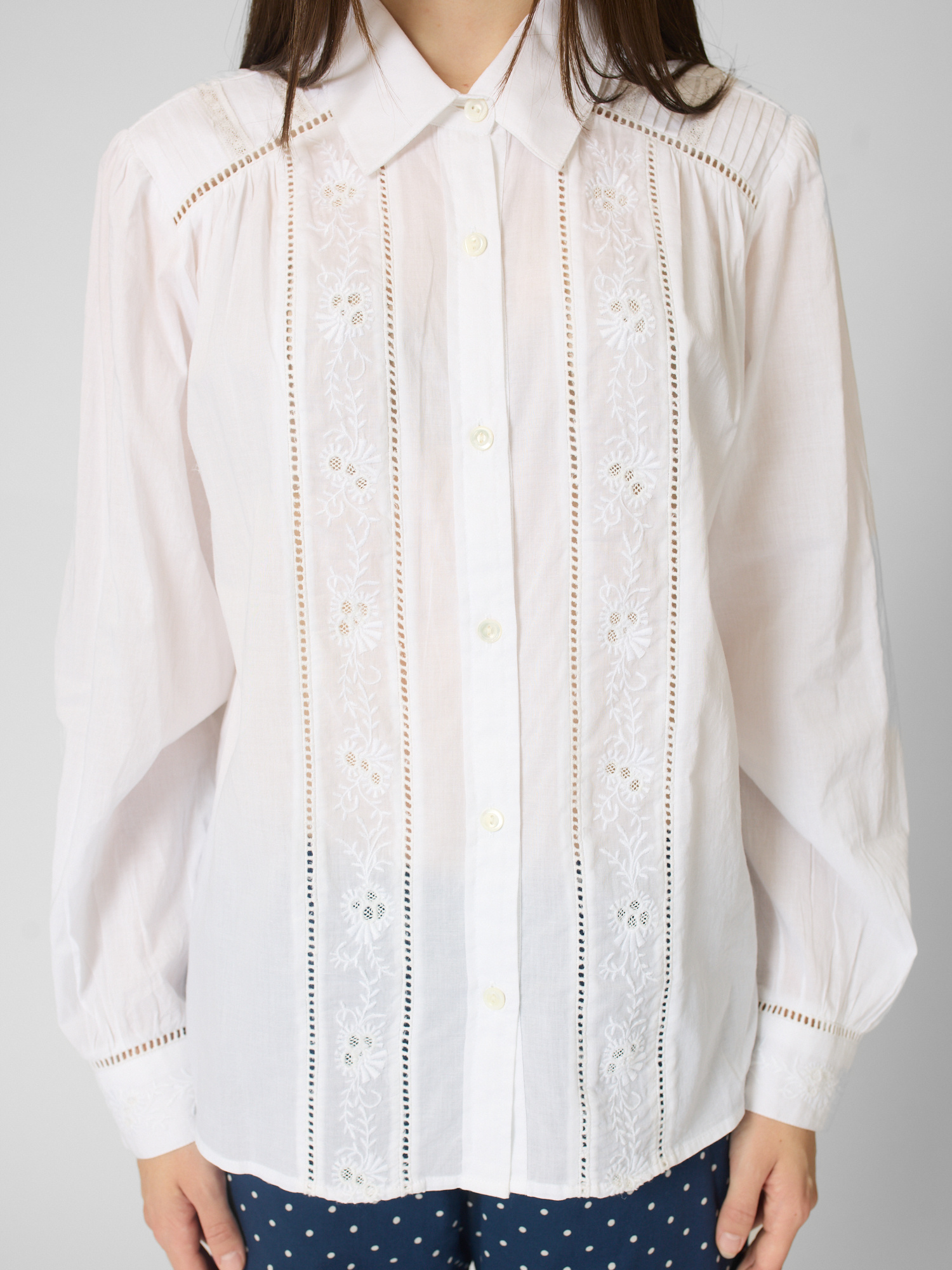 Superfine cotton voile button-front shirt features pintuck detailing, ladder trim, and embroidery.