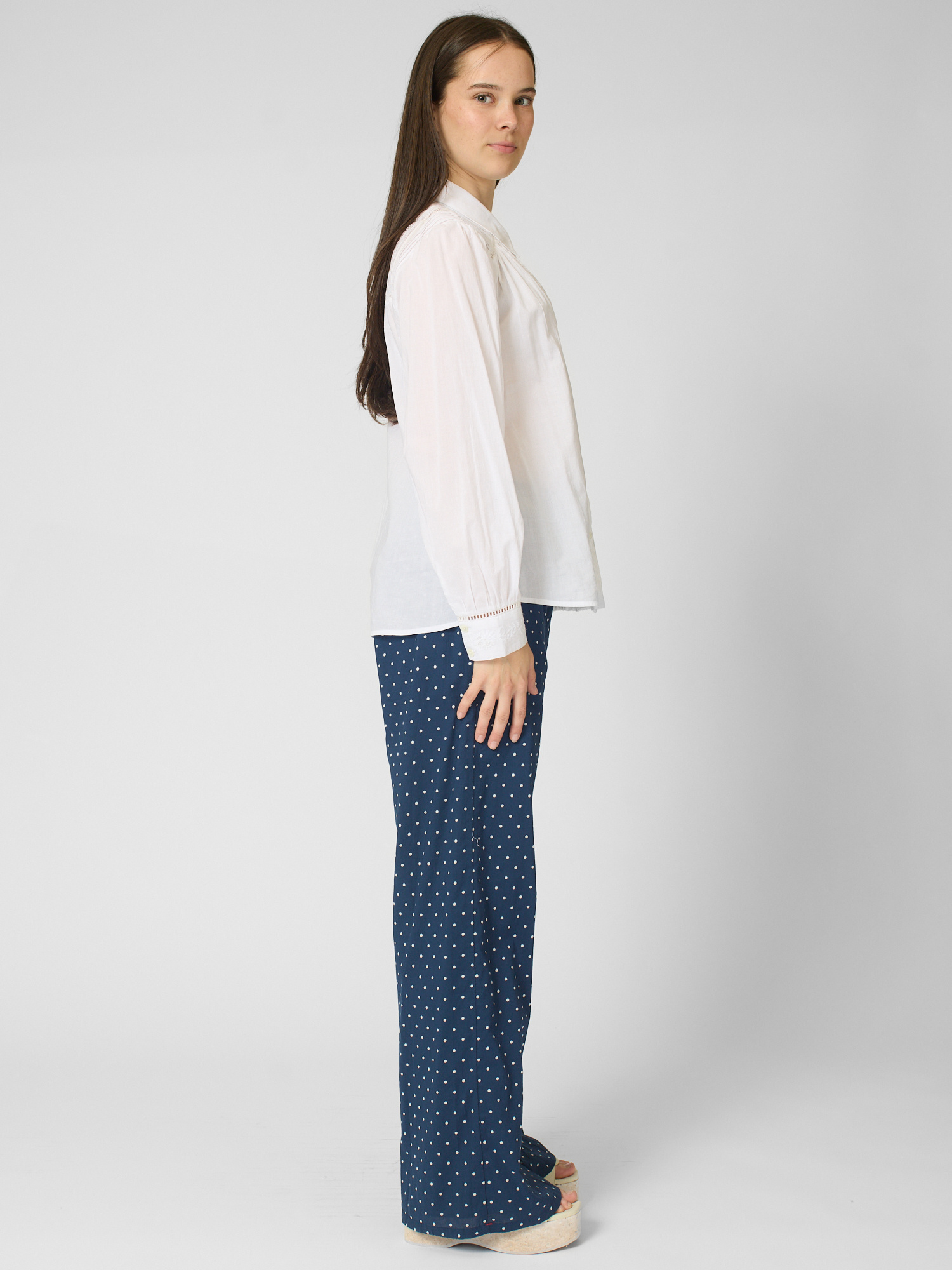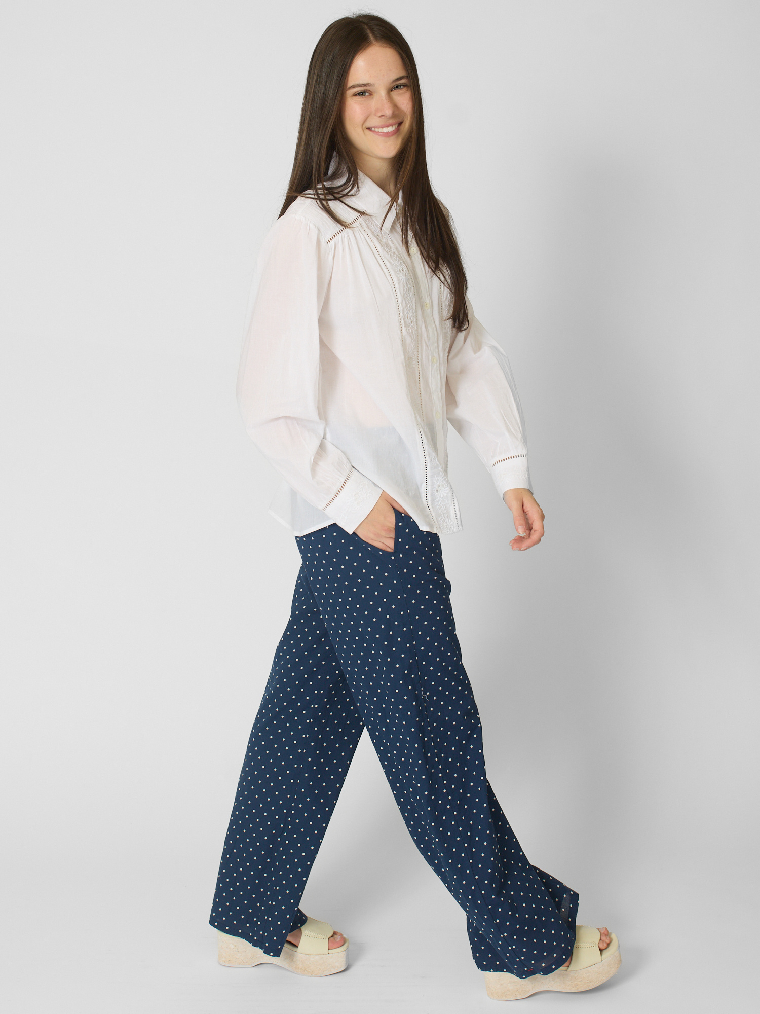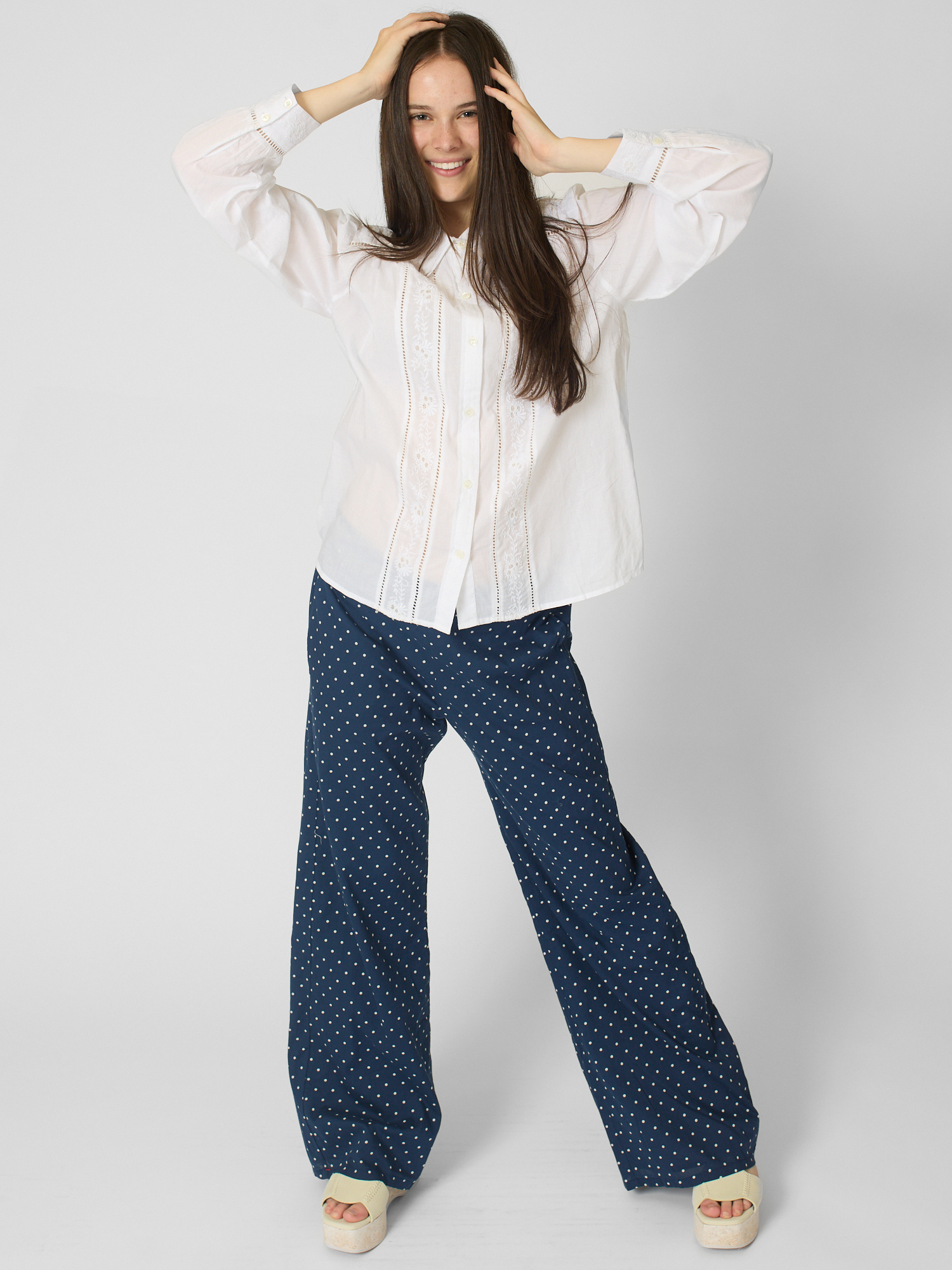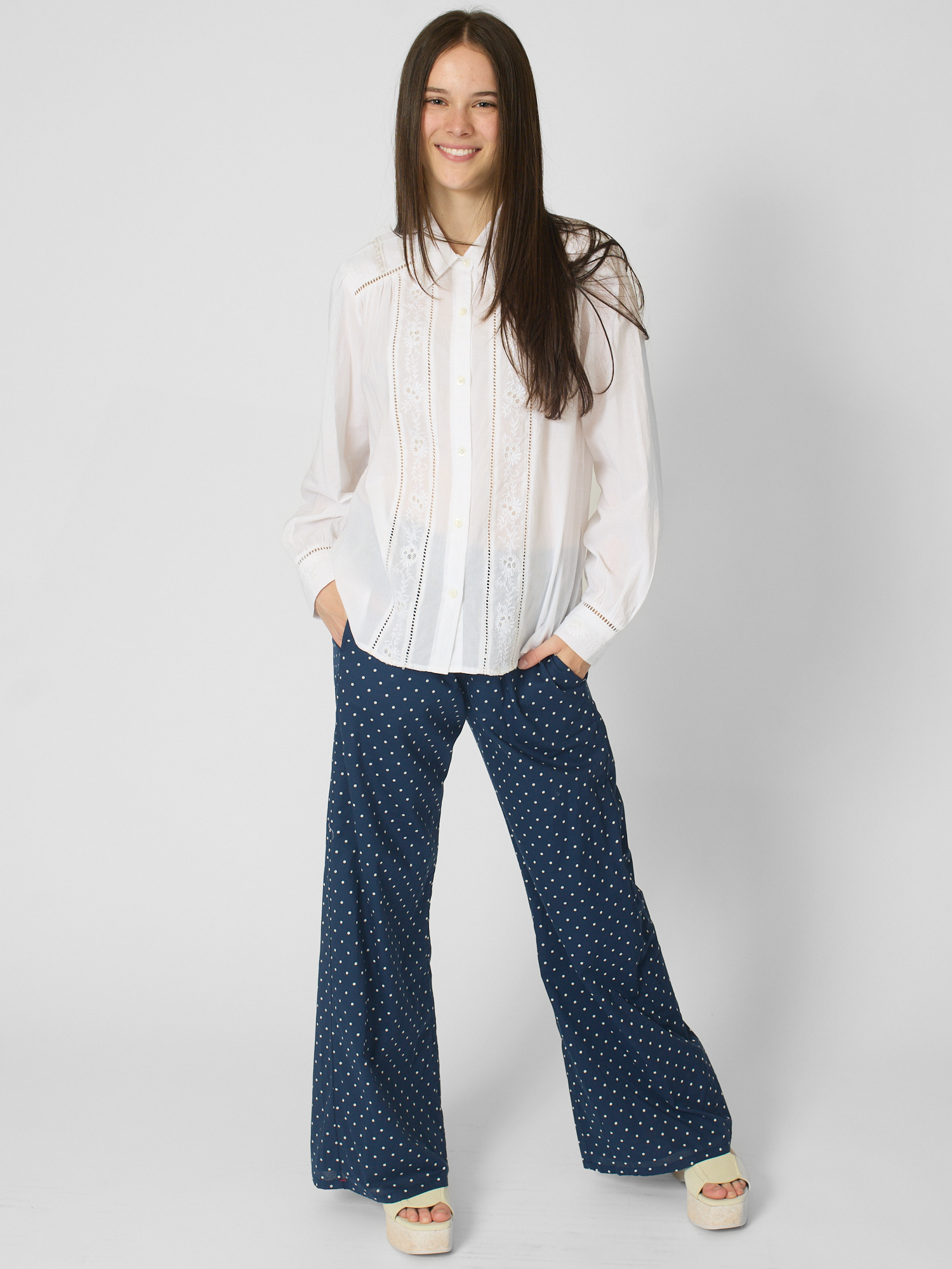 Superfine cotton voile button-front shirt features pintuck detailing, ladder trim, and embroidery.