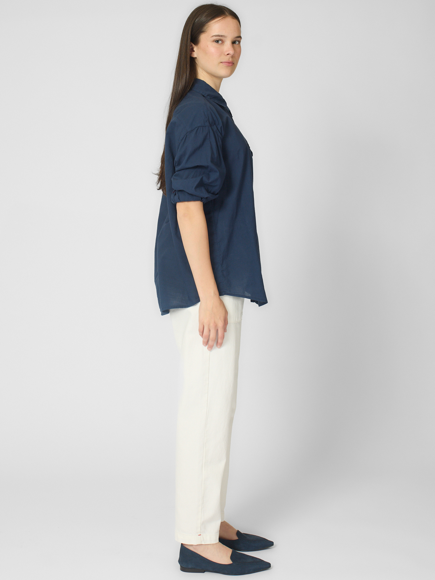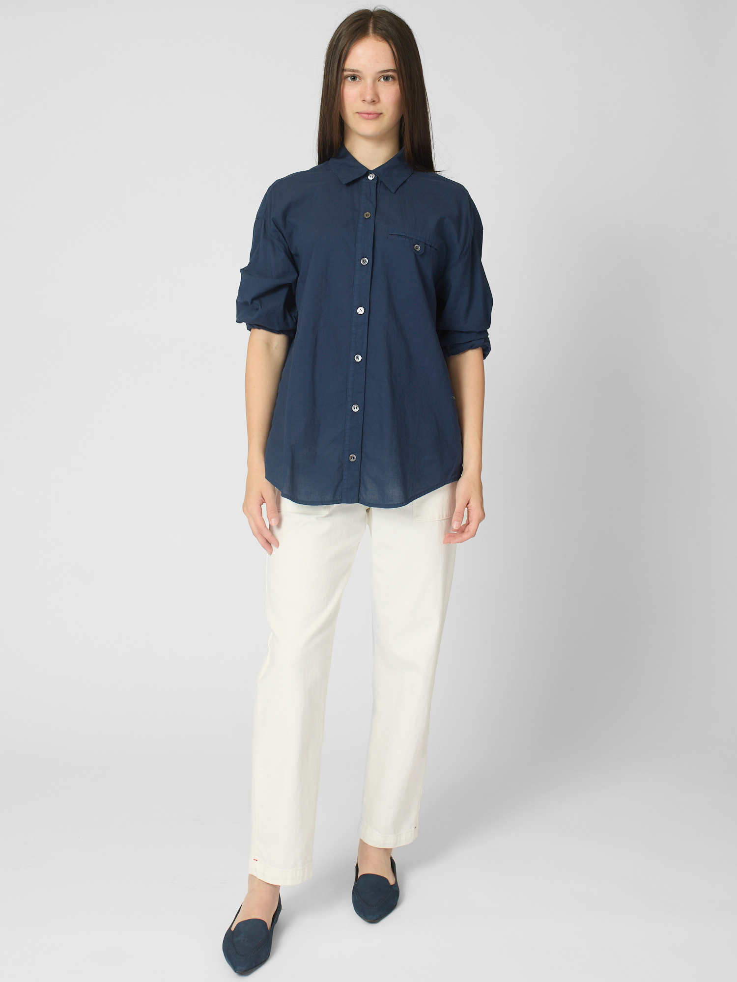 Oversized button-front shirt features a single chest pocket with button-tab detail and hidden side buttons at the hem.