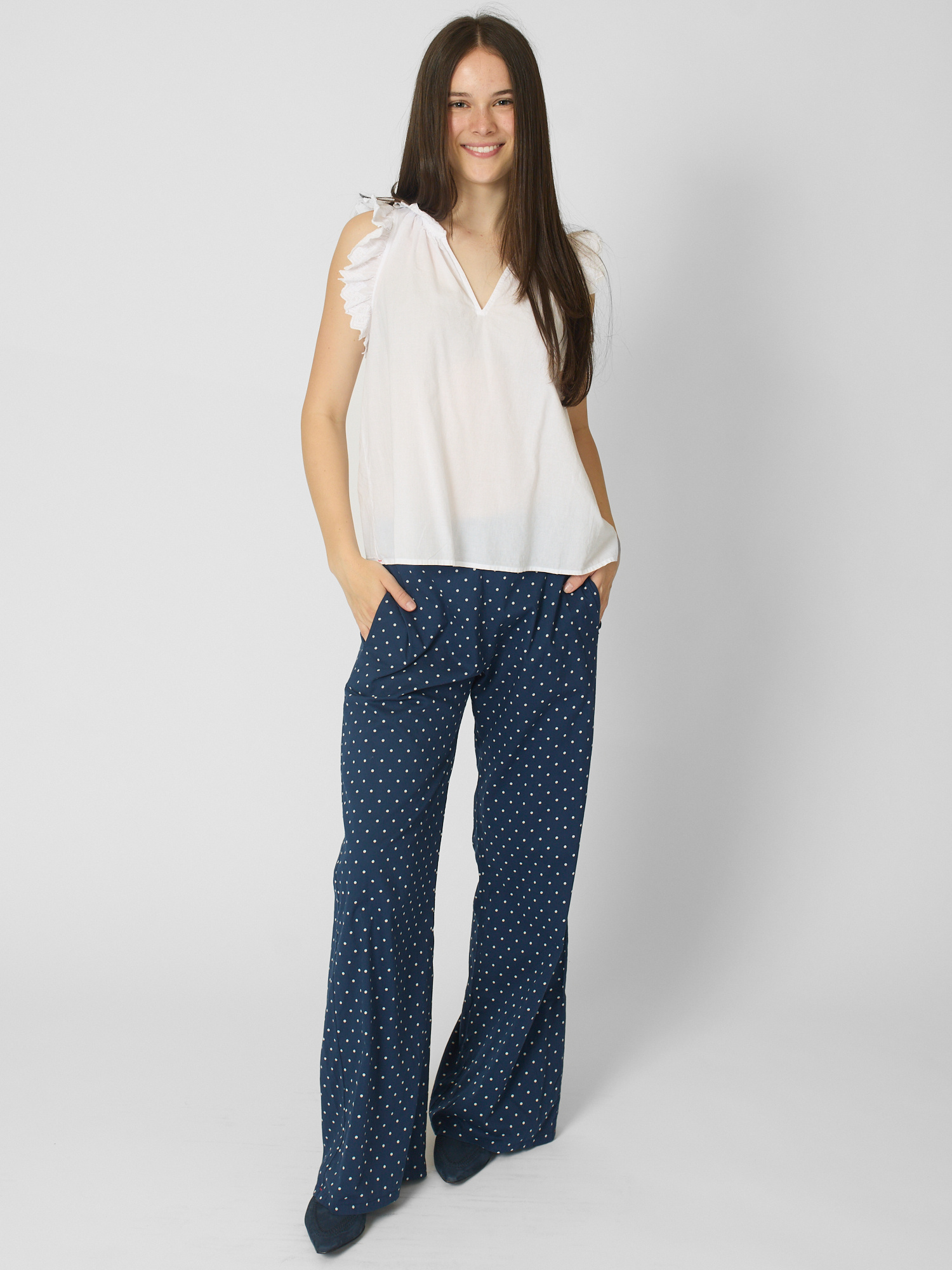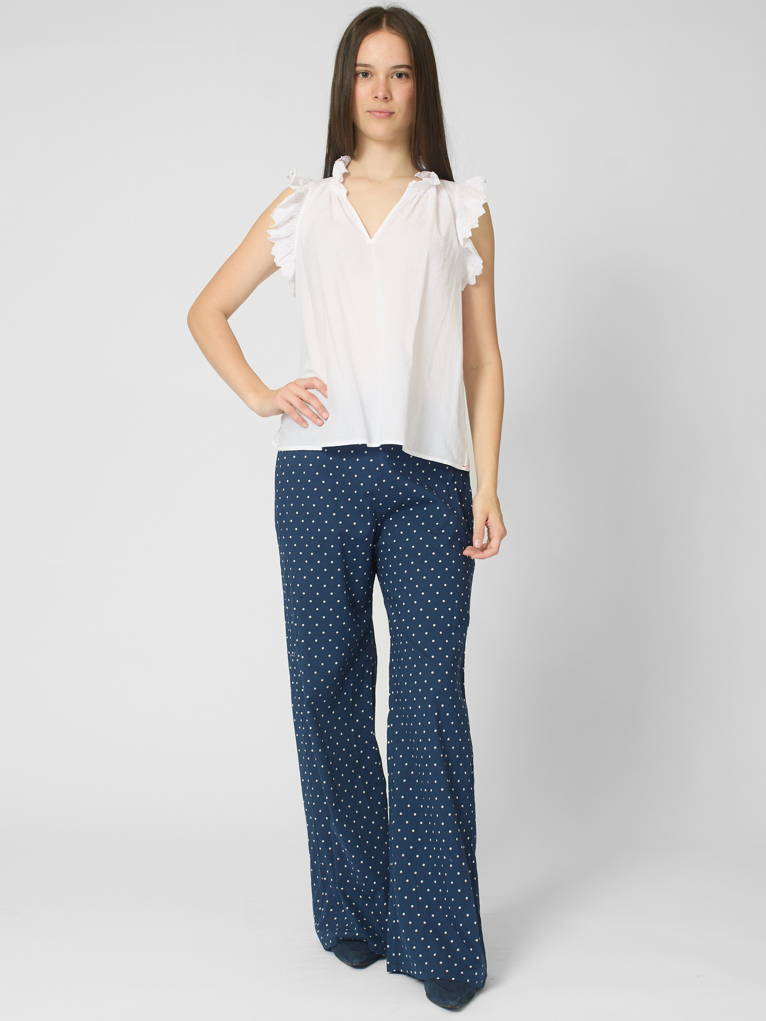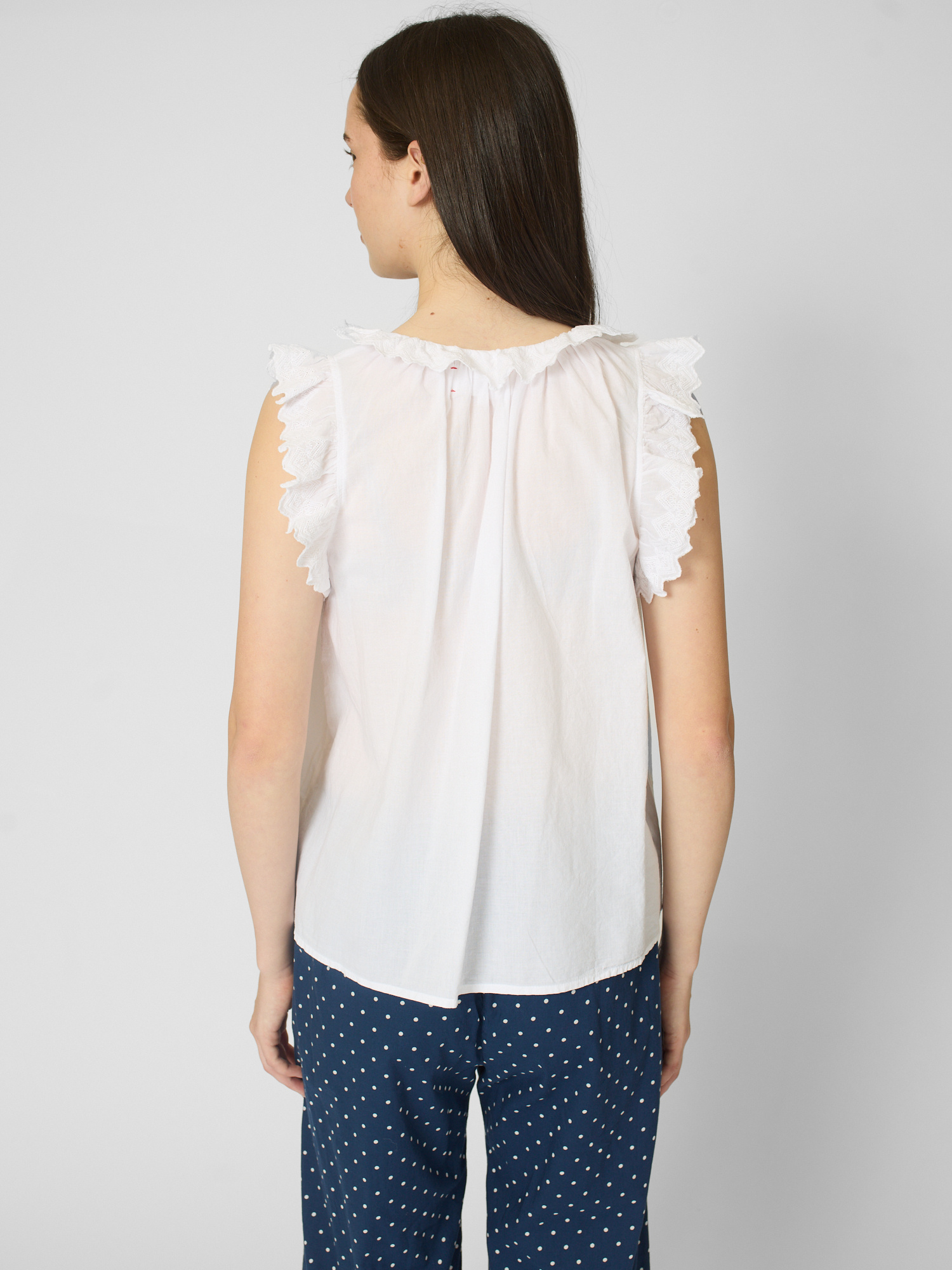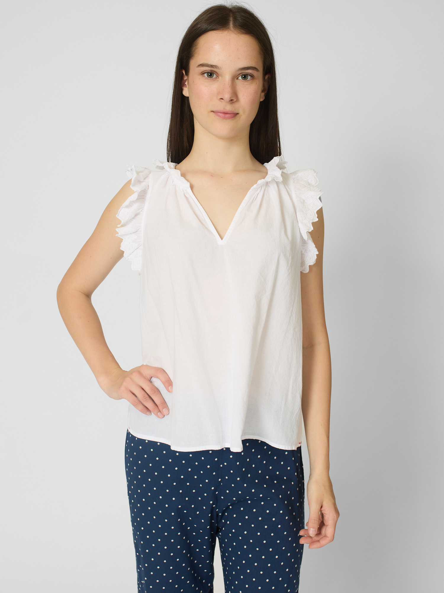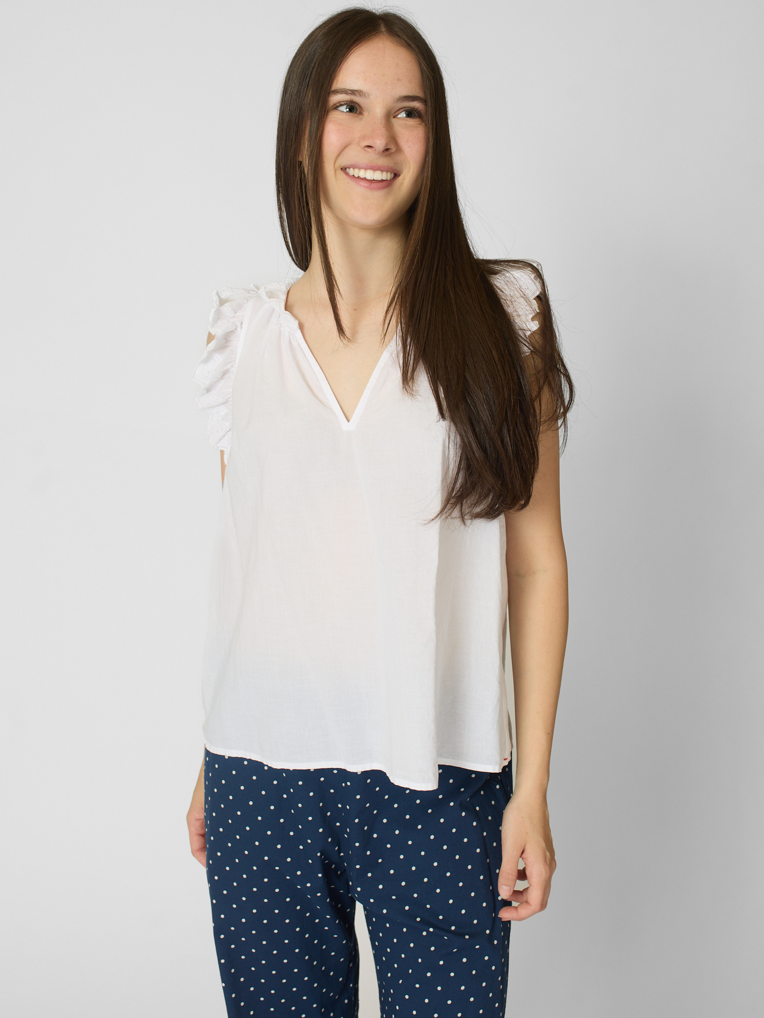 This top features a deep V-neck, ruffle detailing with embroidered lace trim, and soft shirring throughout.