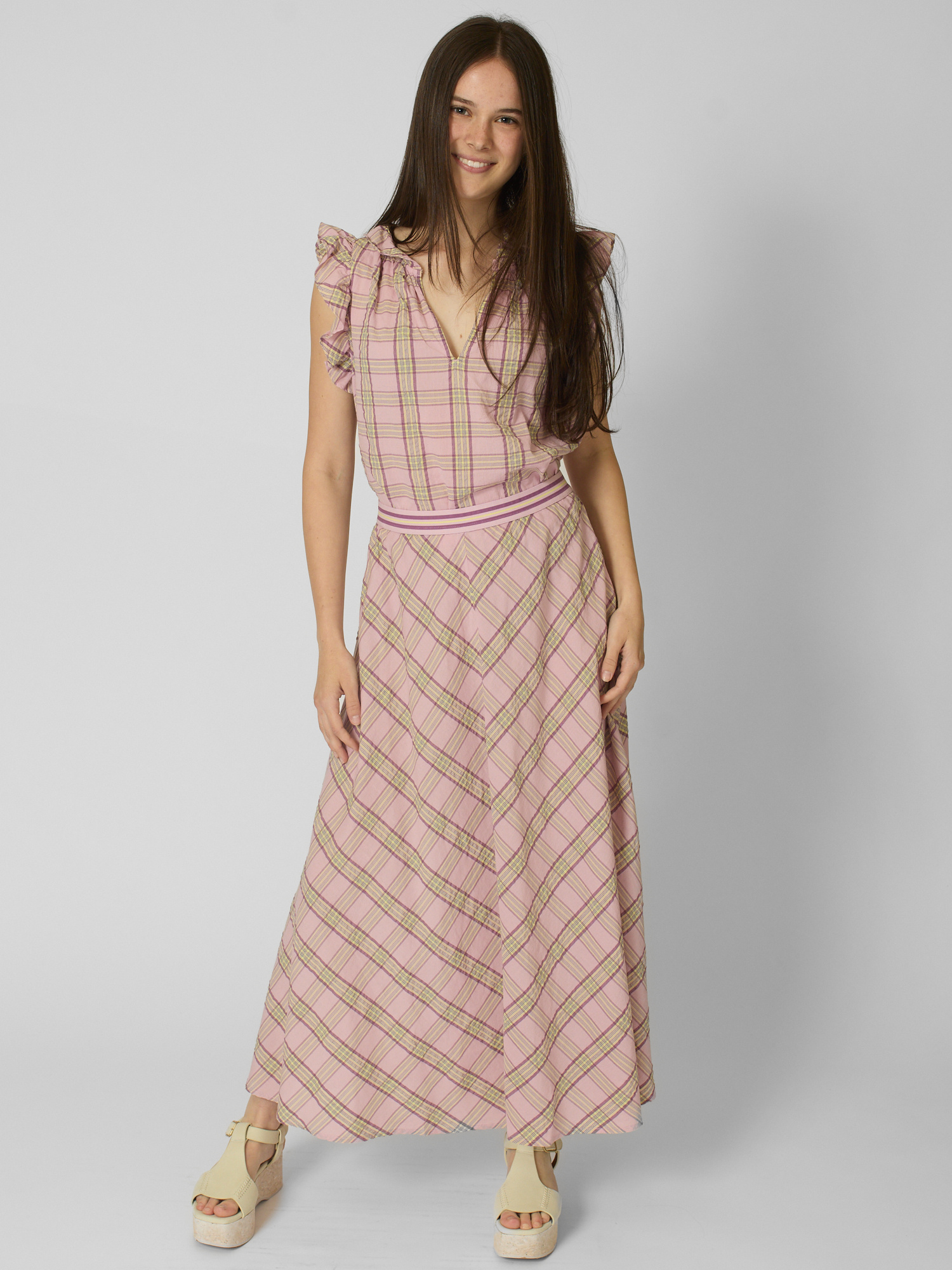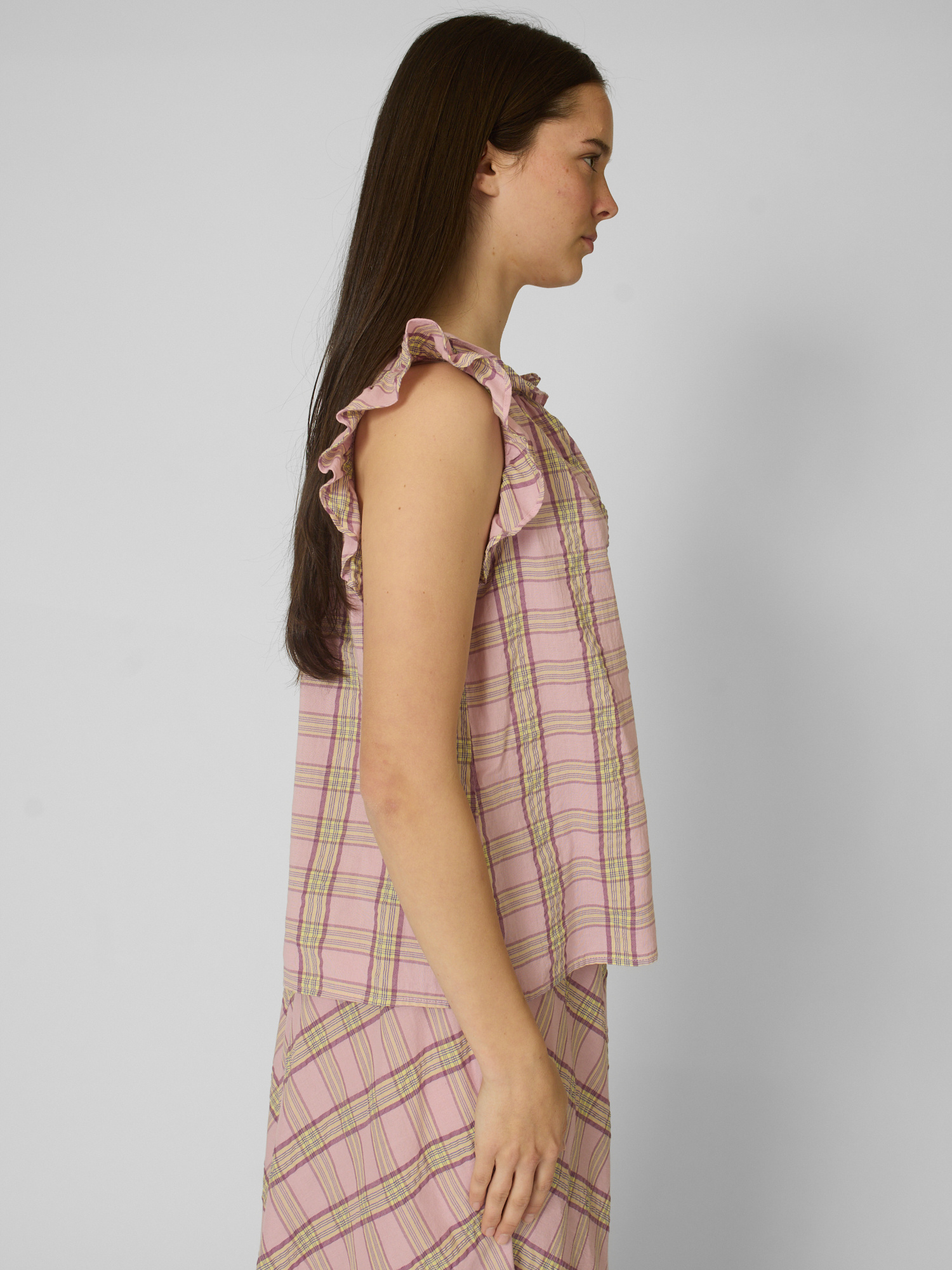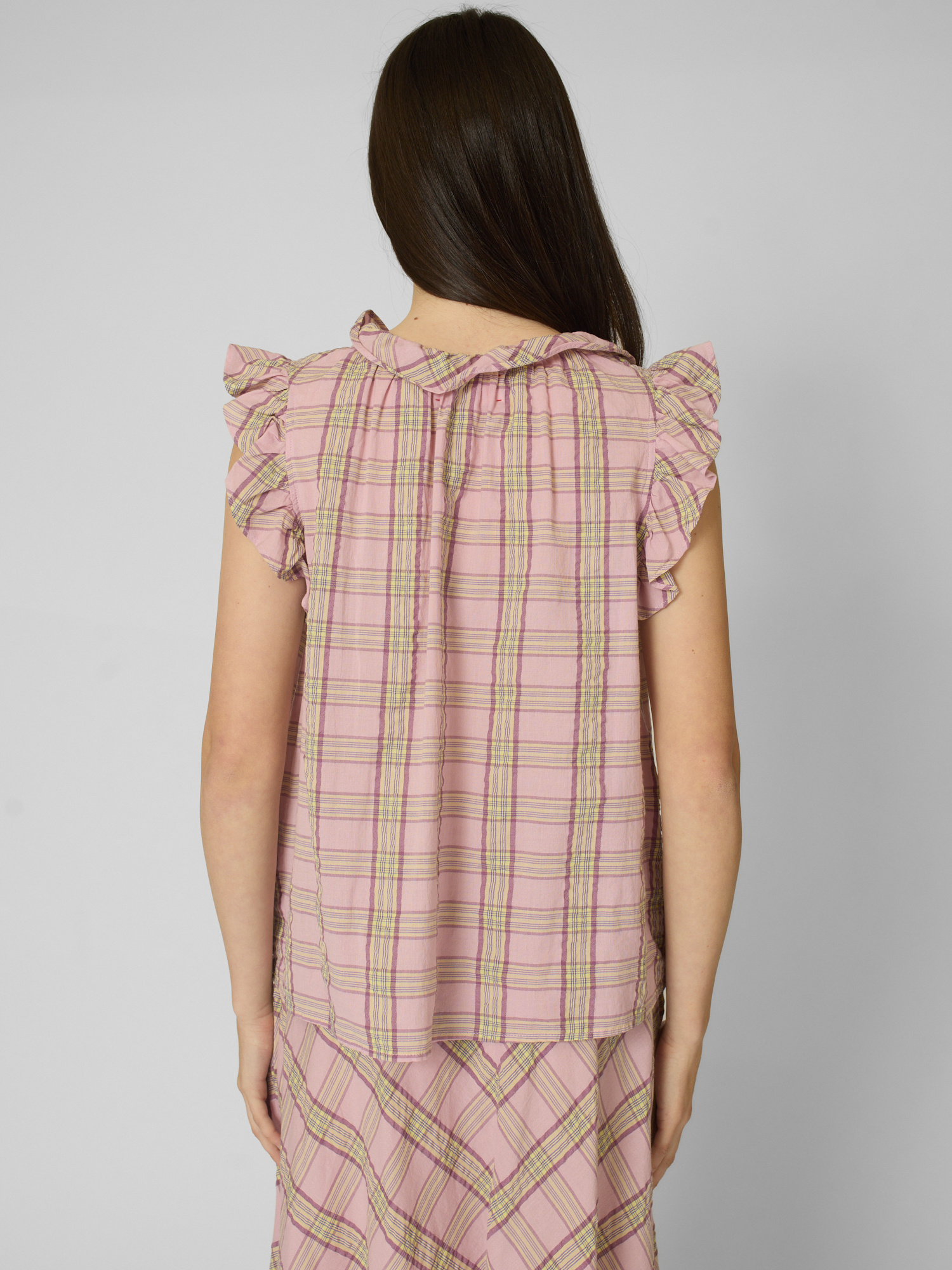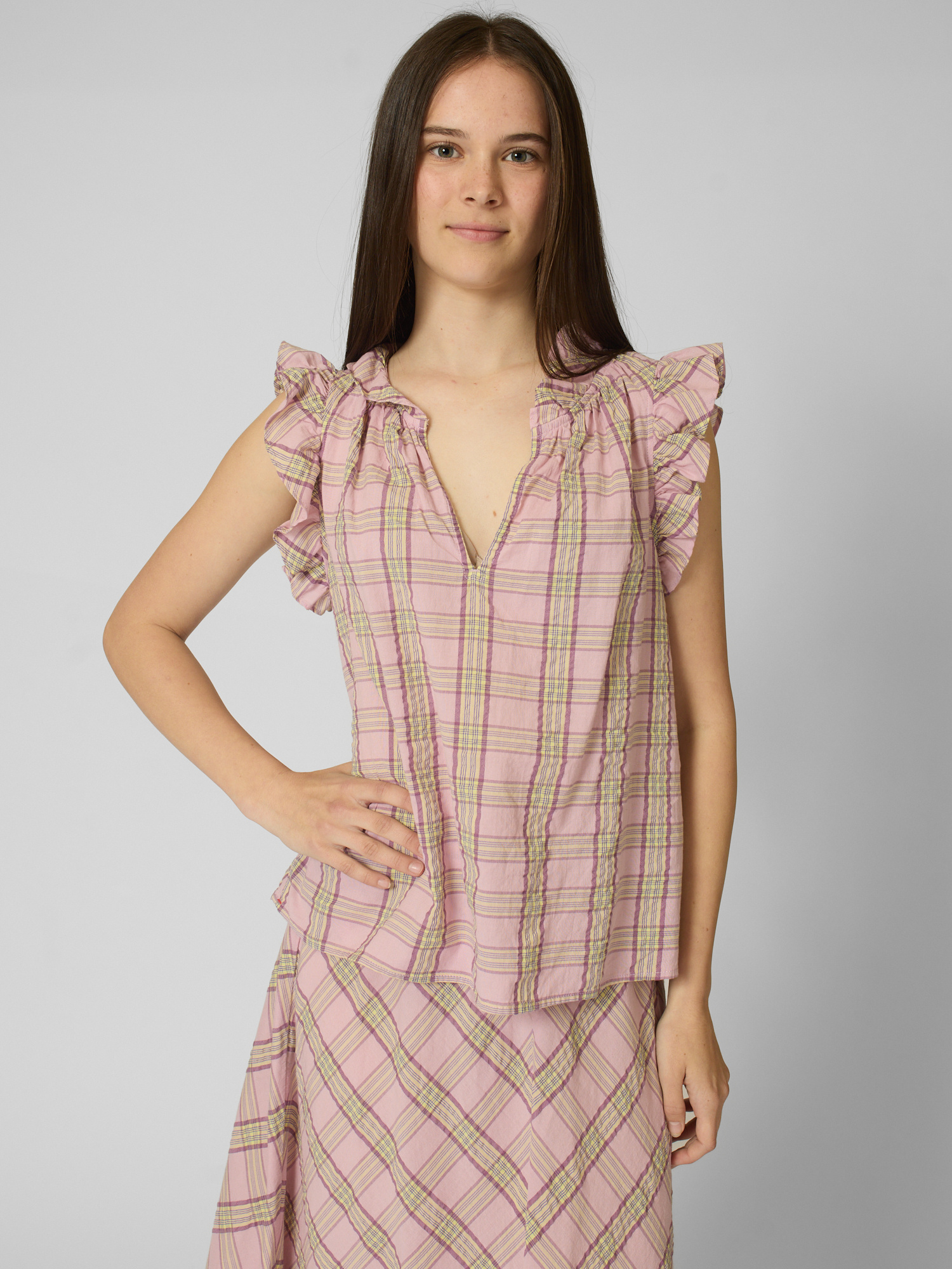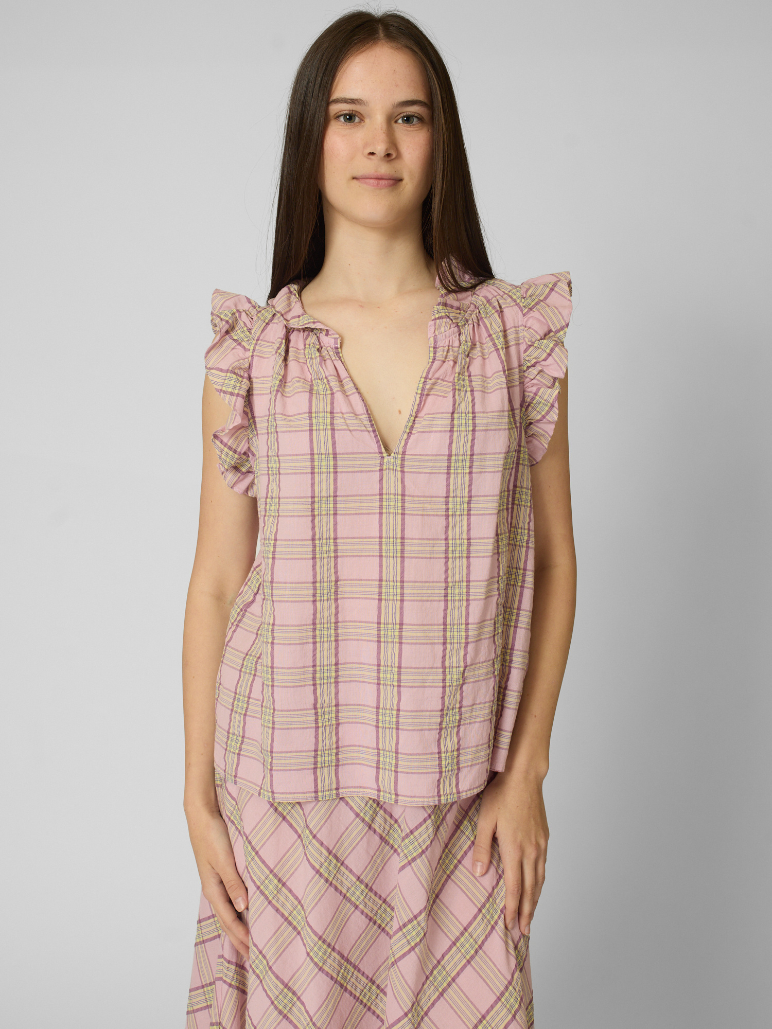 Cotton plaid popover top has a deep V-neck, ruffle detailing, and shirring throughout.