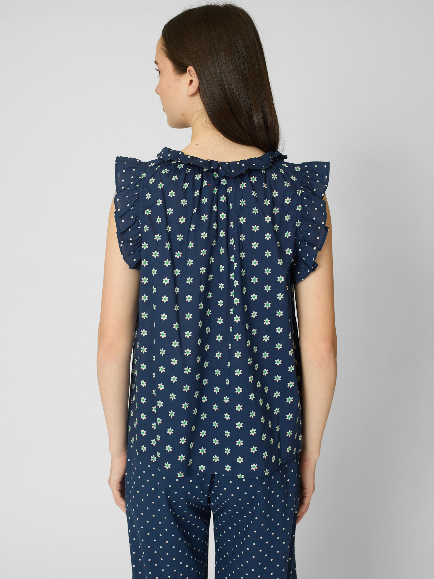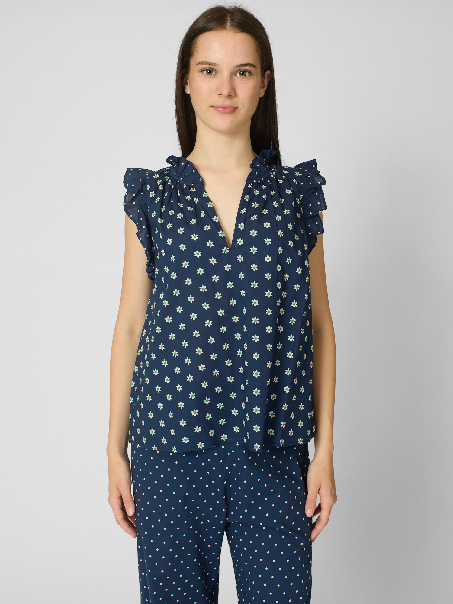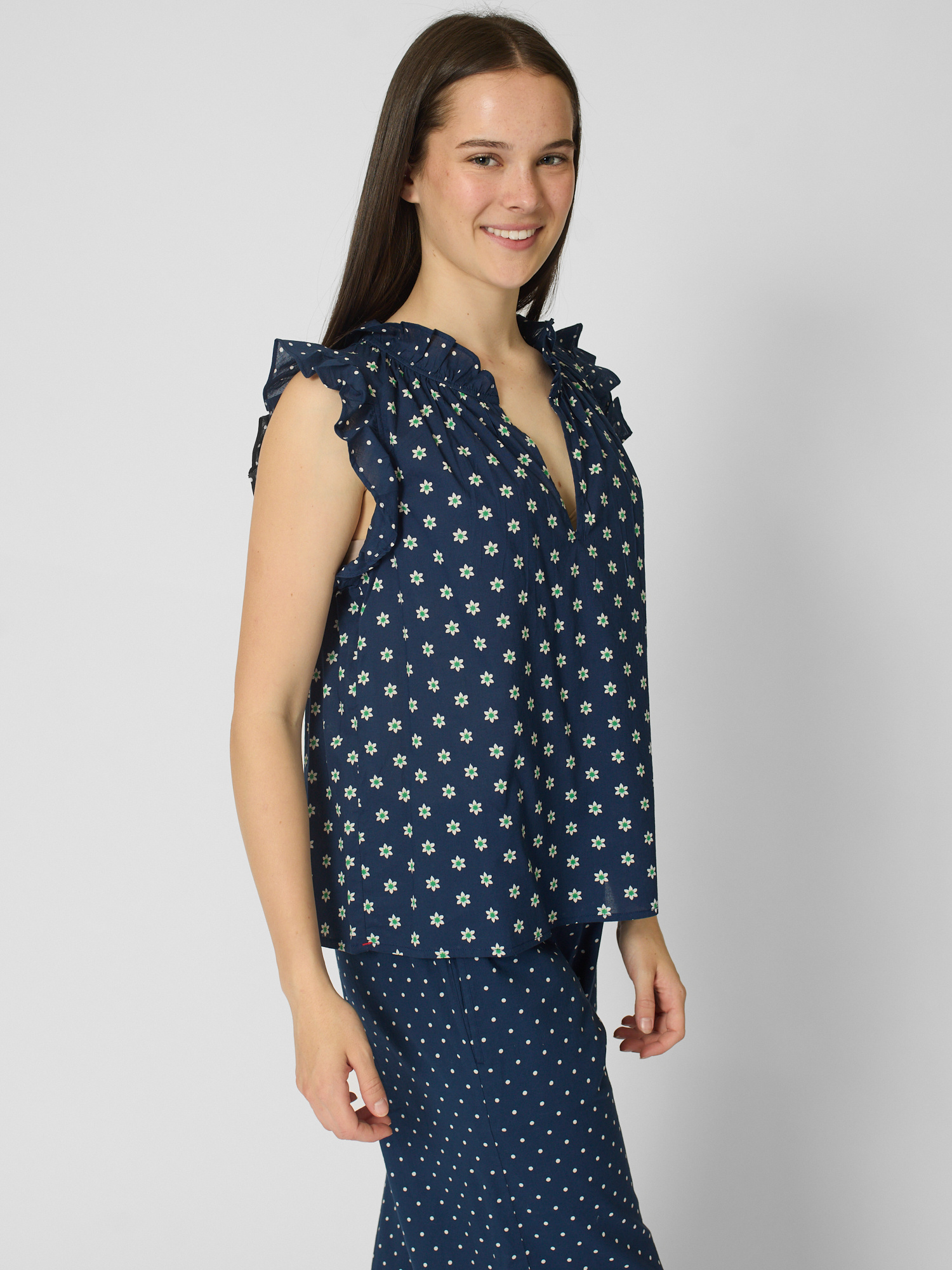 Daisy and polka dot mixed popover has a deep V-neck, ruffle detailing, and shirring throughout.