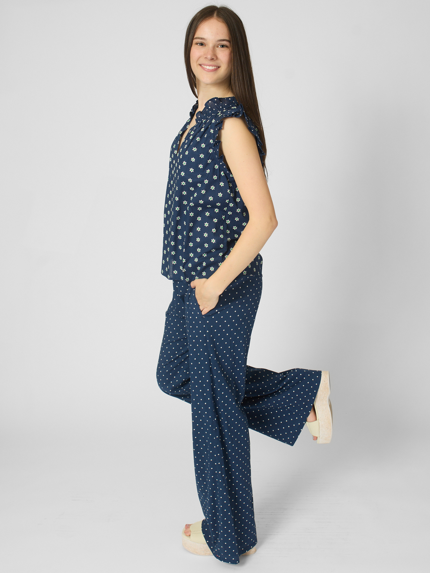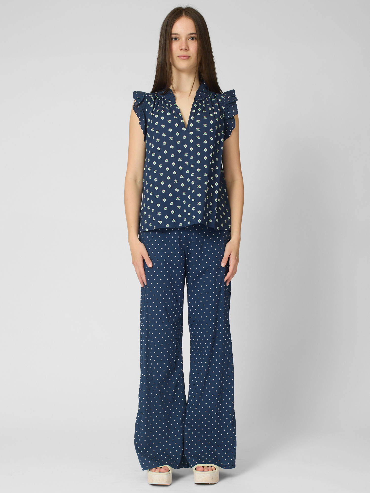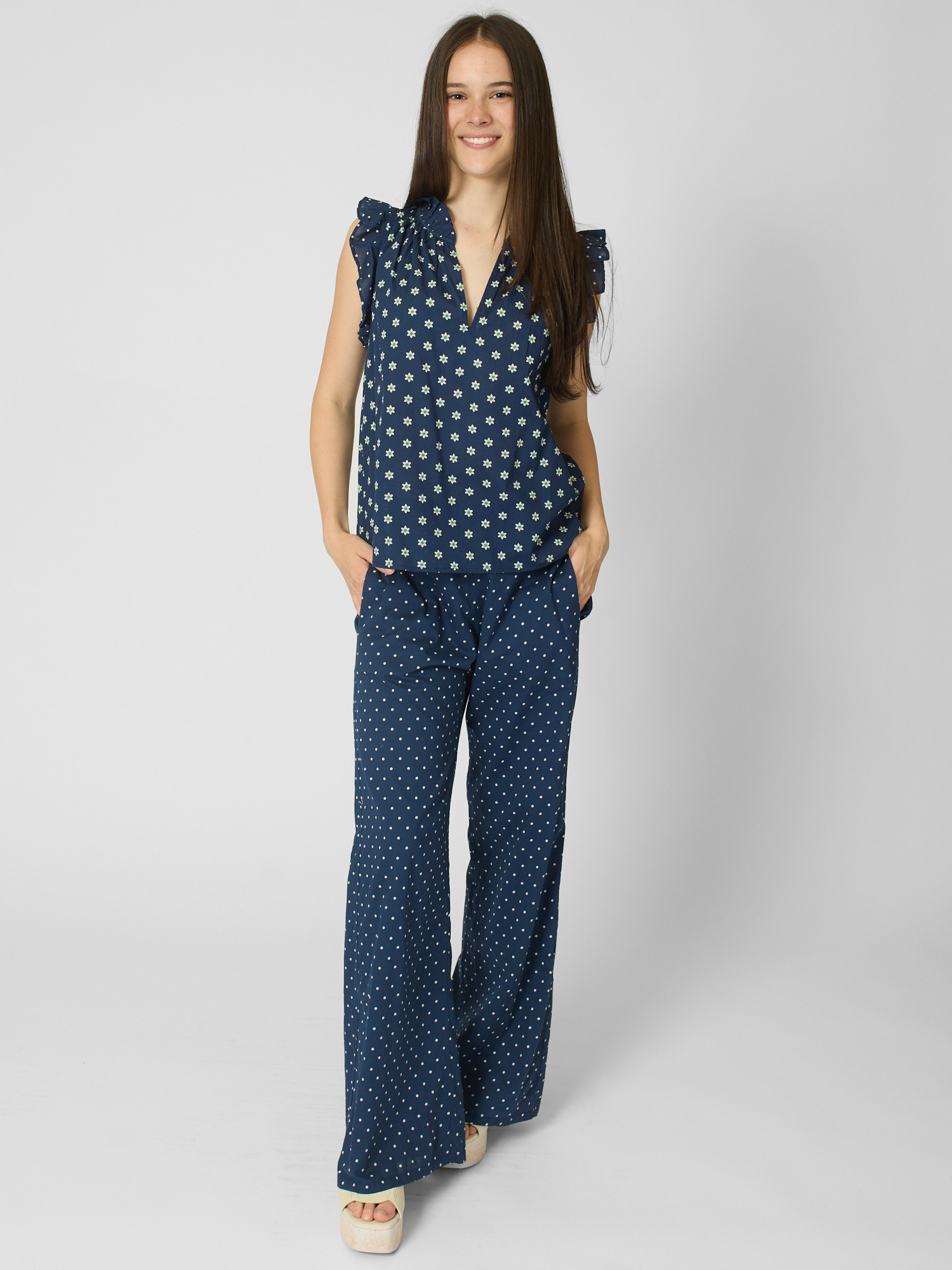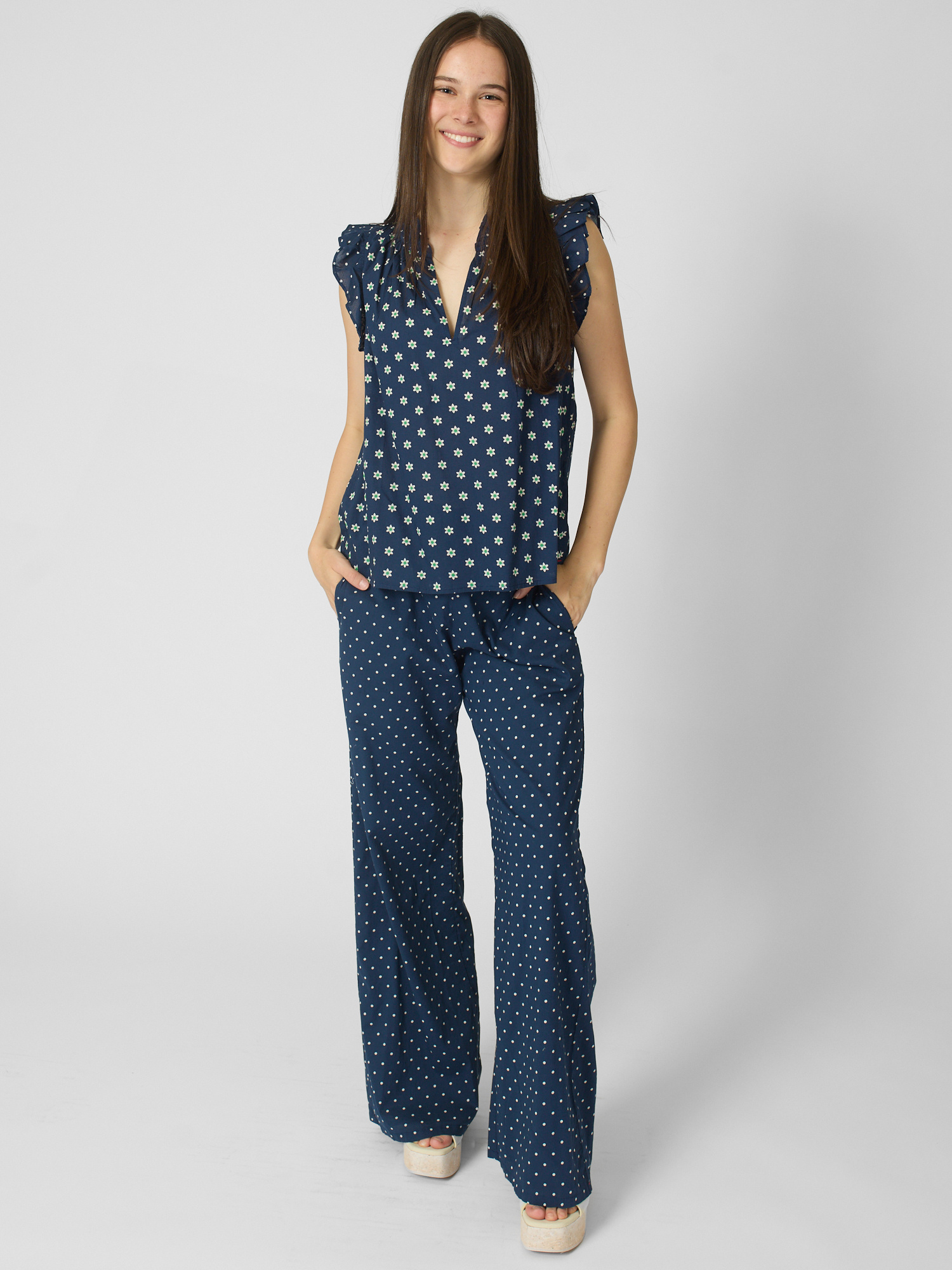 Daisy and polka dot mixed popover has a deep V-neck, ruffle detailing, and shirring throughout.