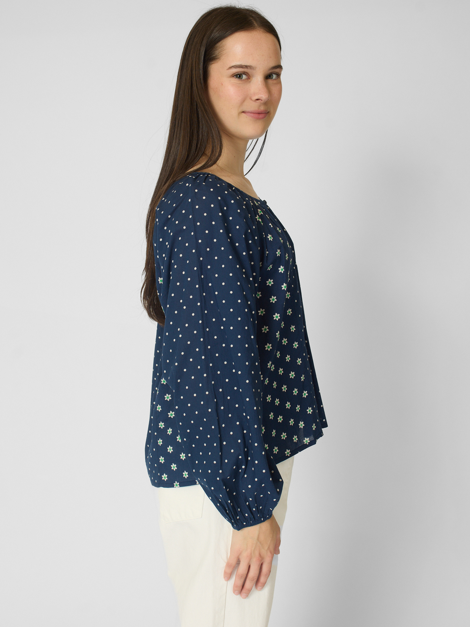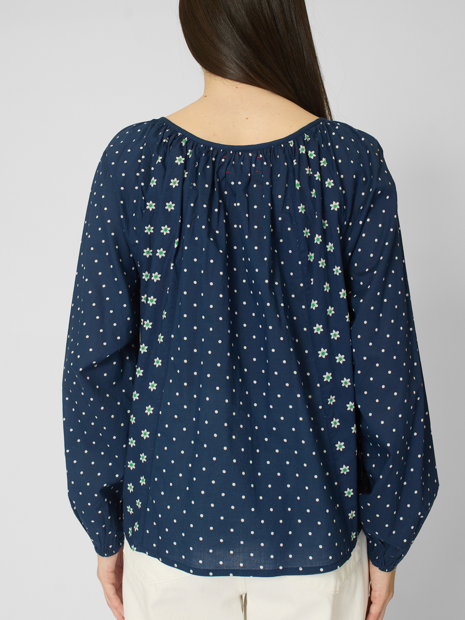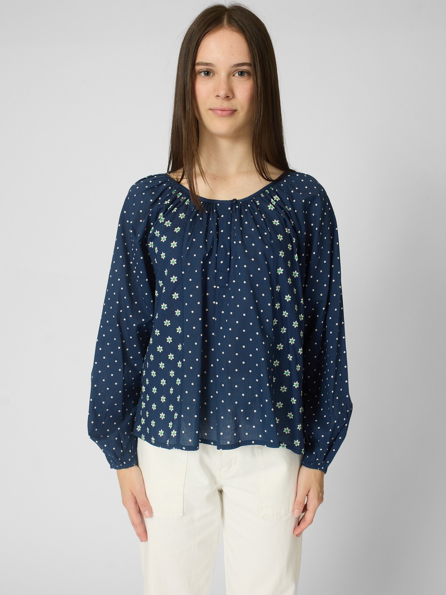 Polkadot blouse features a V-neck with button closure and shirred blouson sleeves with elasticized cuffs.