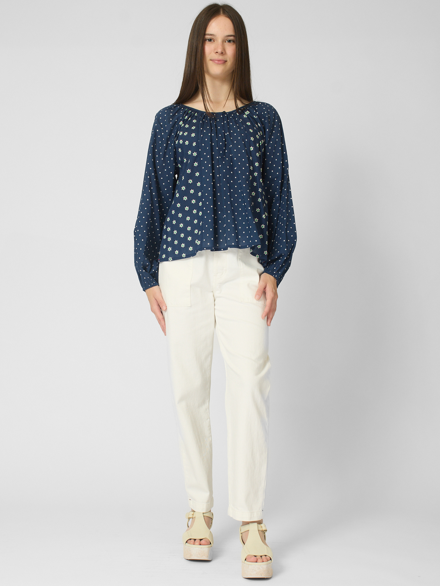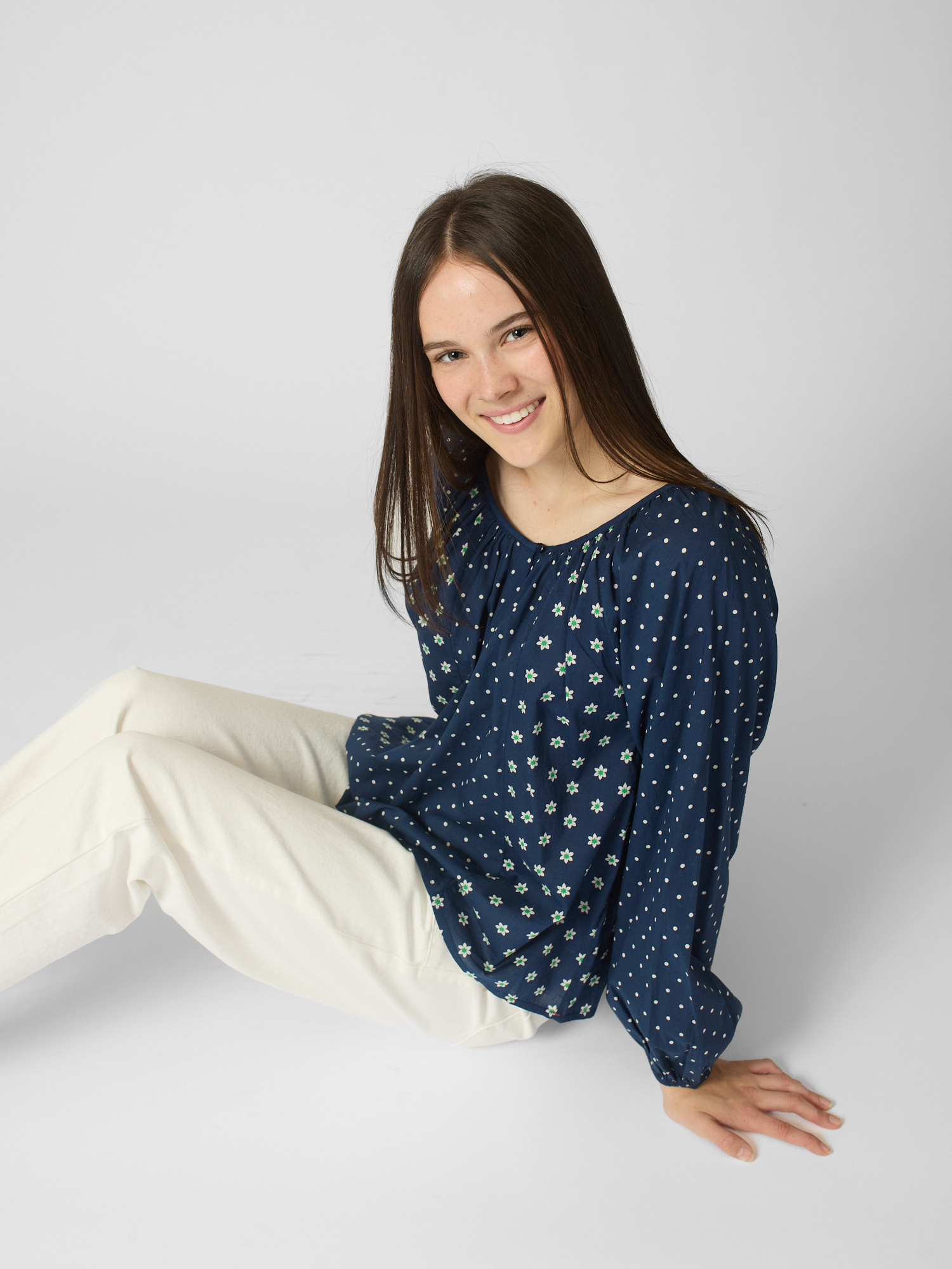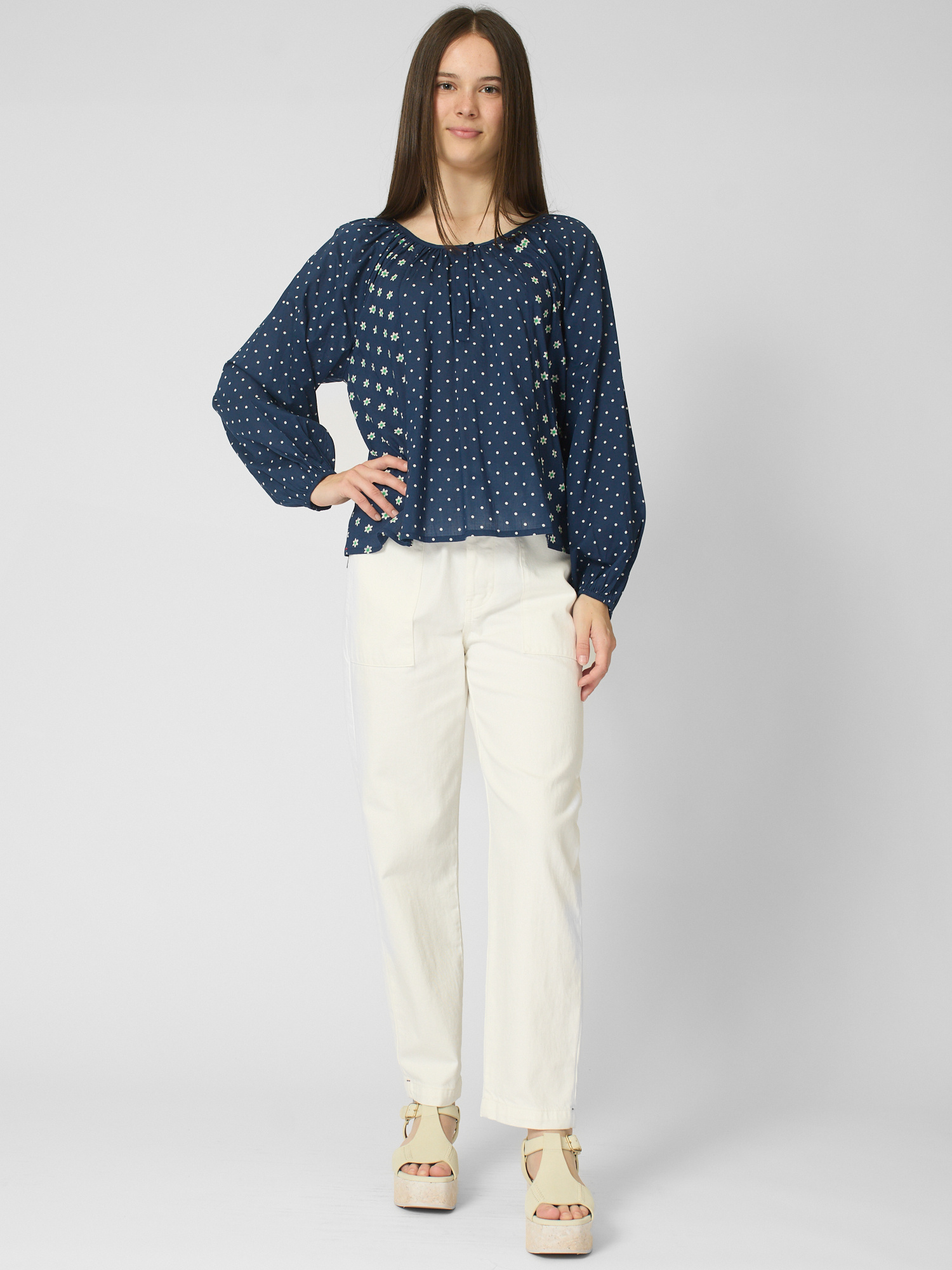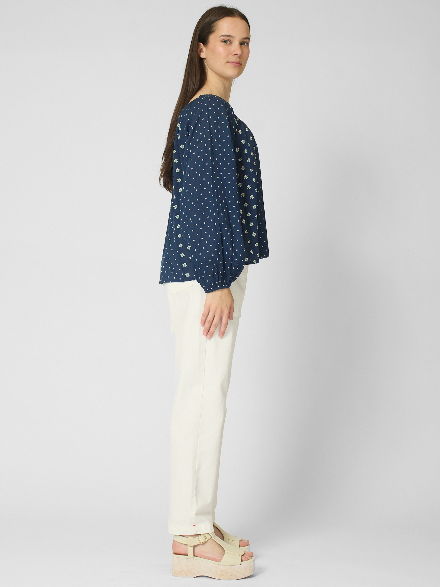 Polkadot blouse features a V-neck with button closure and shirred blouson sleeves with elasticized cuffs.