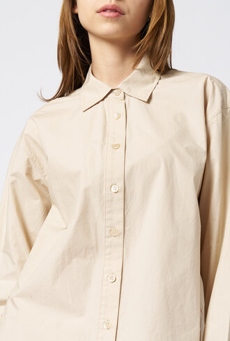 The crisp paper poplin oversized button-front shirt features a back yoke and high-low shirttail hem.