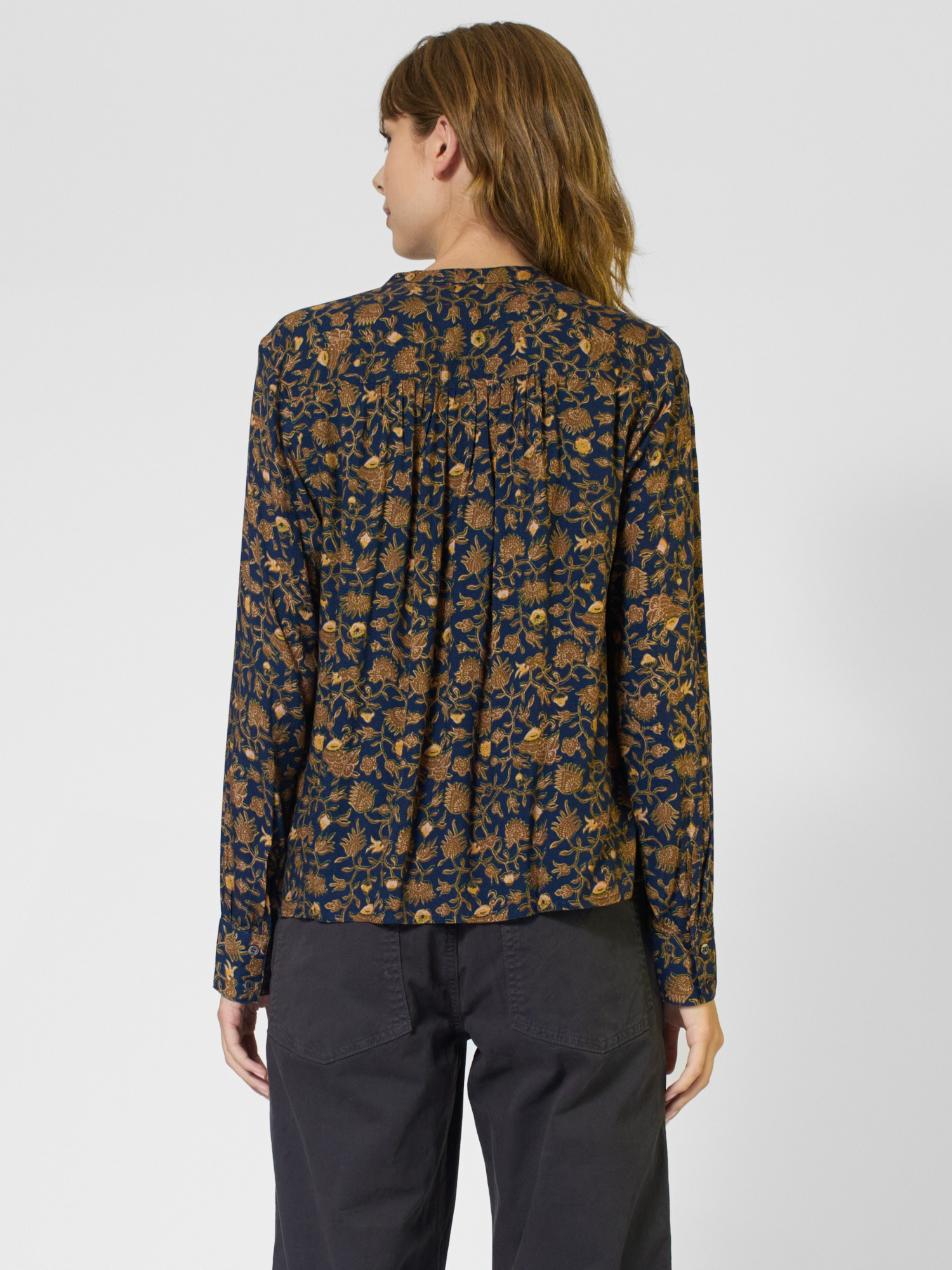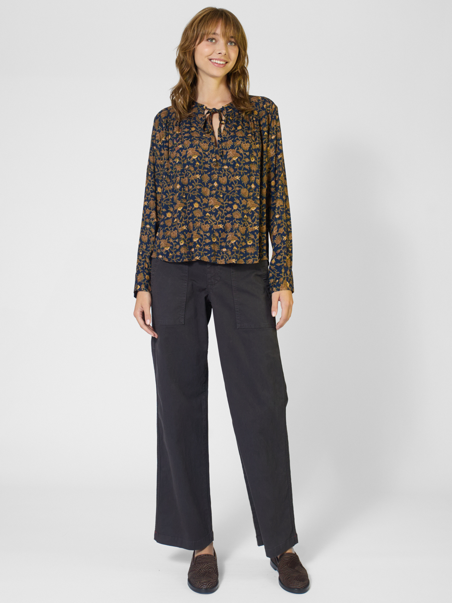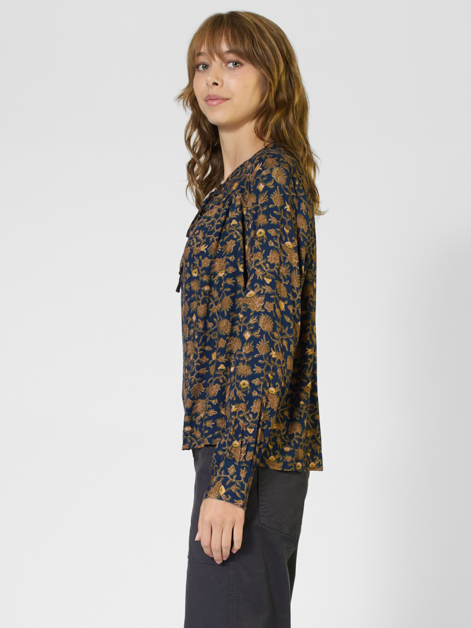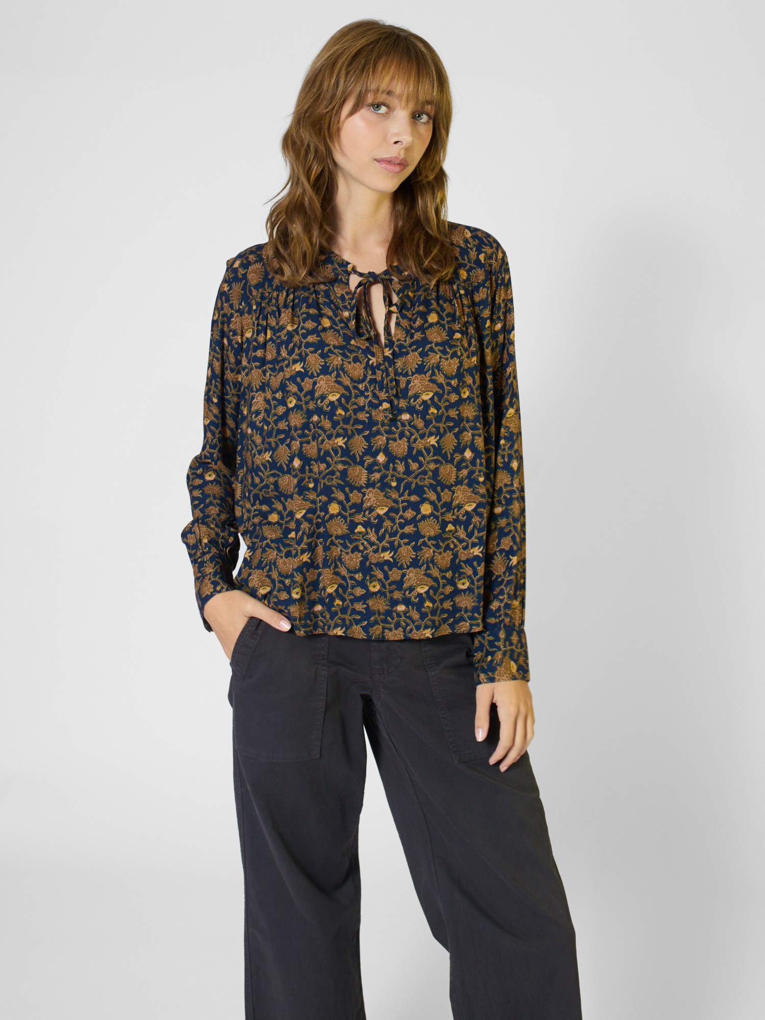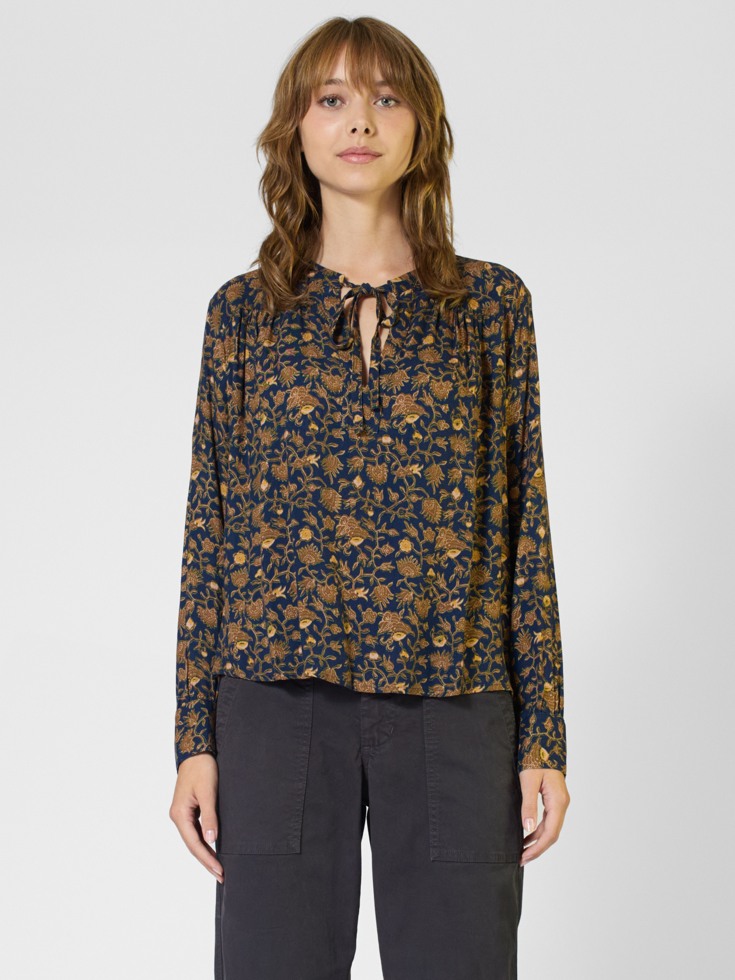 Floral print blouse features a split neck with self-tie detail and shirred front and back yokes.
