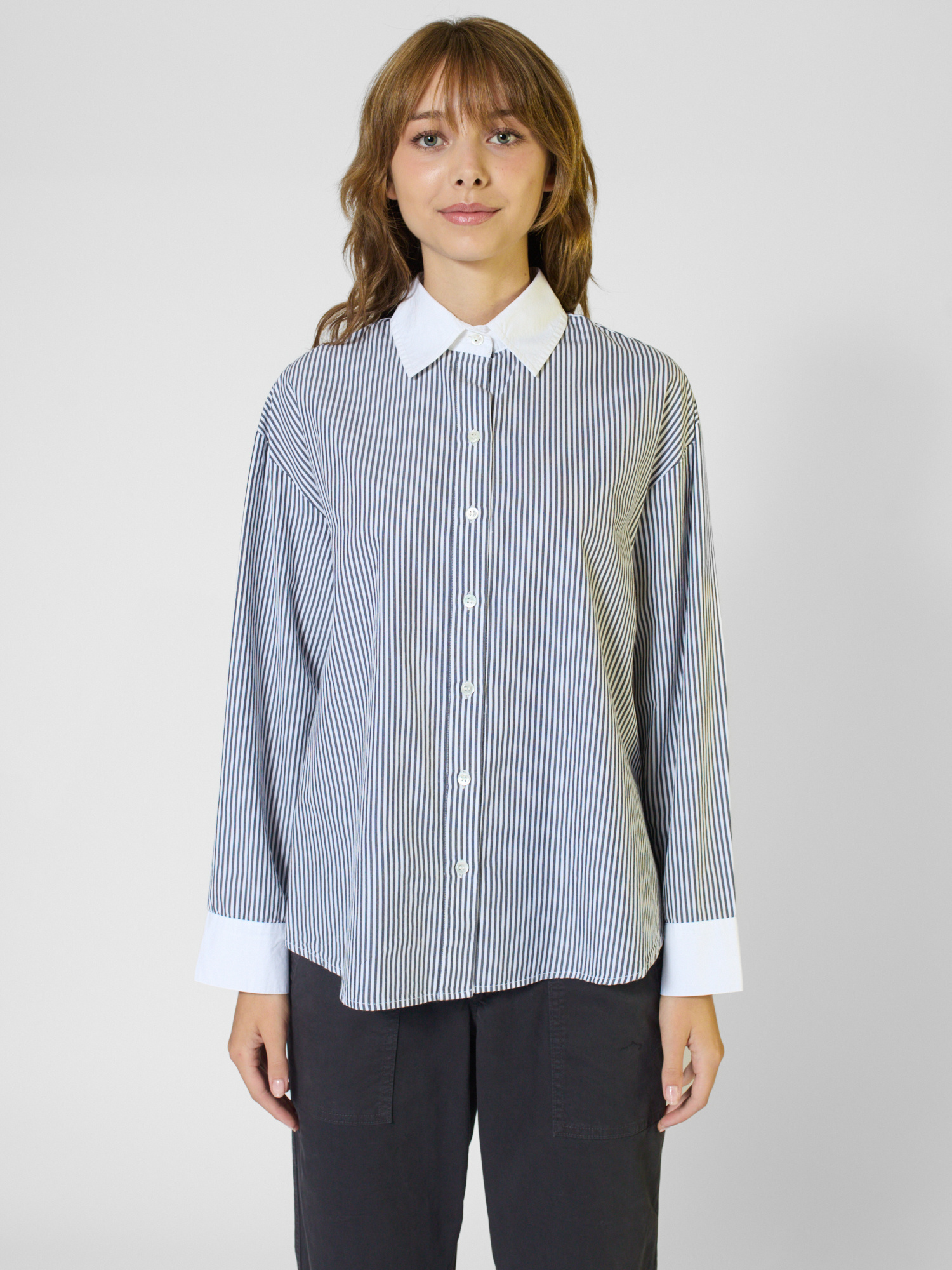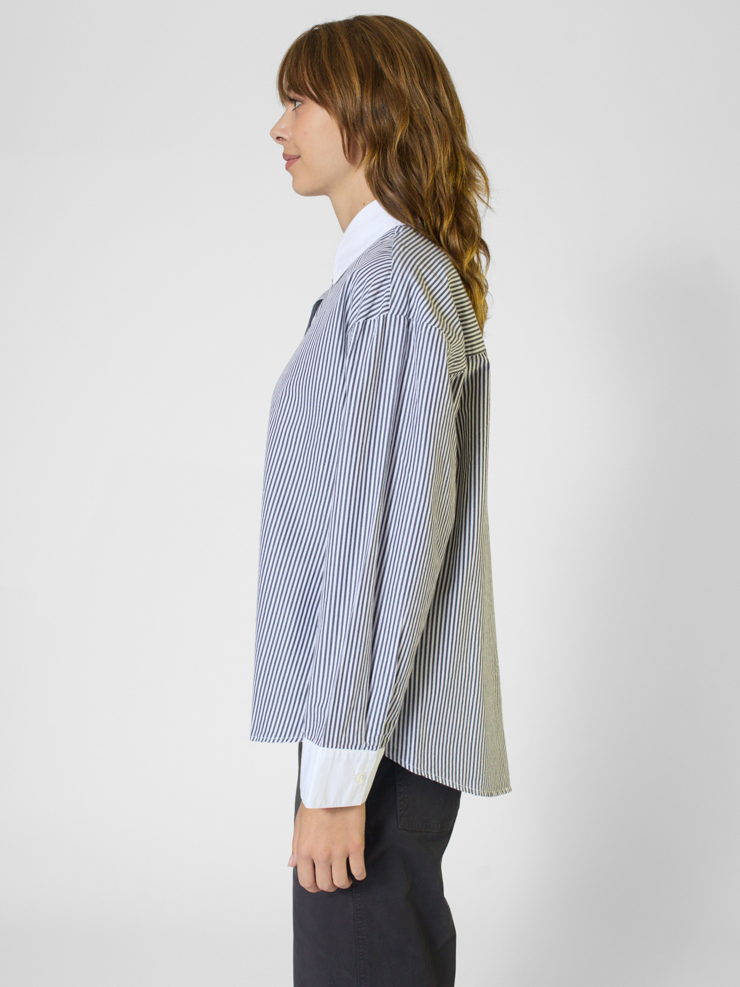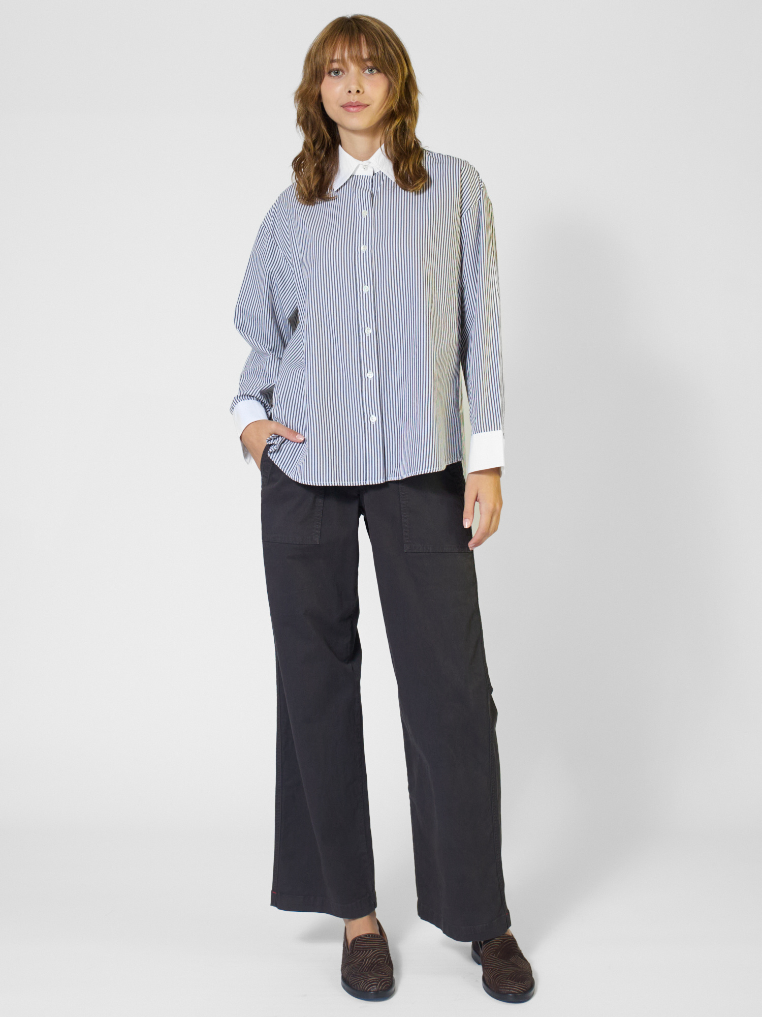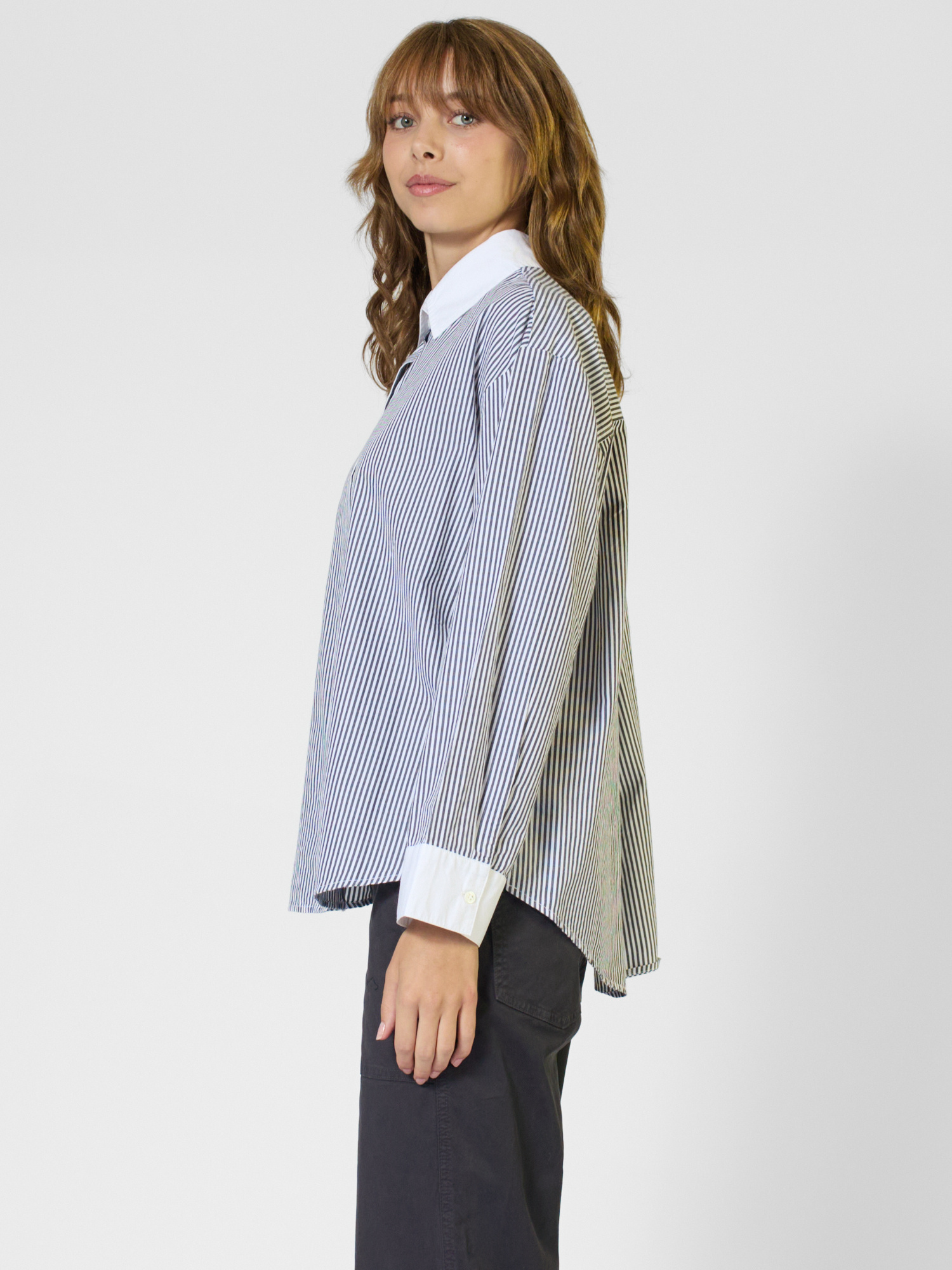 The relaxed button-front shirt has a structured feel and features a contrast white collar and cuffs, high-low hem with side slits, and a back yoke with an inverted pleat.
