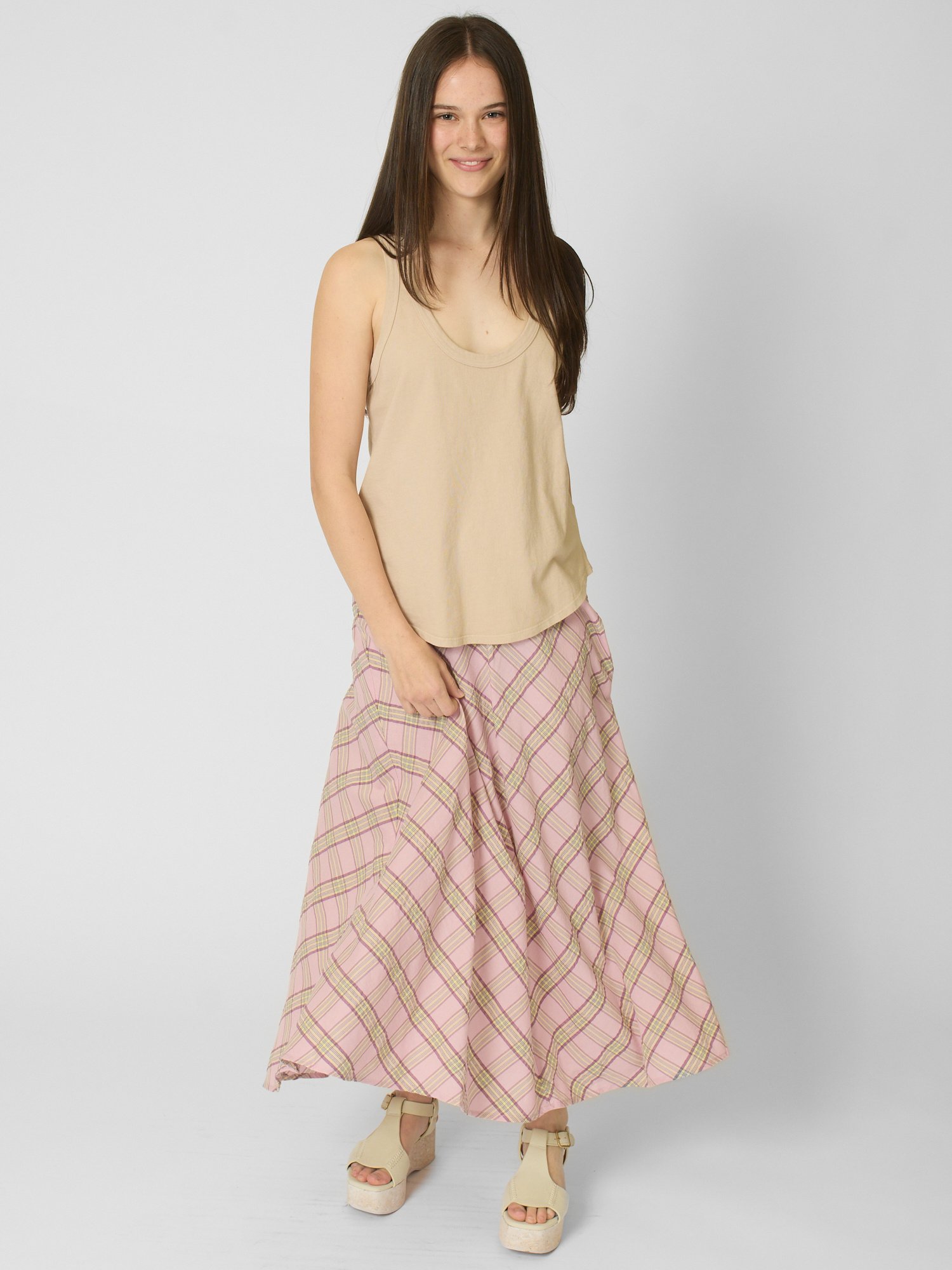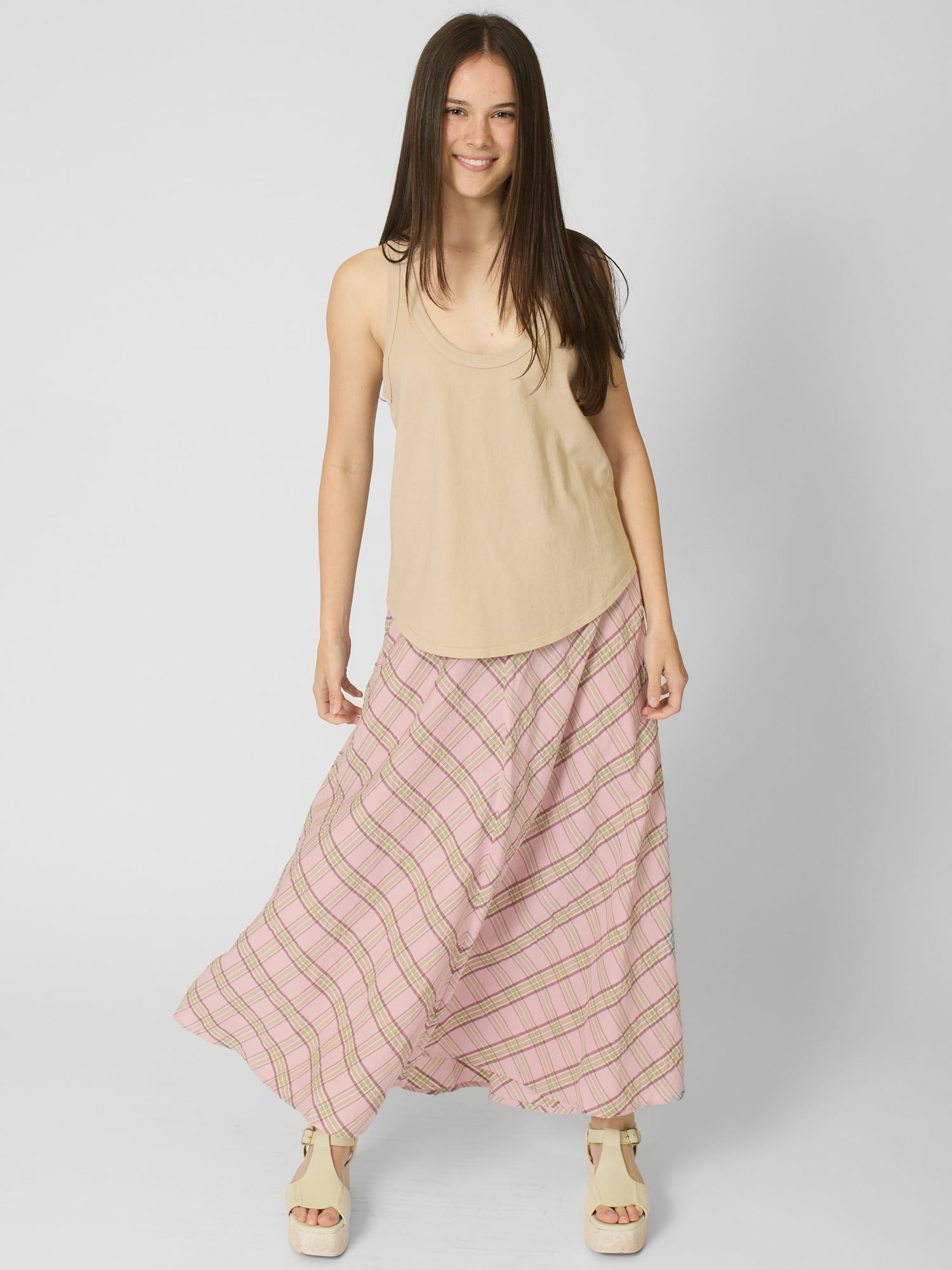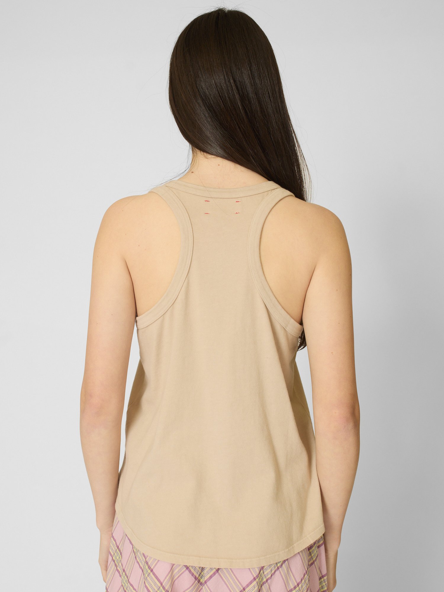 Ultra-soft cotton jersey racerback tank features wide self-binding around the neck and a curved high-low shirttail hem.