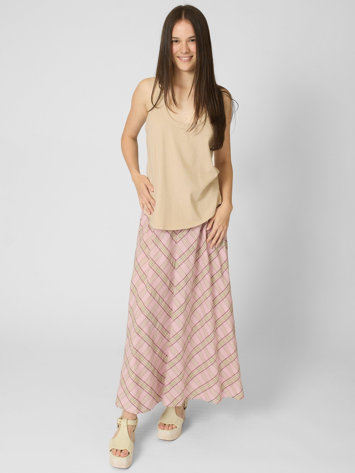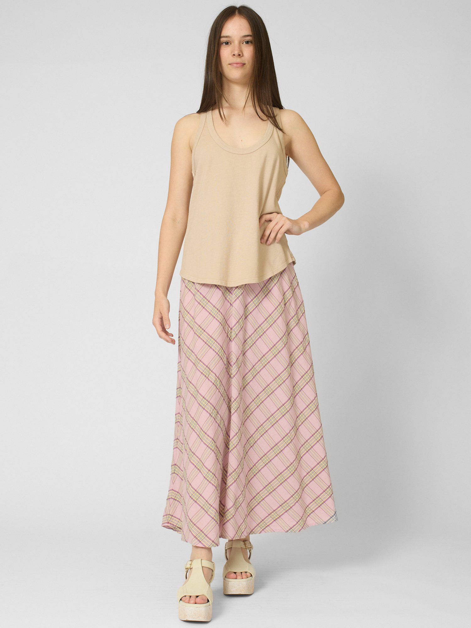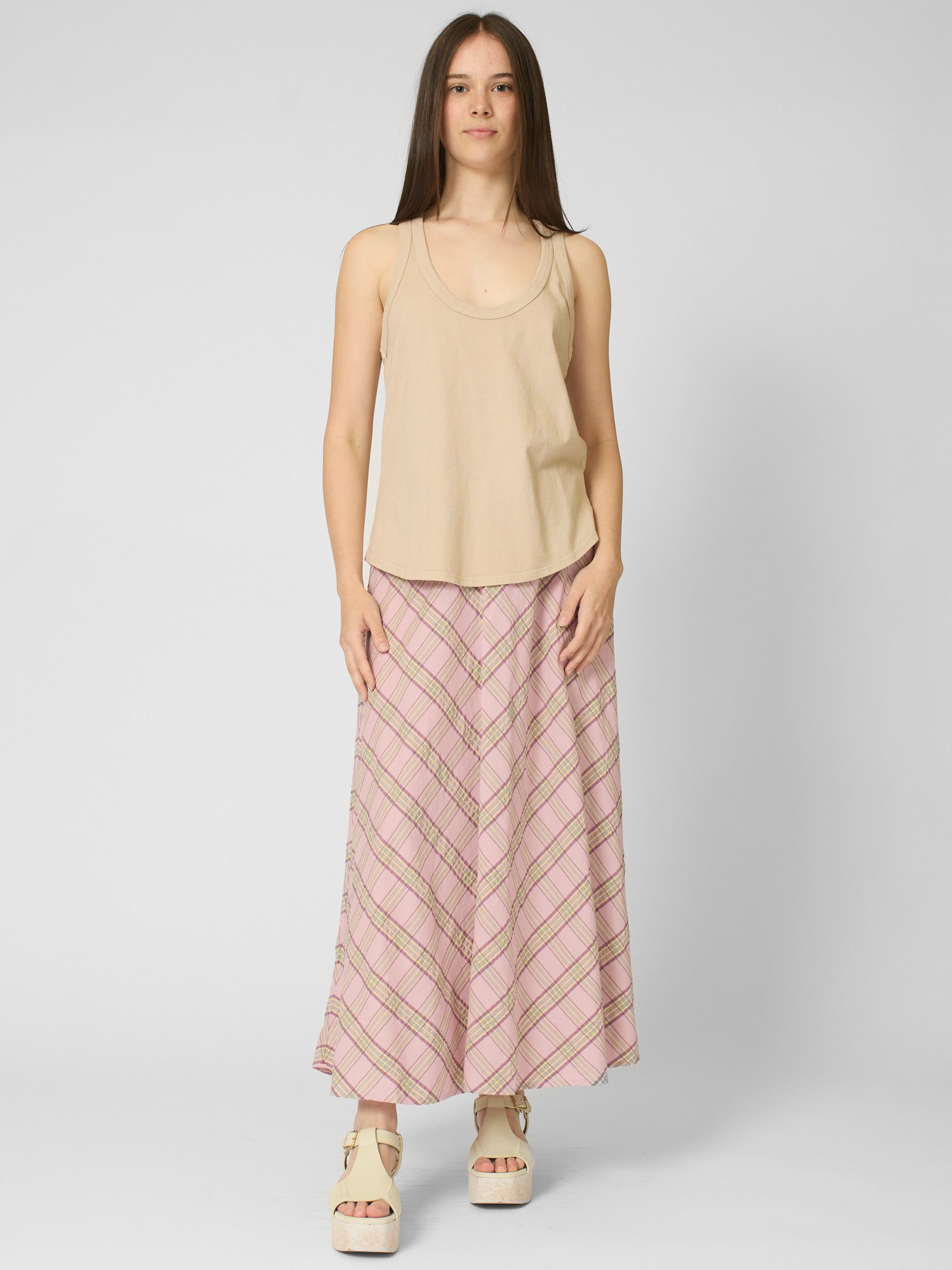 Ultra-soft cotton jersey racerback tank features wide self-binding around the neck and a curved high-low shirttail hem.