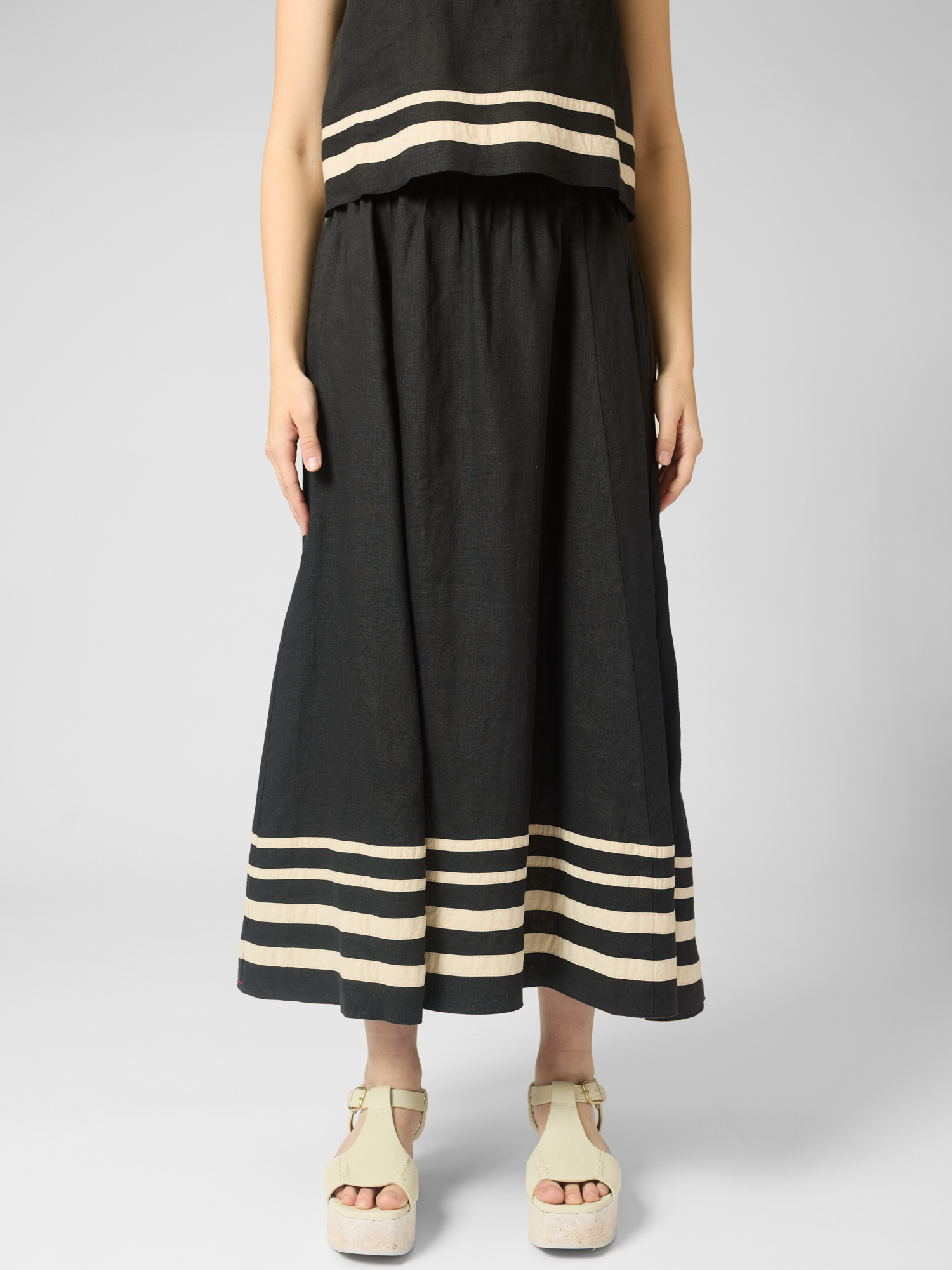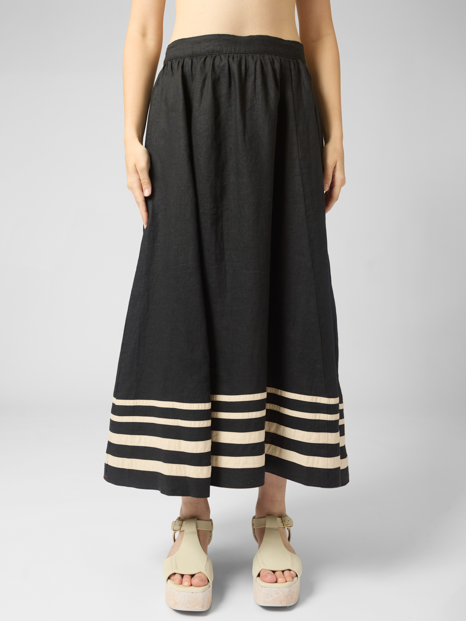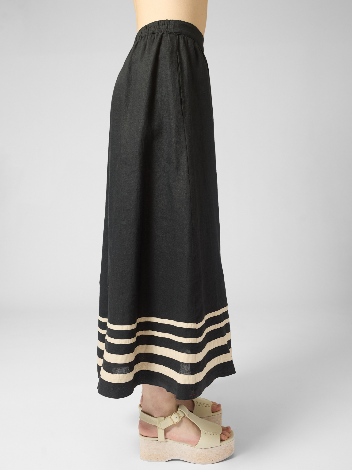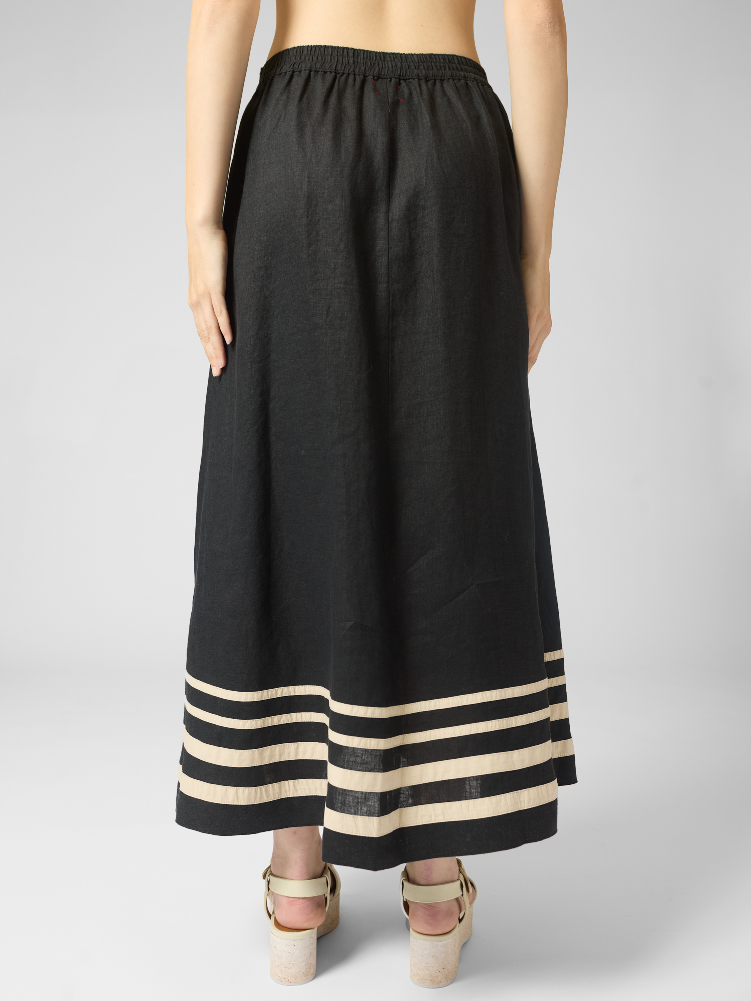 Lightweight linen skirt features a flat front, elasticized back waist, and contrast taping