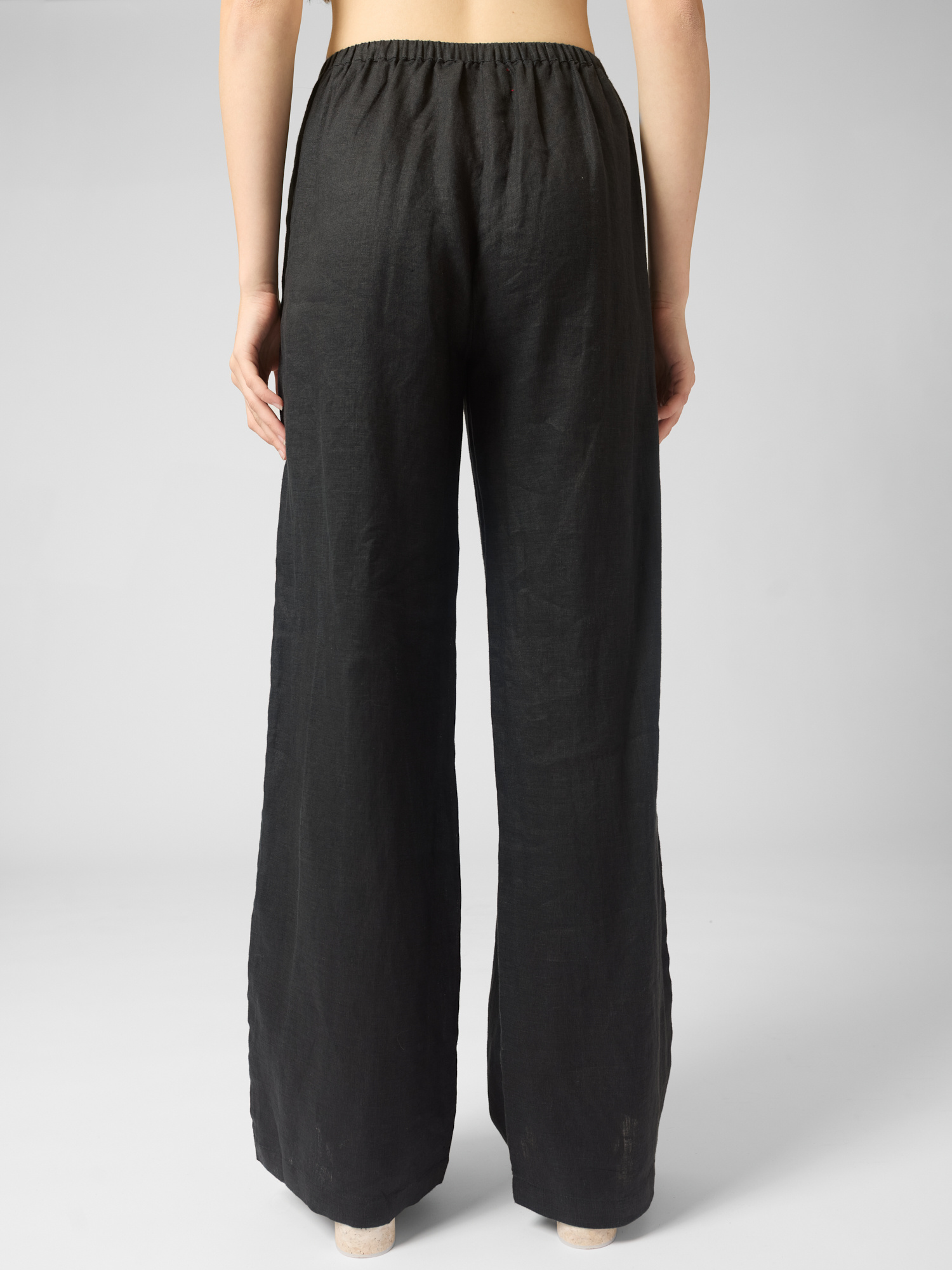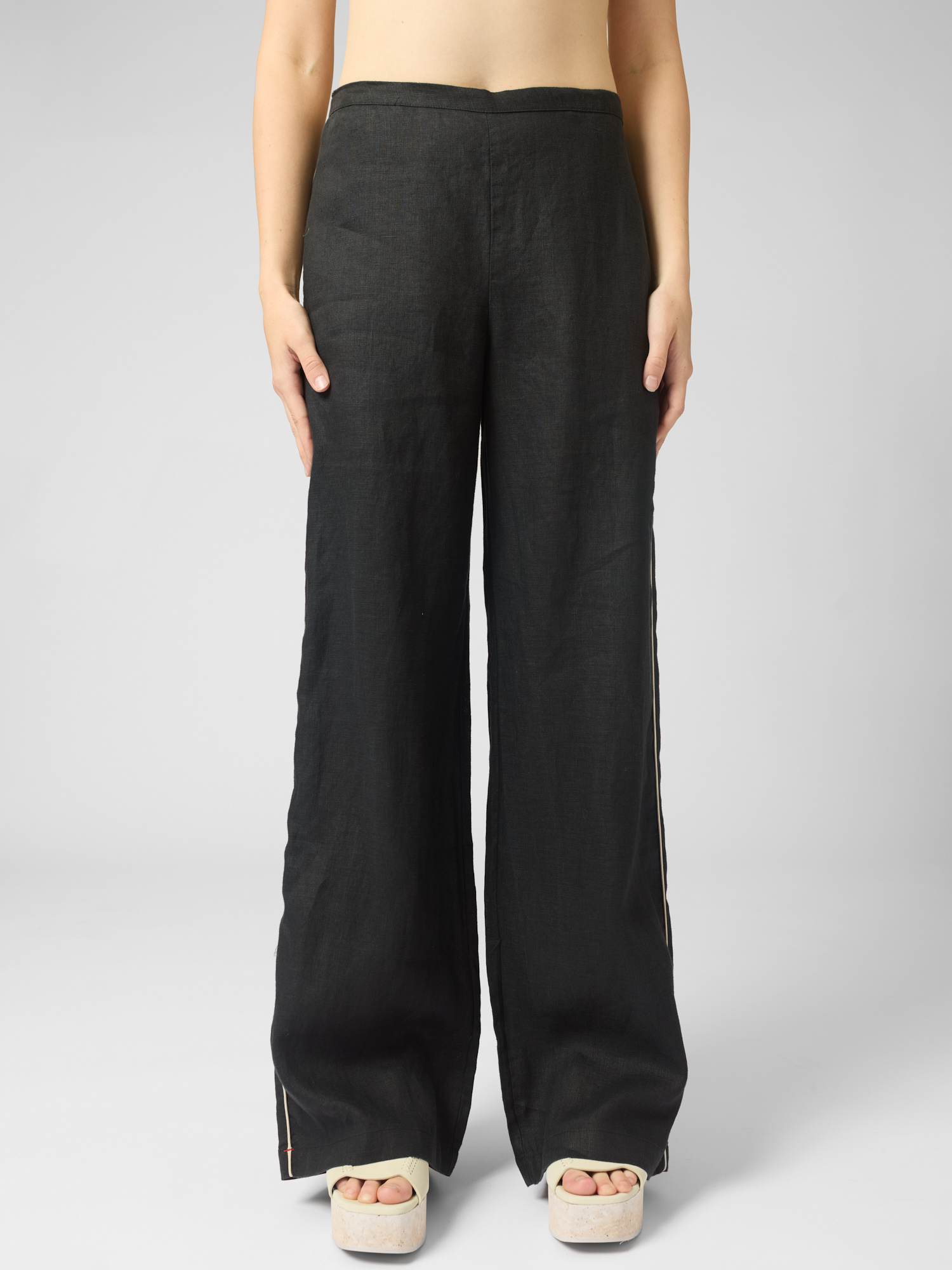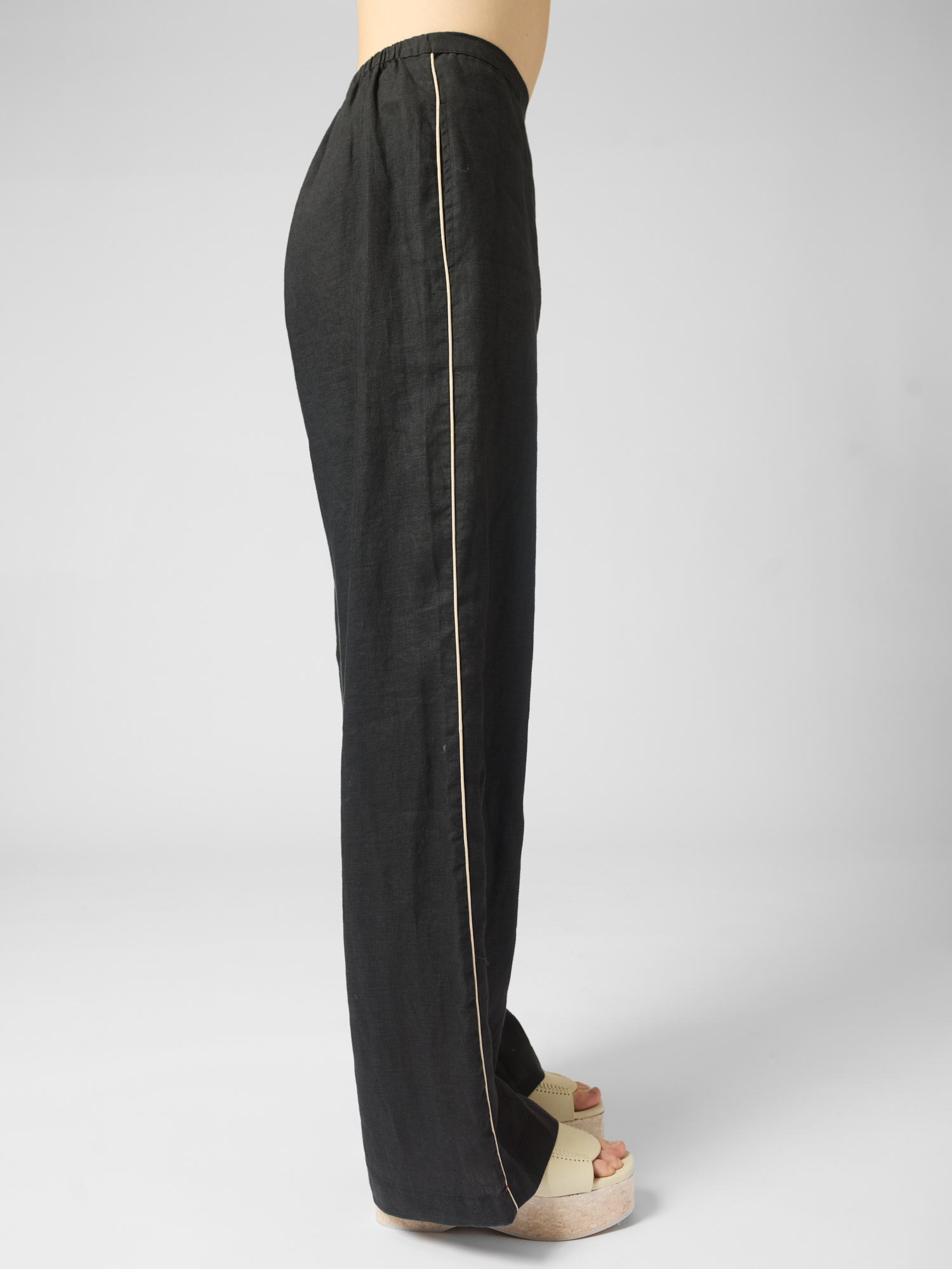 Lightweight linen pants feature a wide-leg design with an elasticized waist, side seam pockets, and contrast piping.