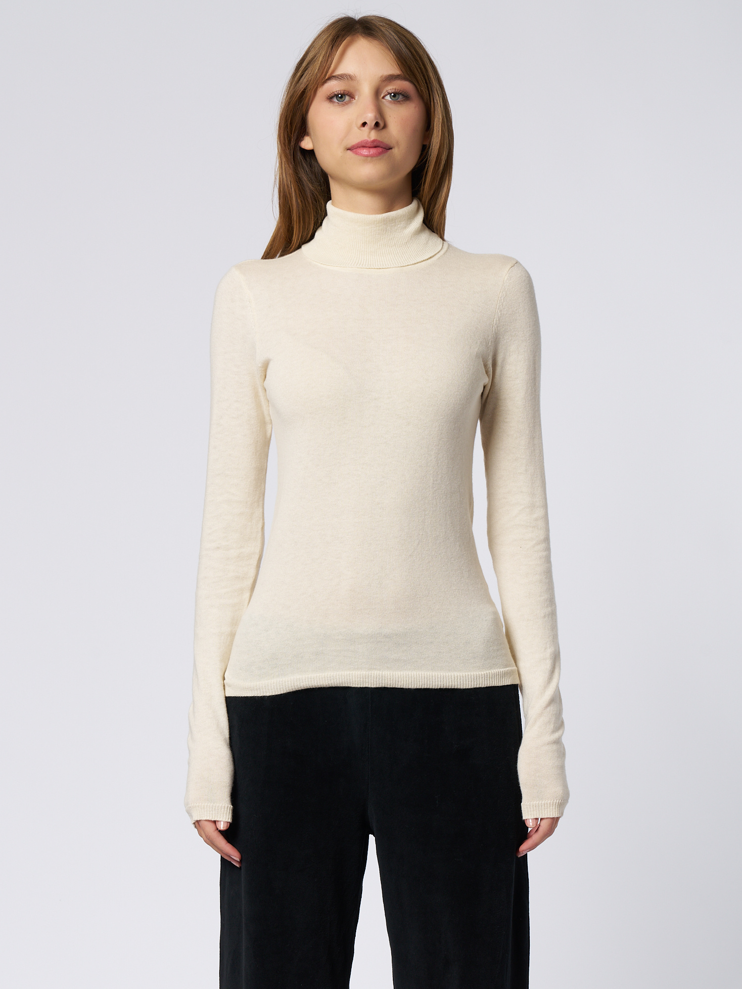 The cotton-cashmere blend pullover features a ribbed turtleneck, cuffs, and hem.