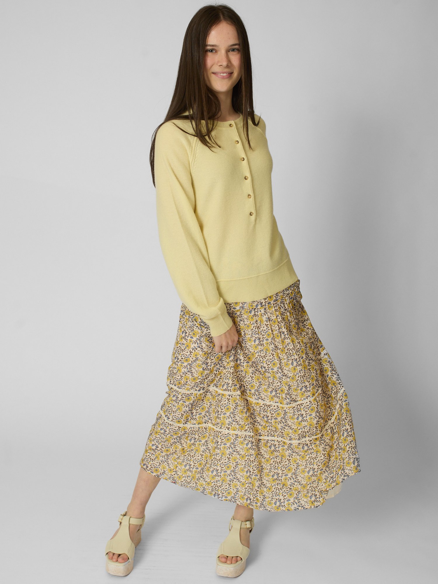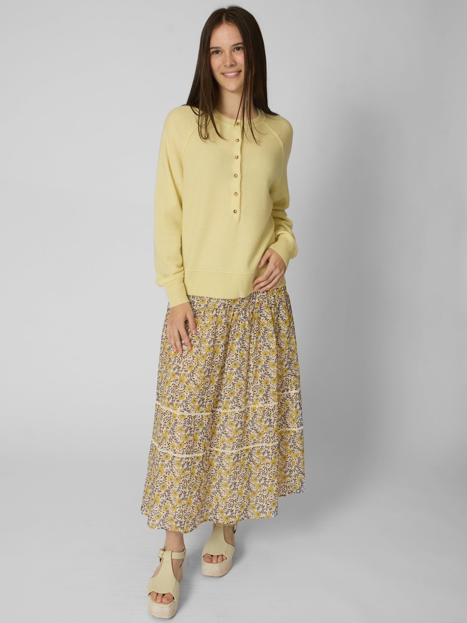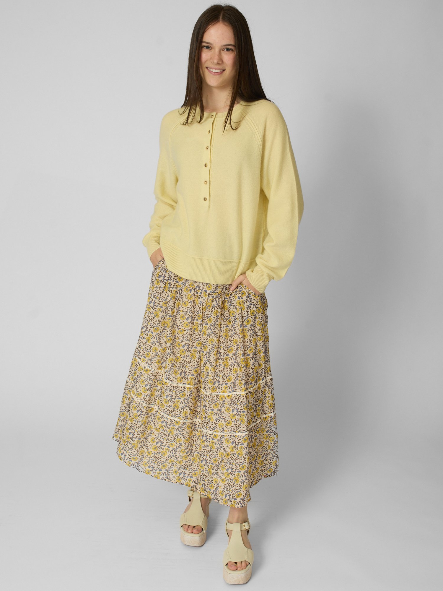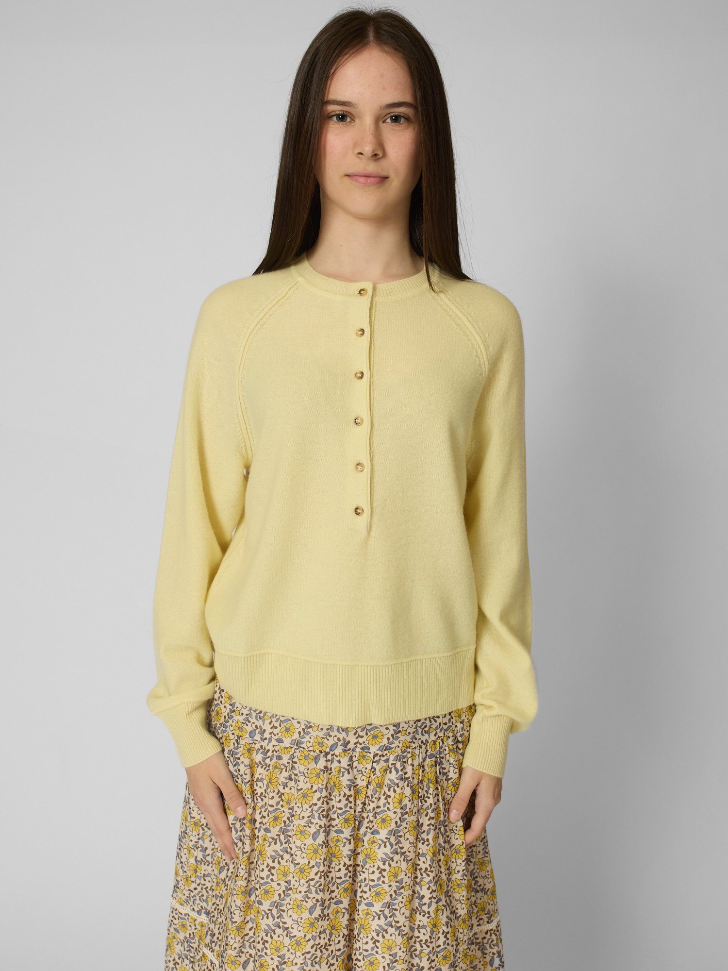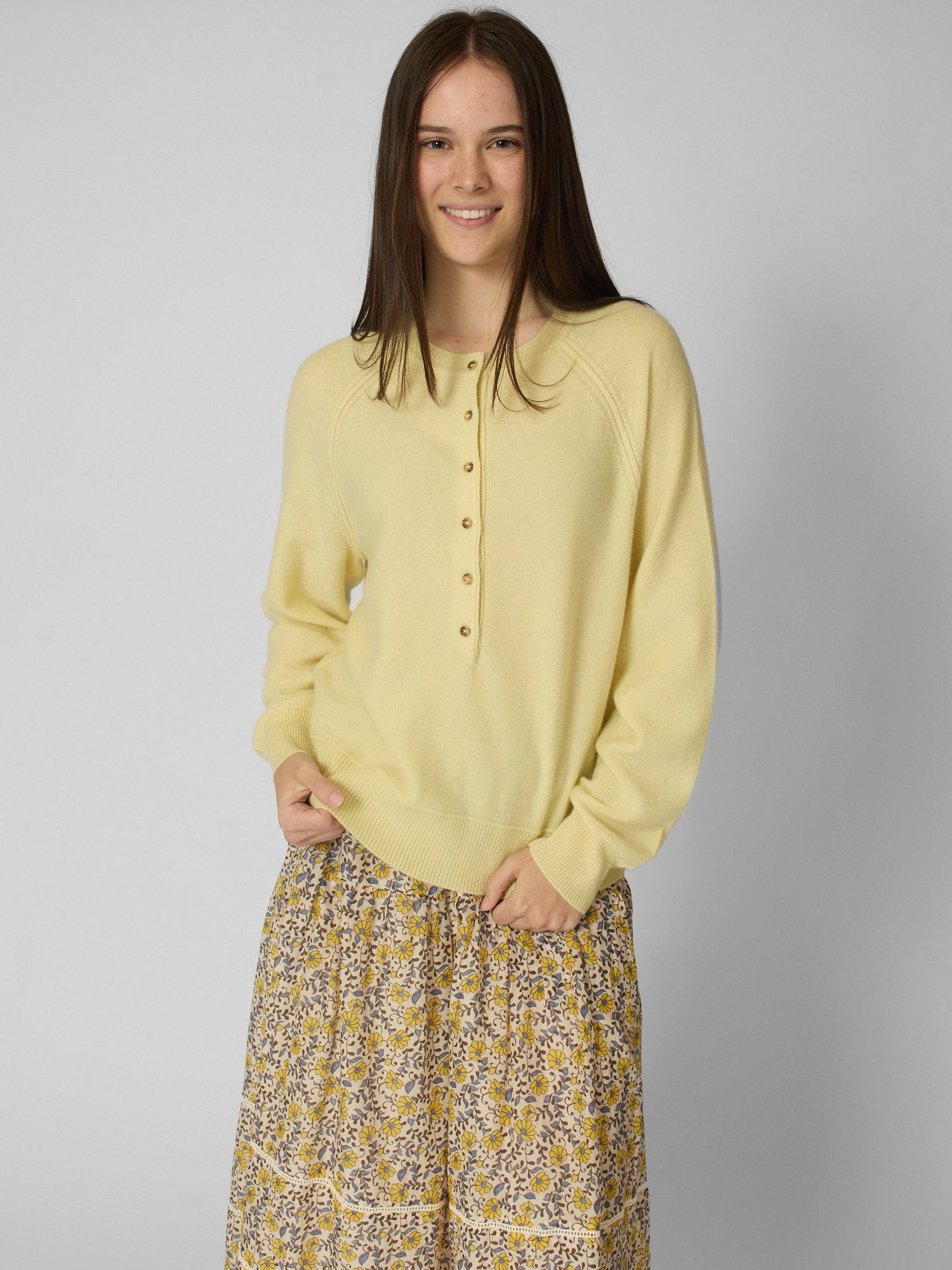 Very soft cashmere pullover features a henley button-front and ribbed trim at the neck, cuffs, pockets, and hem.