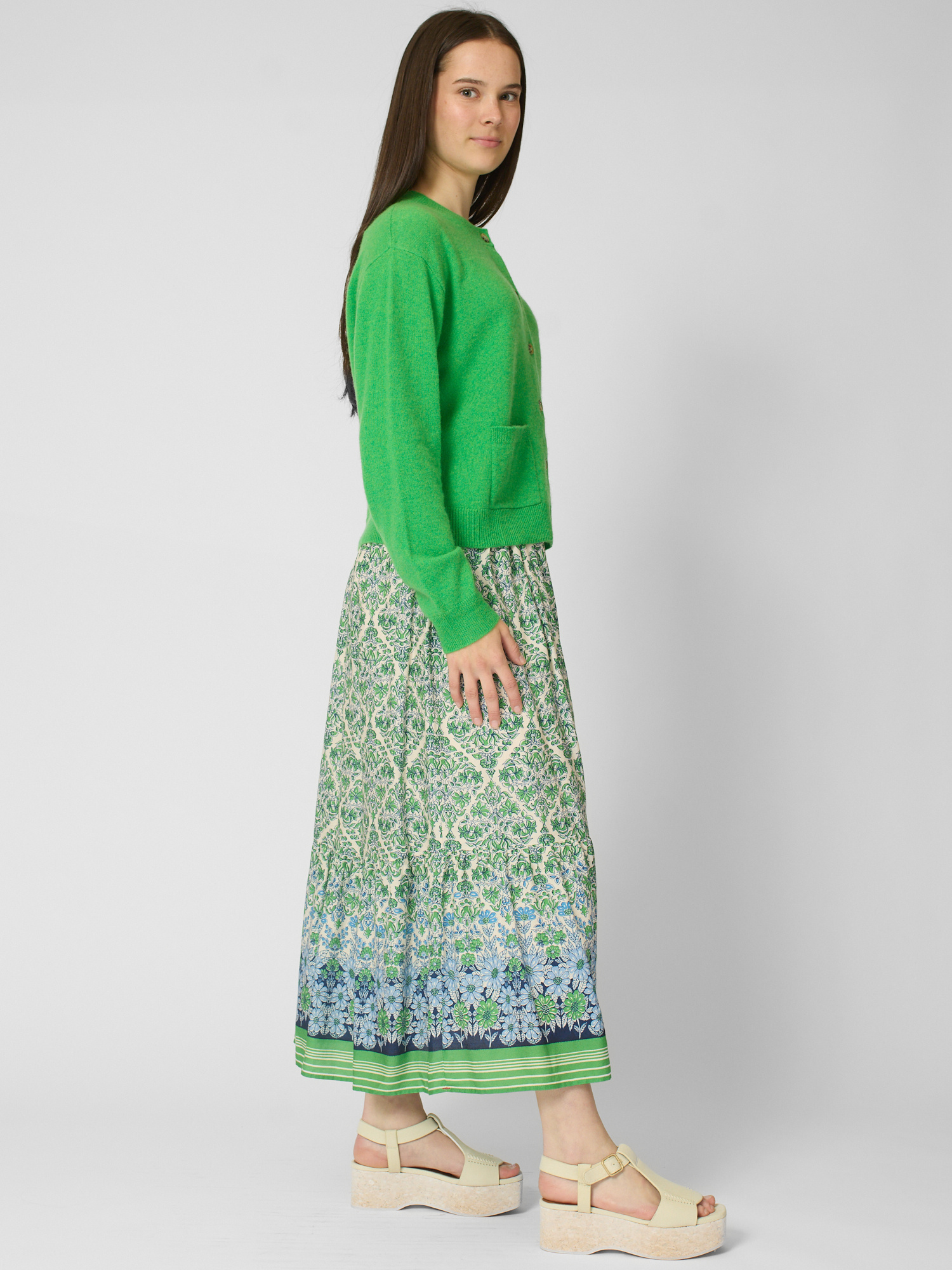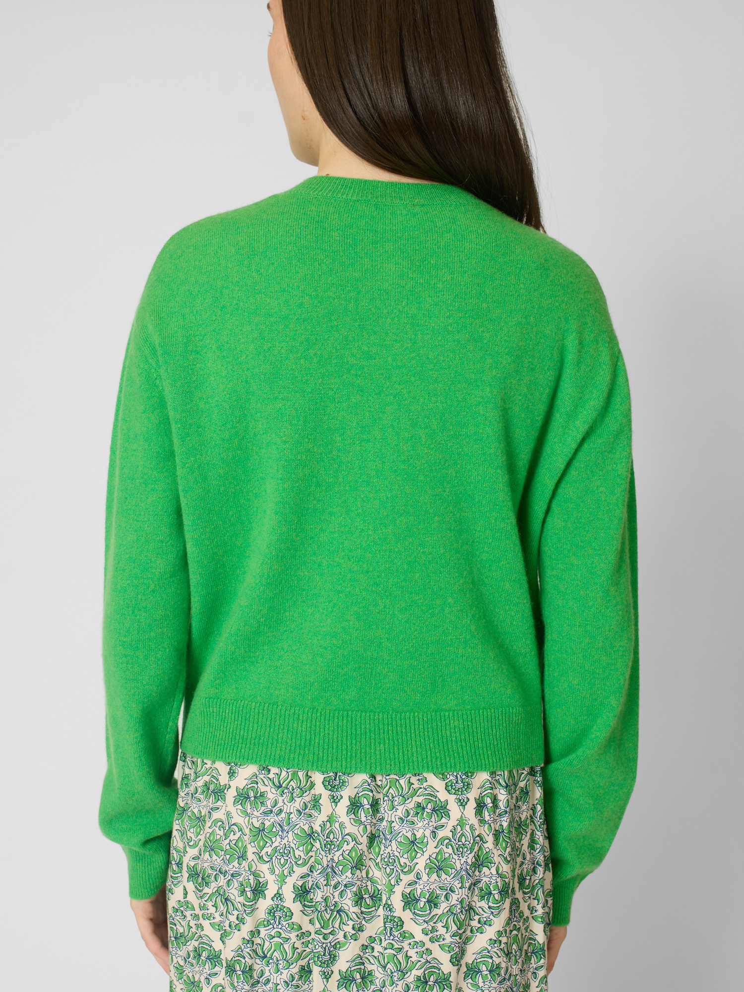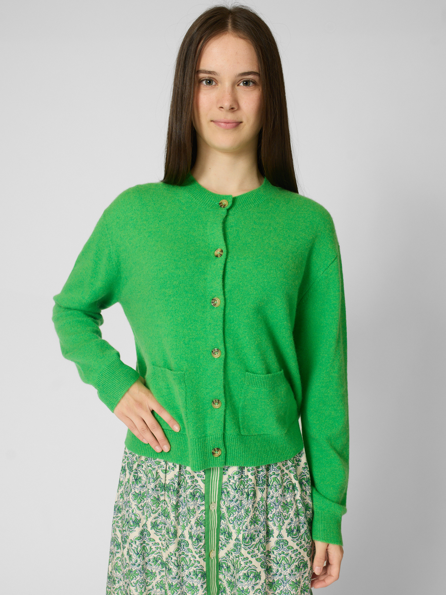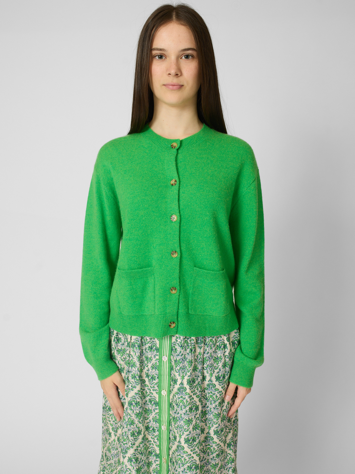 Ultra-soft cashmere cardigan sweater features a faux horn button-front and ribbed trim at the neck, cuffs, pockets, and hem.