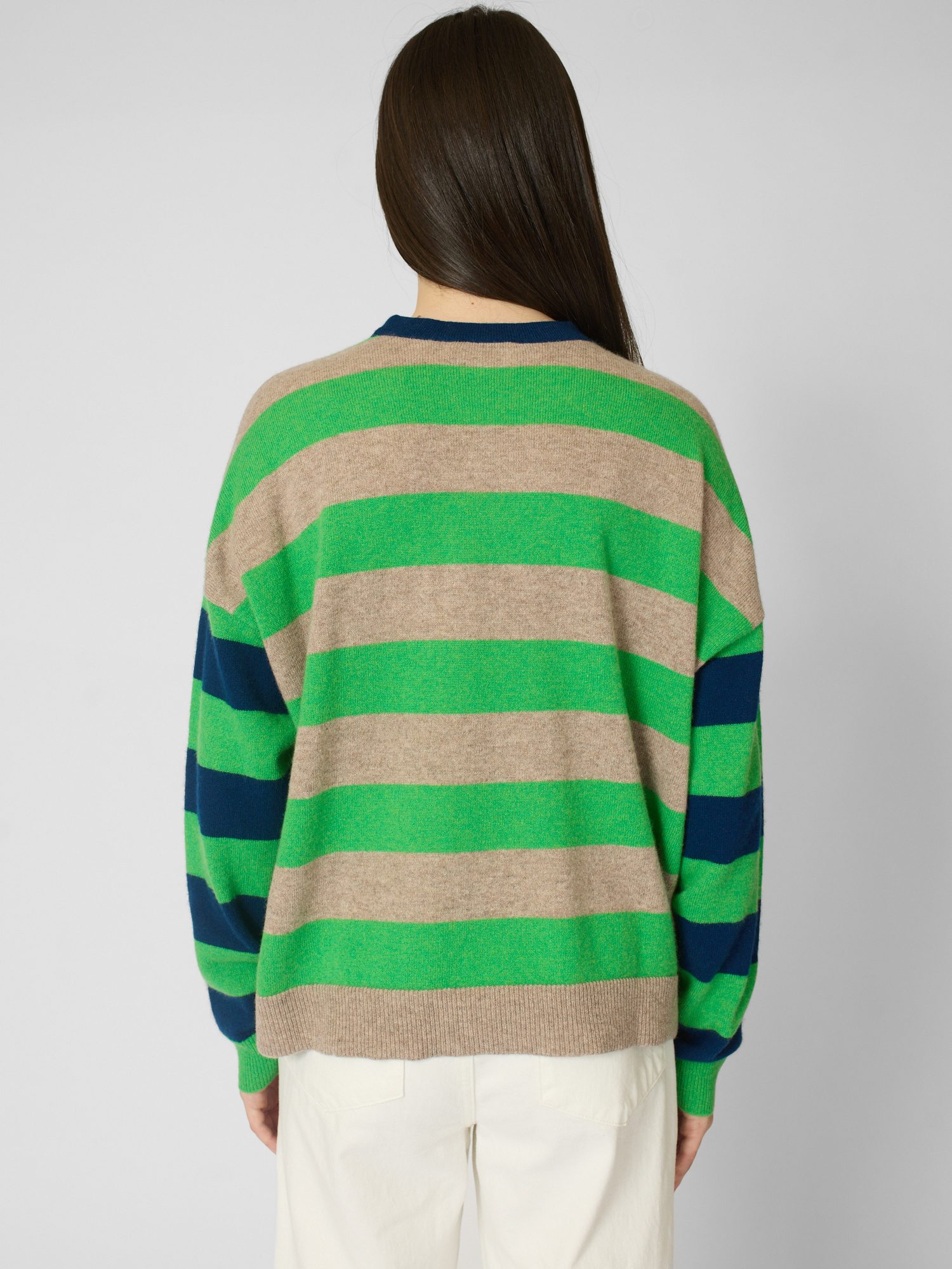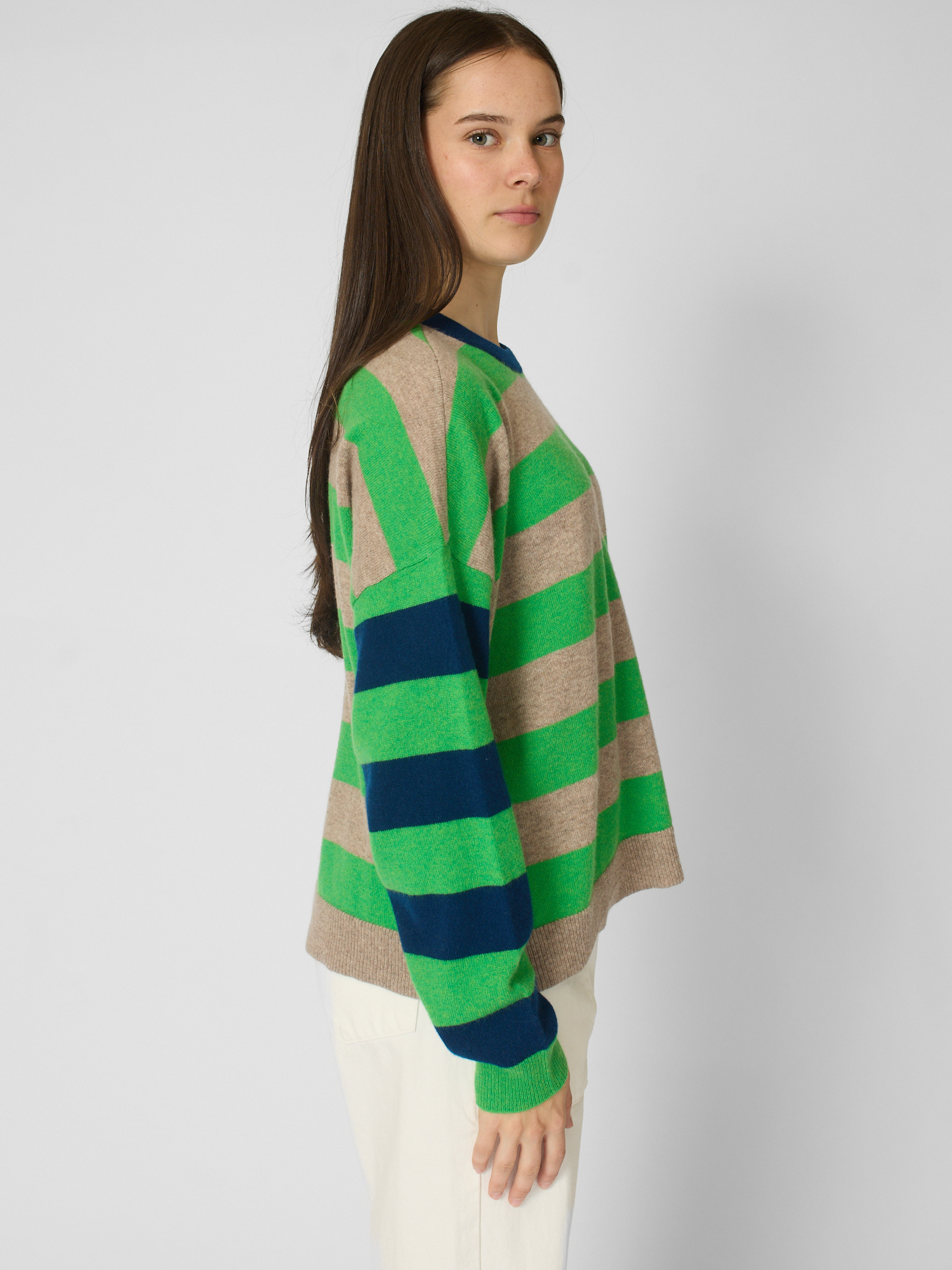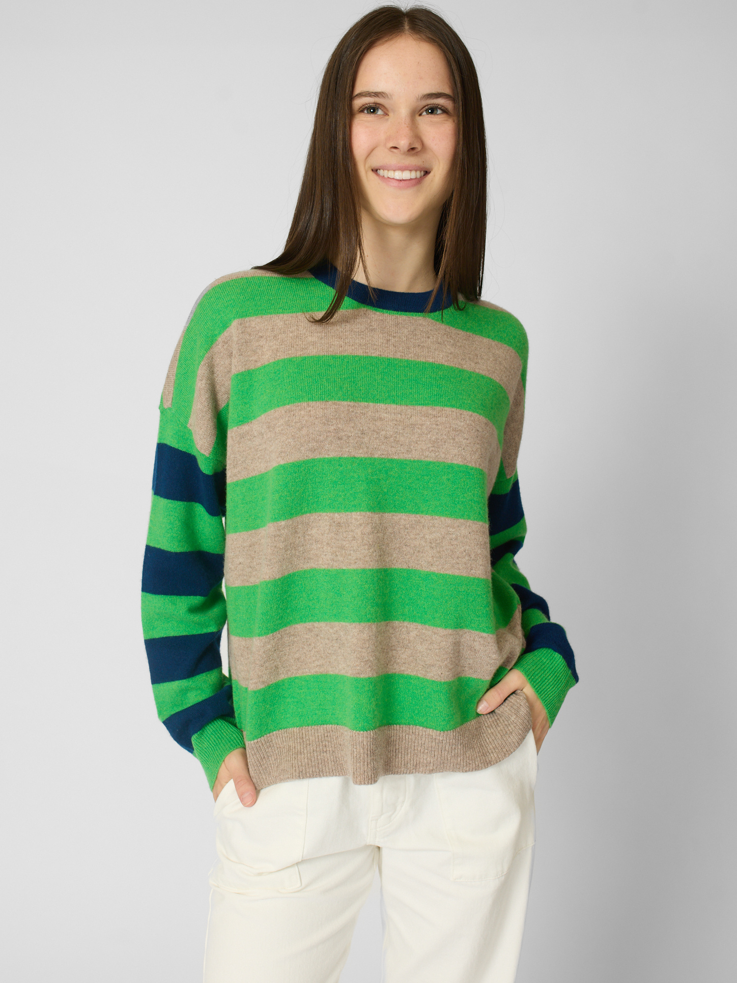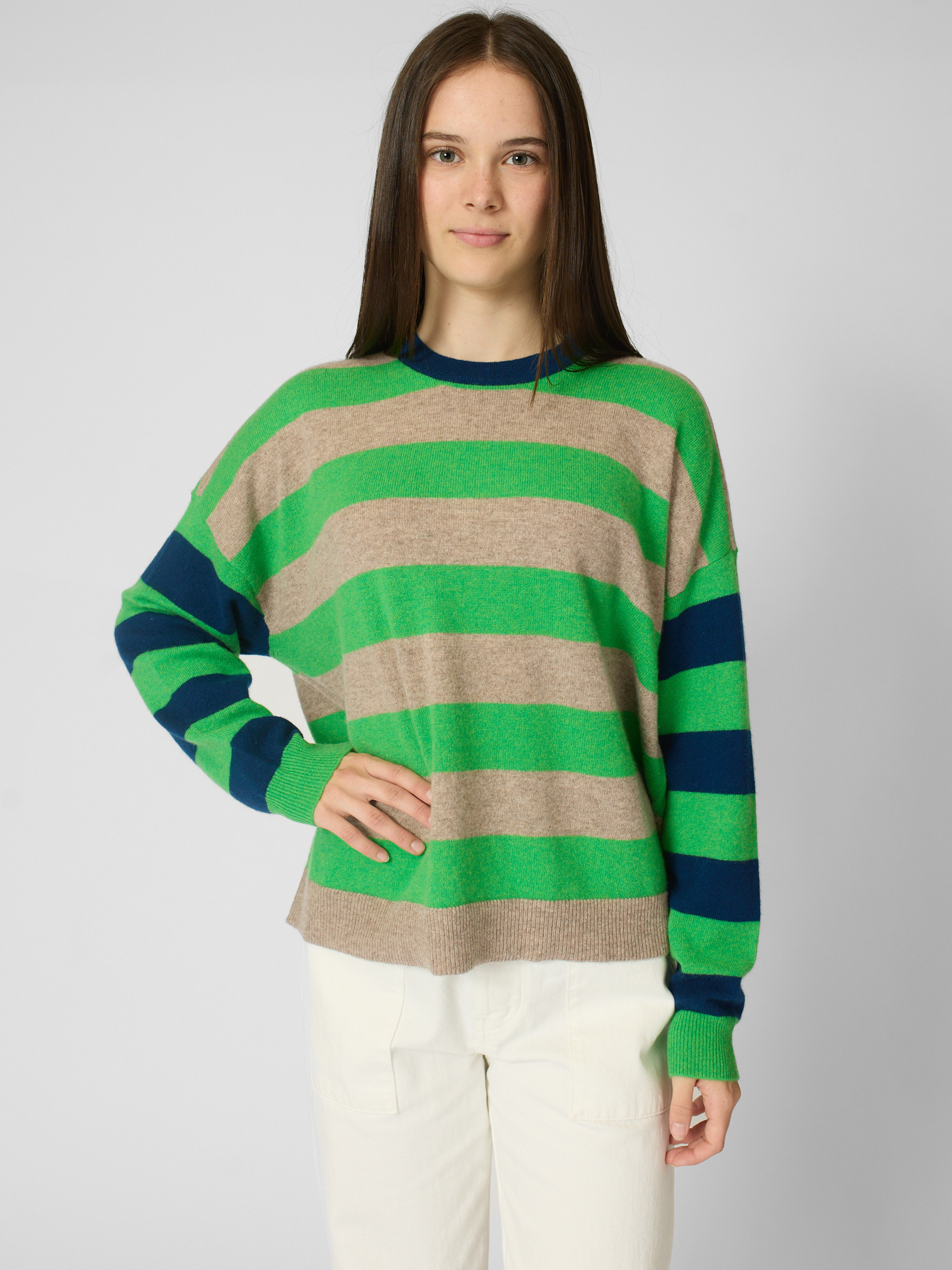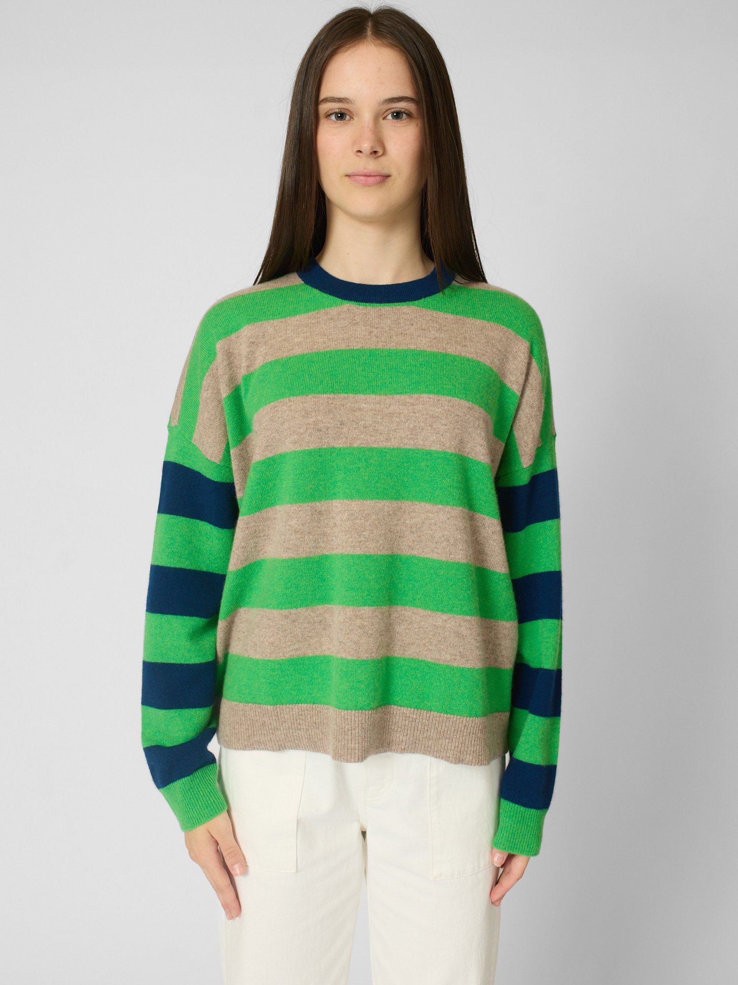Ultra-soft striped cashmere crewneck sweater features contrast color trim at the neck, contrast striped sleeves