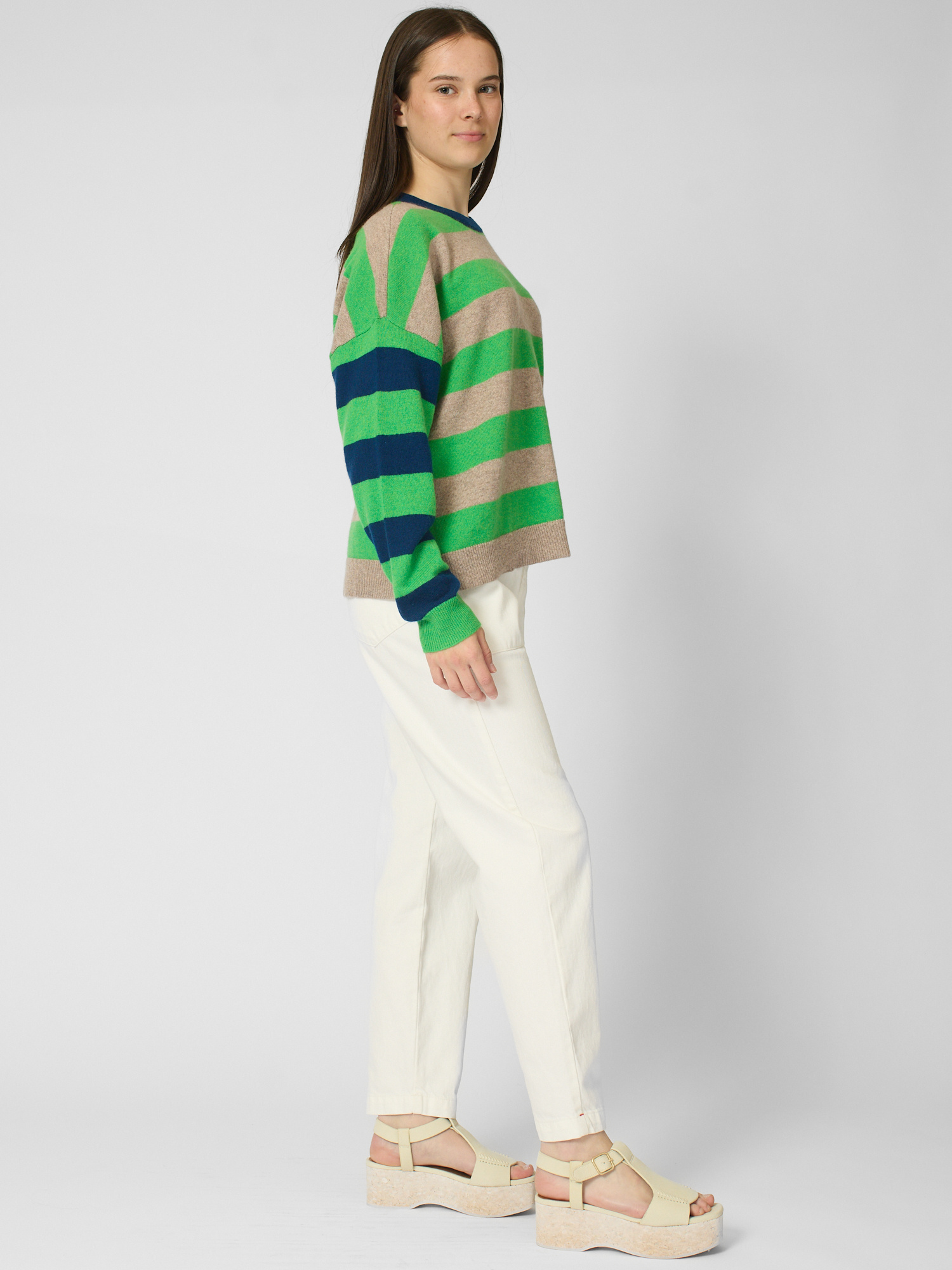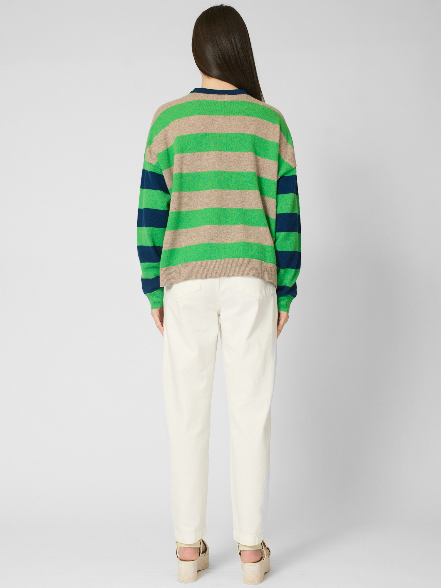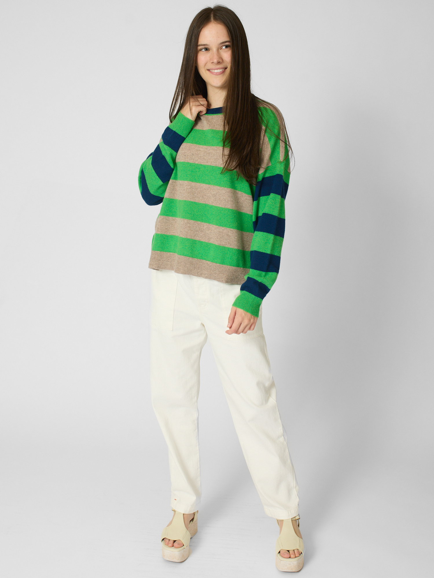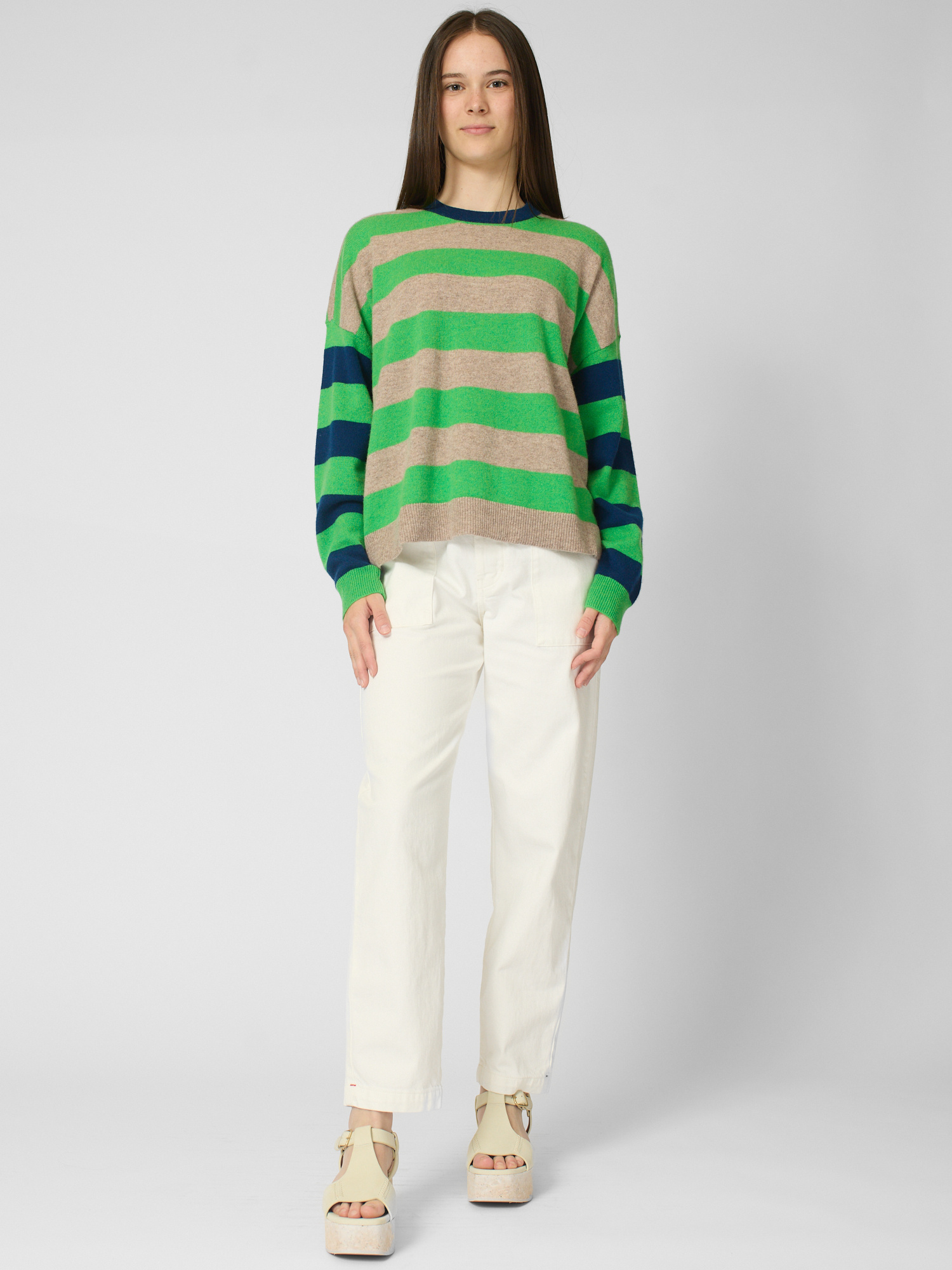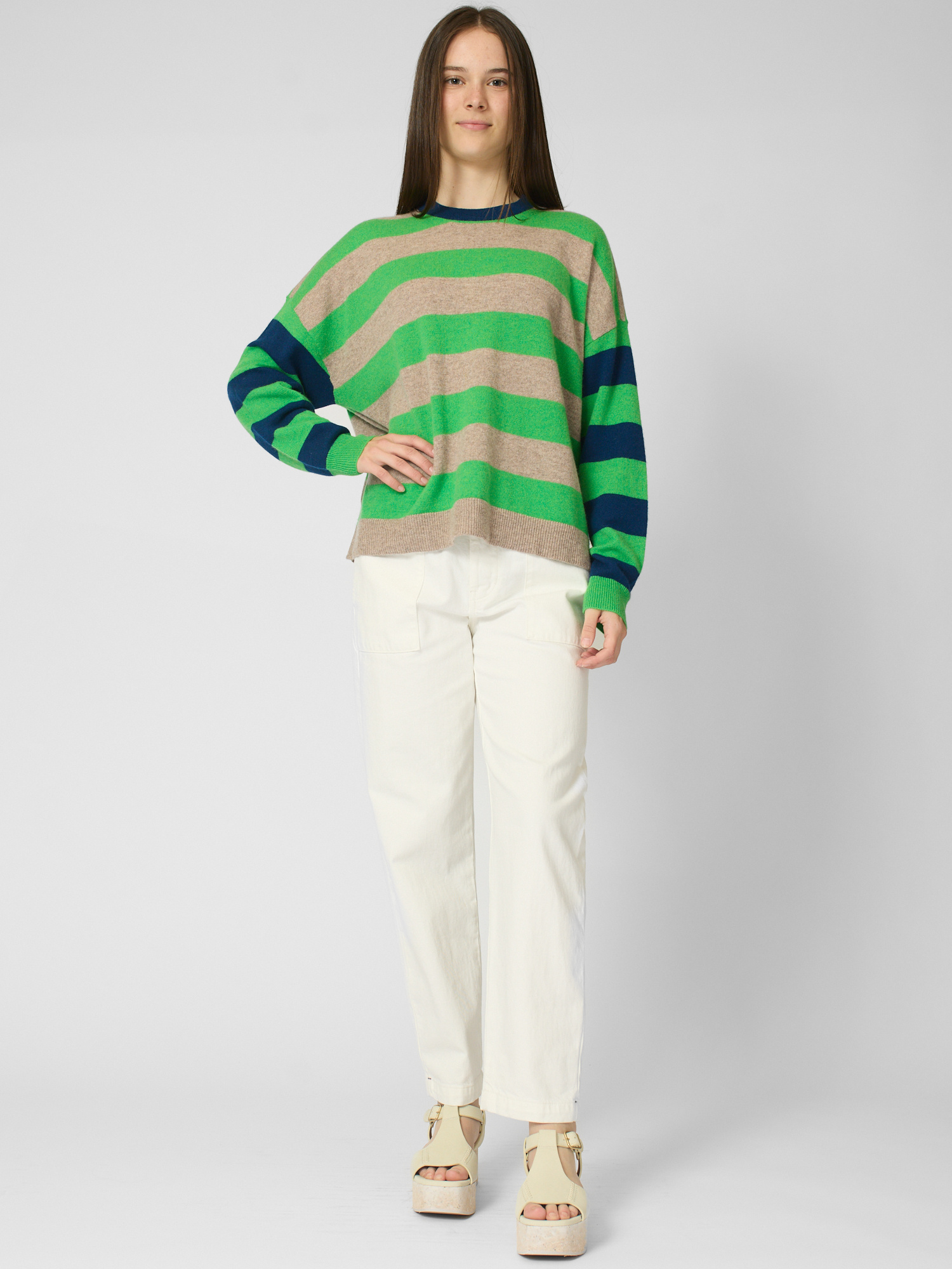 Ultra-soft striped cashmere crewneck sweater features contrast color trim at the neck, contrast striped sleeves